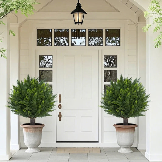 Set of 2 18" Artificial Cedar Topiary Ball Trees with Ground Spike, Indoor Outdoor Fake Shrubs Plants - Green