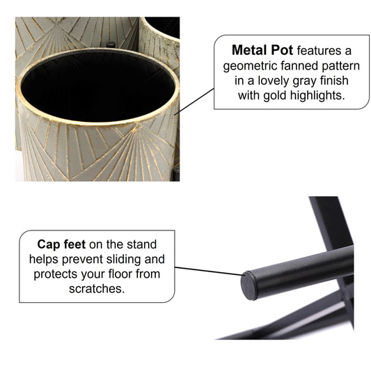 Grey and Gold Metal Cachepot Planters with Black Stand (Set of 3)