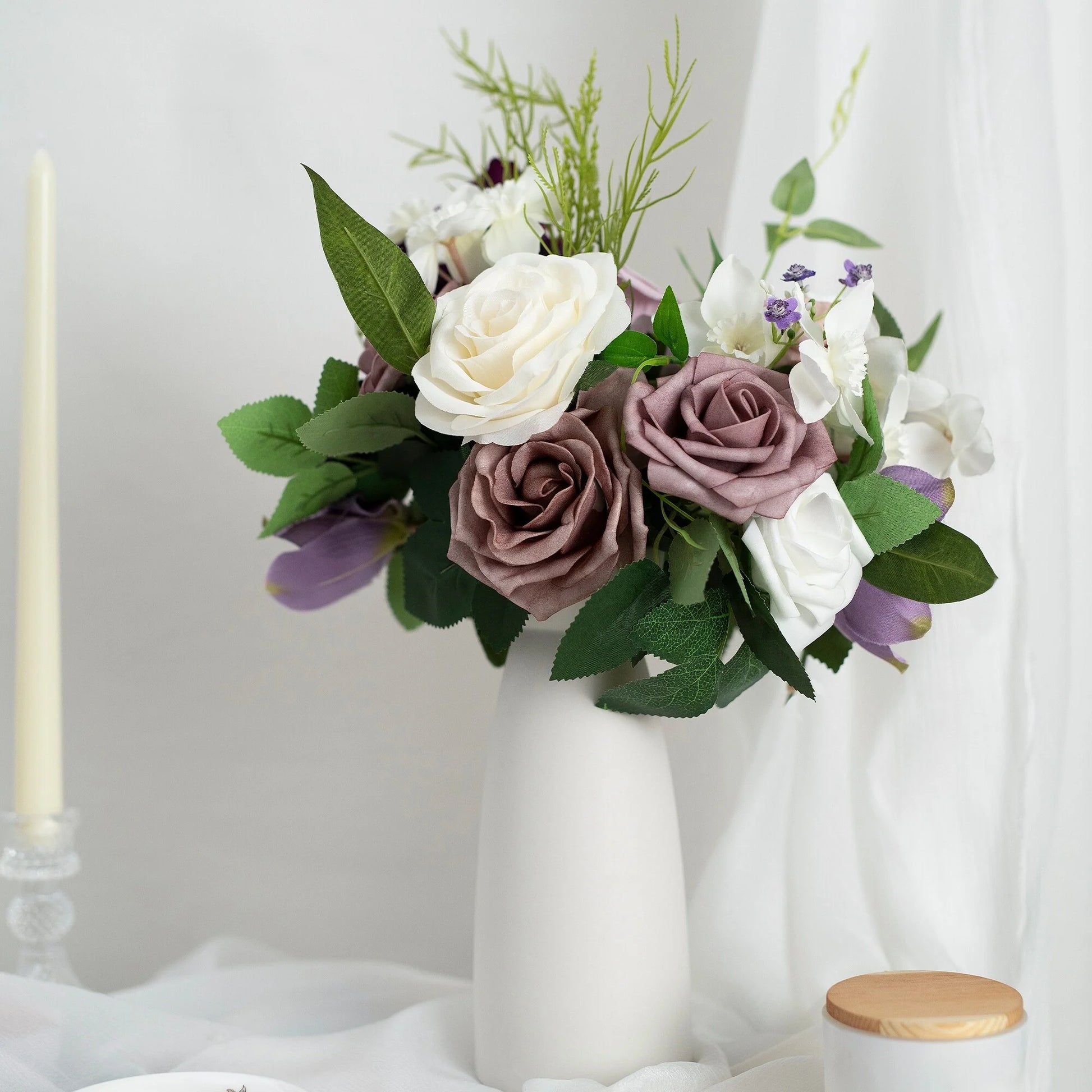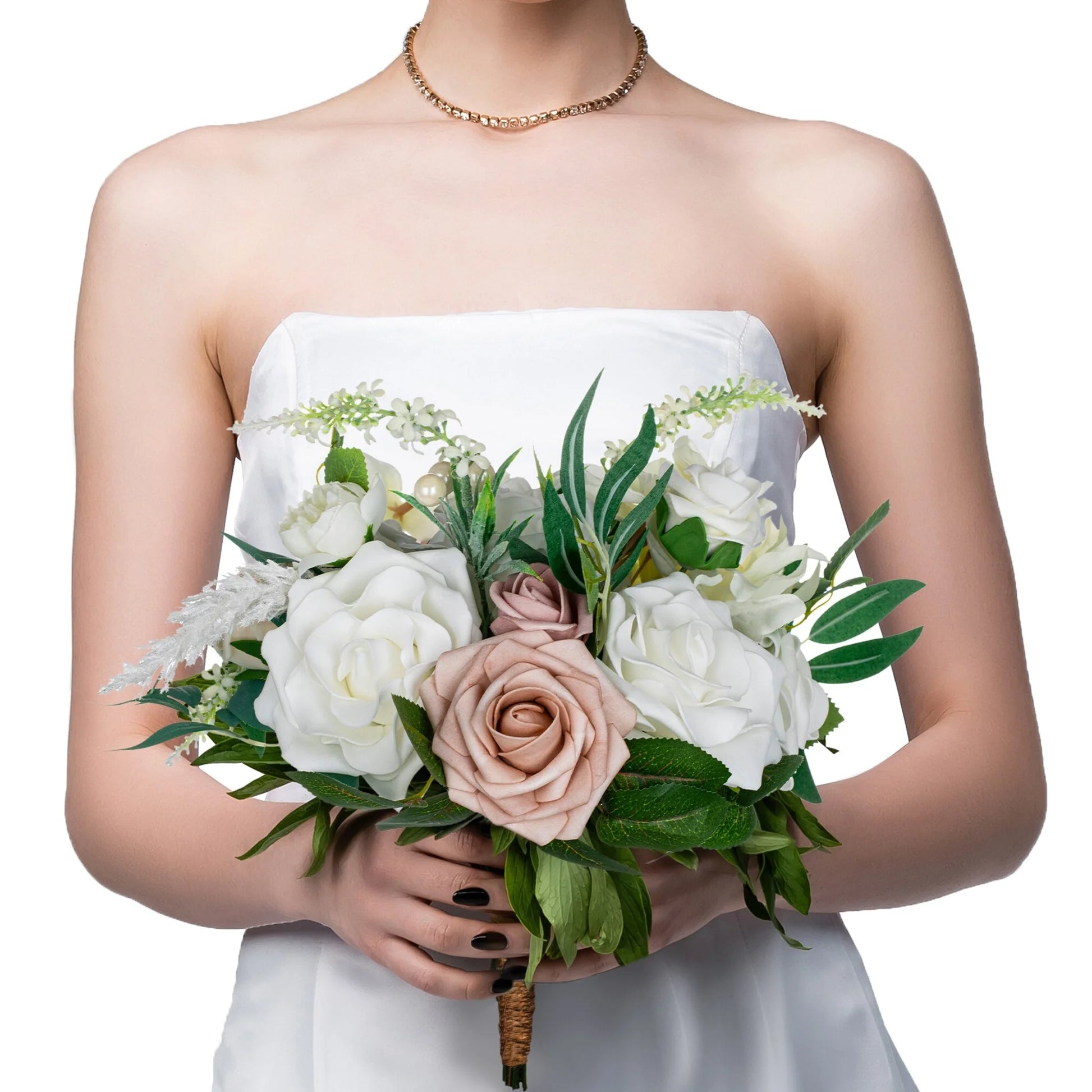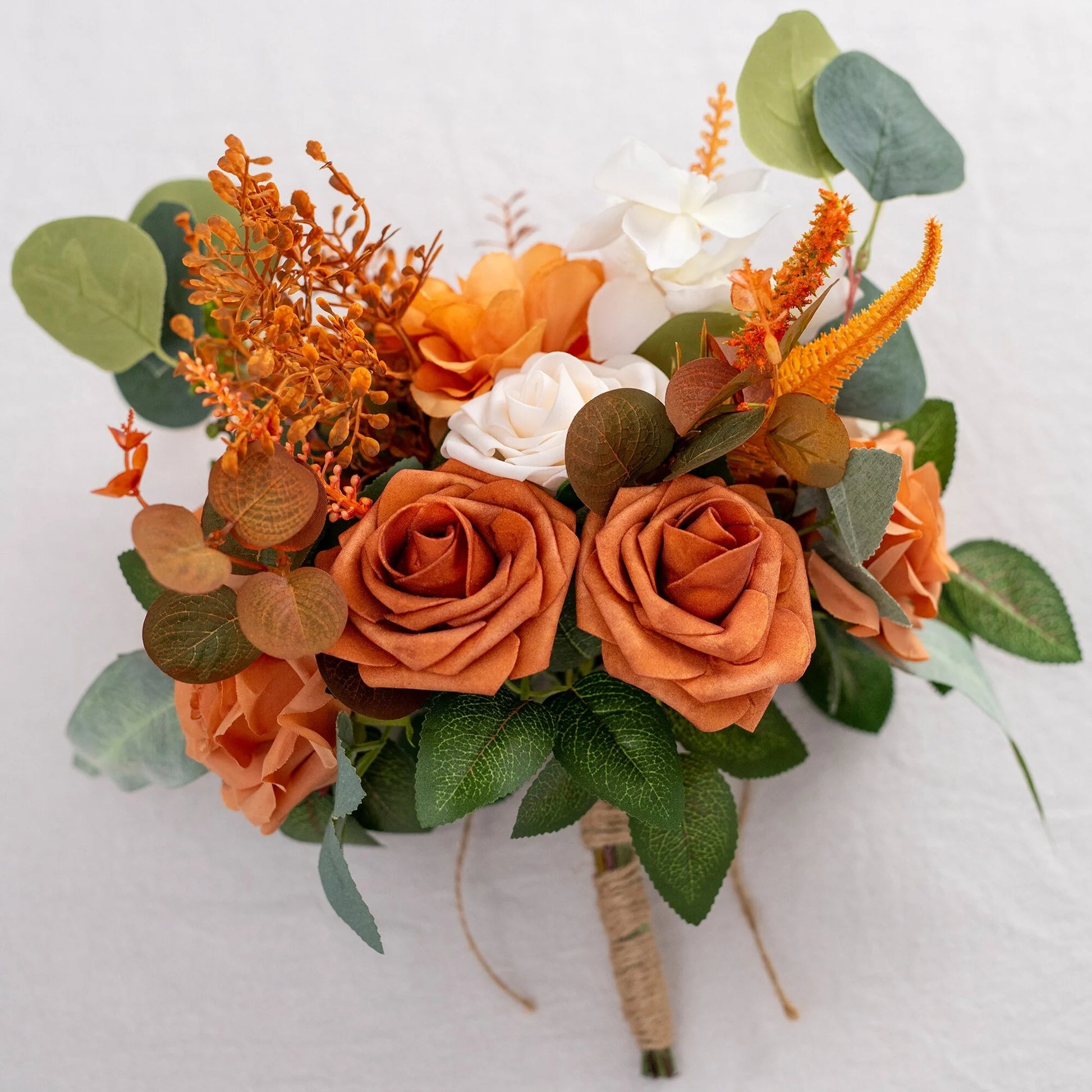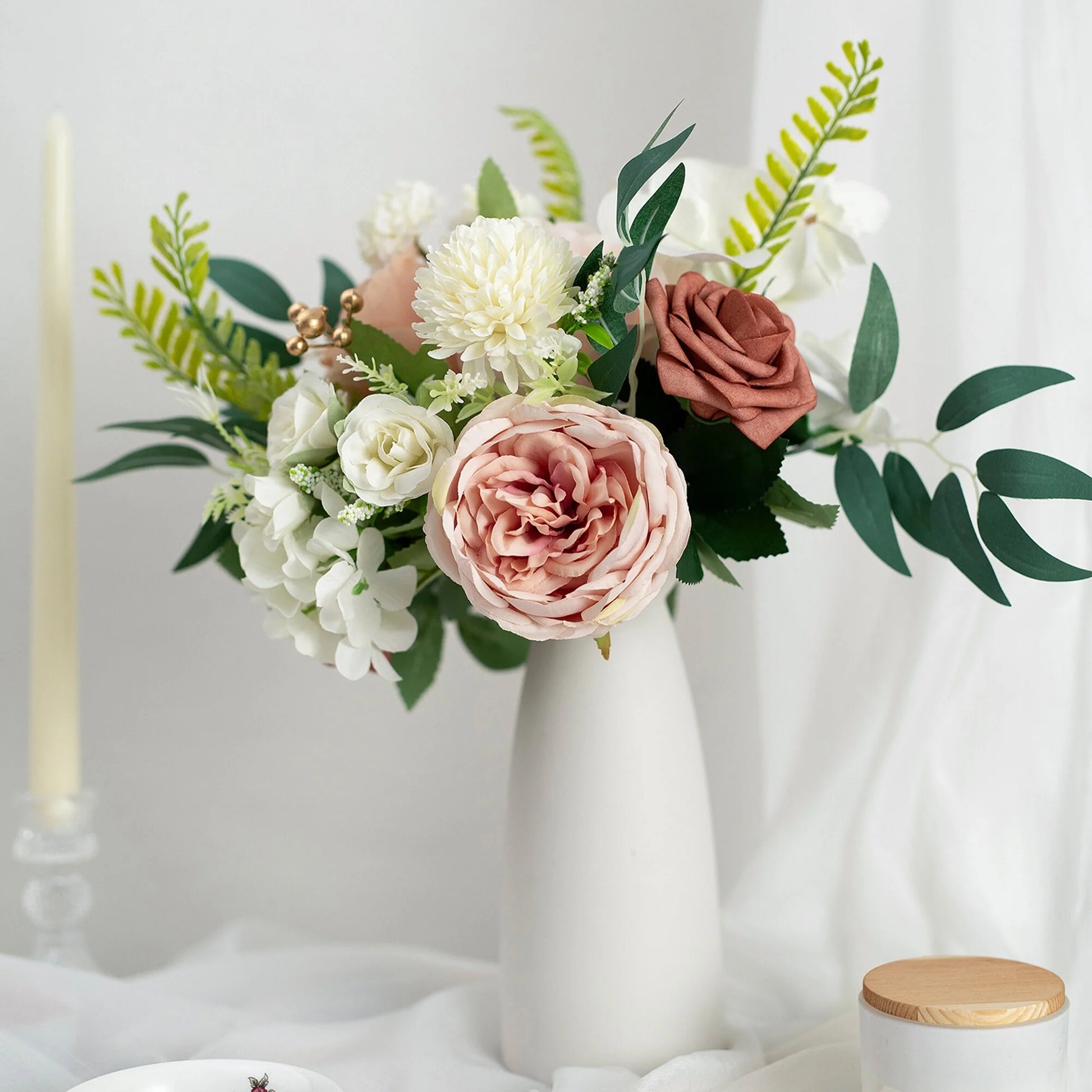This bouquet is expertly designed using highly realistic foam/silk flowers and lush botanicals, meticulously capturing nature's intricate textures and vibrant hues. Each stem is hand-shaped to emulate the graceful curves and layered elegance of fresh blooms, seamlessly blended with diverse floral varieties and richly textured foliage. Together, they form a timeless botanical masterpiece, ideal for weddings, celebrations, or elevating everyday spaces with enduring, maintenance-free sophistication.
