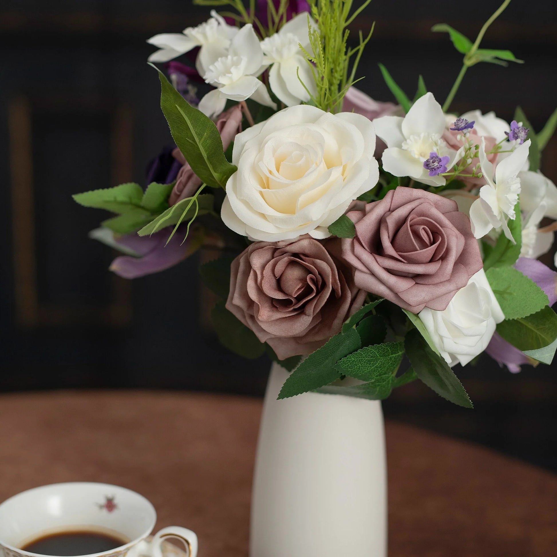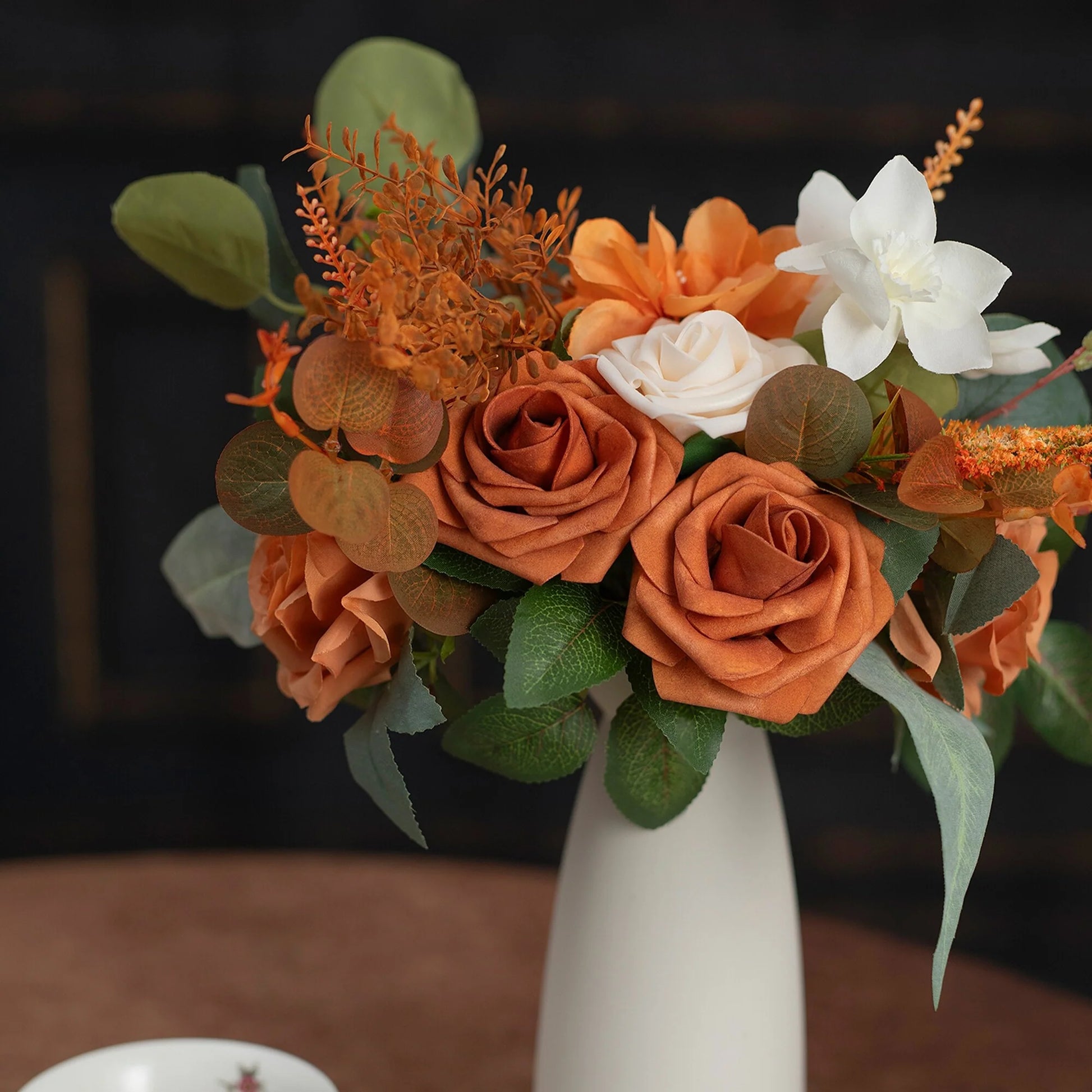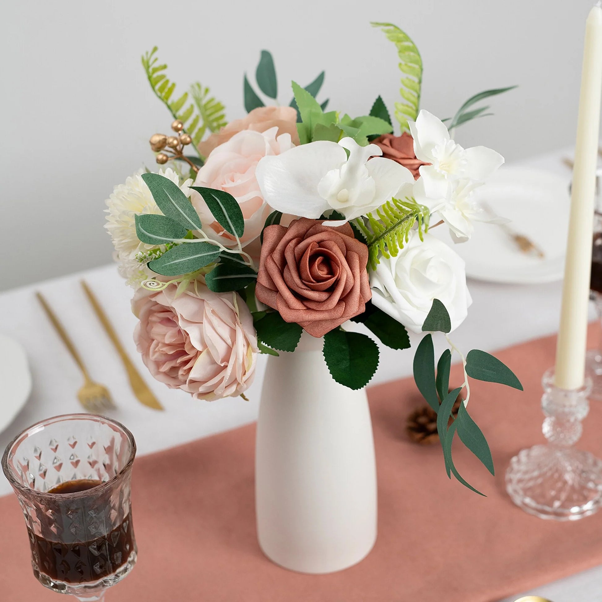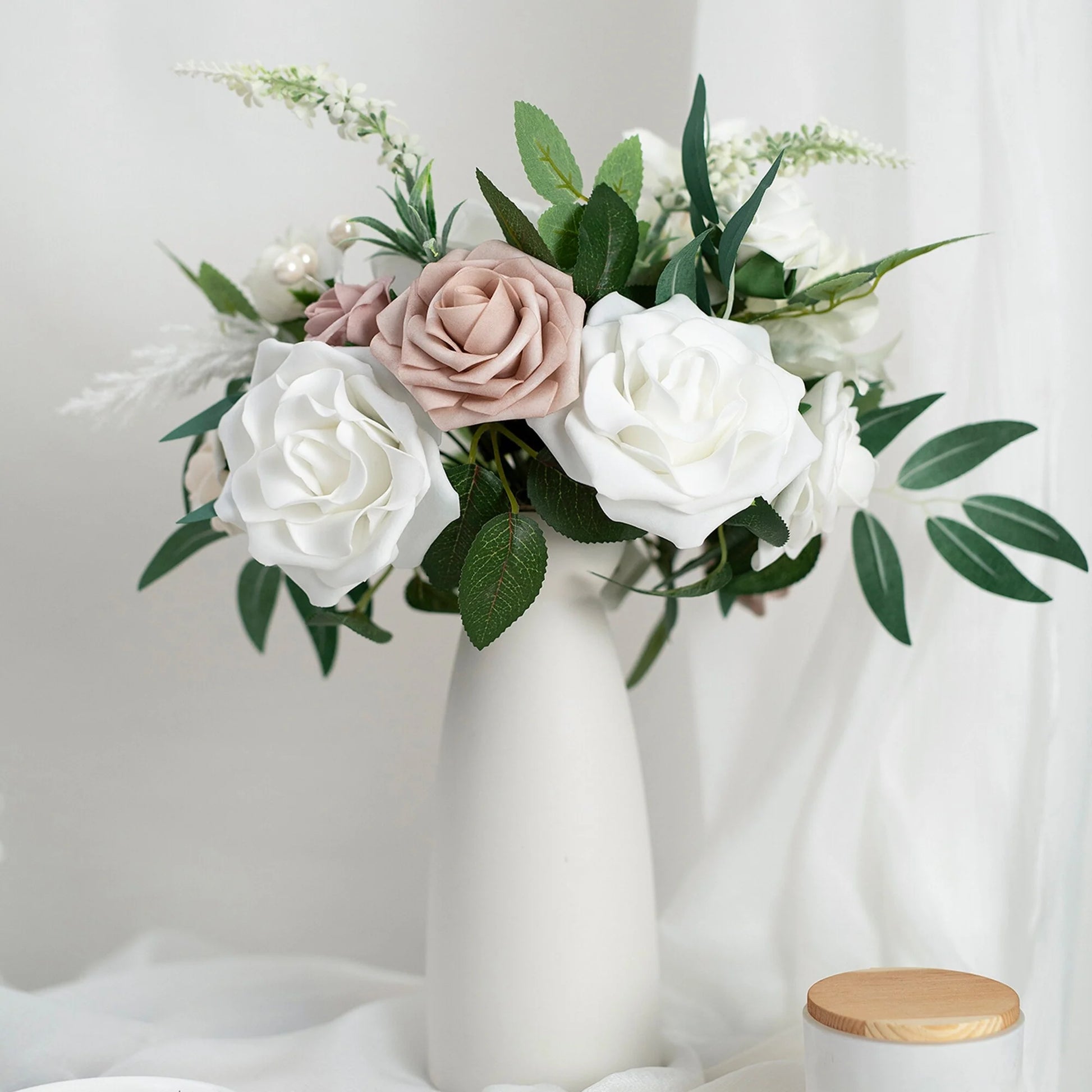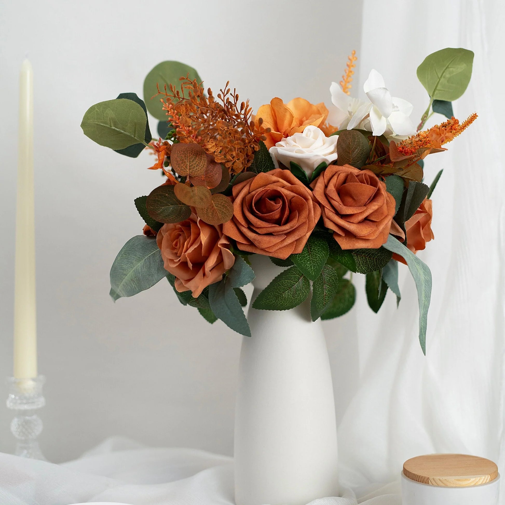 This bouquet is expertly designed using highly realistic foam/silk flowers and lush botanicals, meticulously capturing nature's intricate textures and vibrant hues. Each stem is hand-shaped to emulate the graceful curves and layered elegance of fresh blooms, seamlessly blended with diverse floral varieties and richly textured foliage. Together, they form a timeless botanical masterpiece, ideal for weddings, celebrations, or elevating everyday spaces with enduring, maintenance-free sophistication.