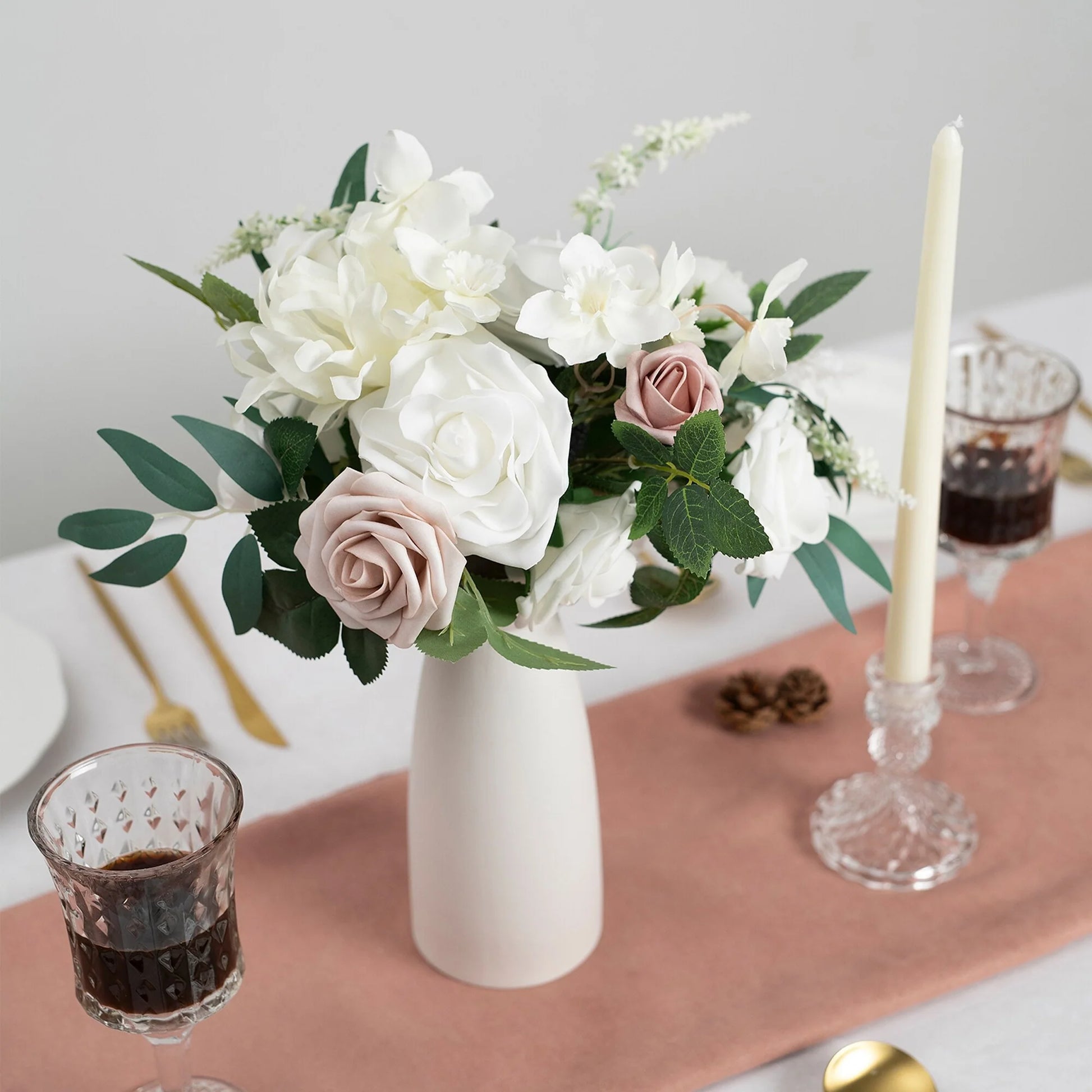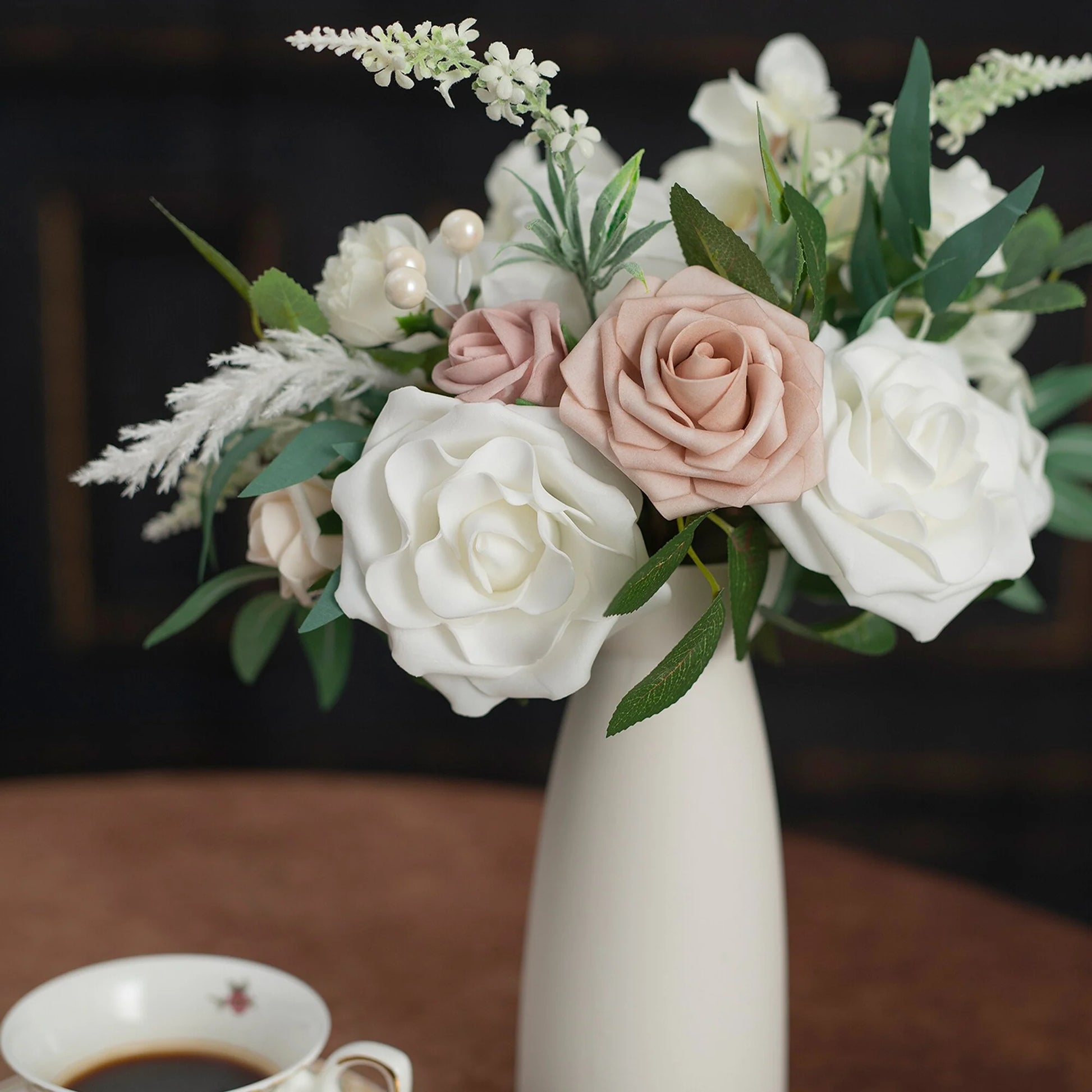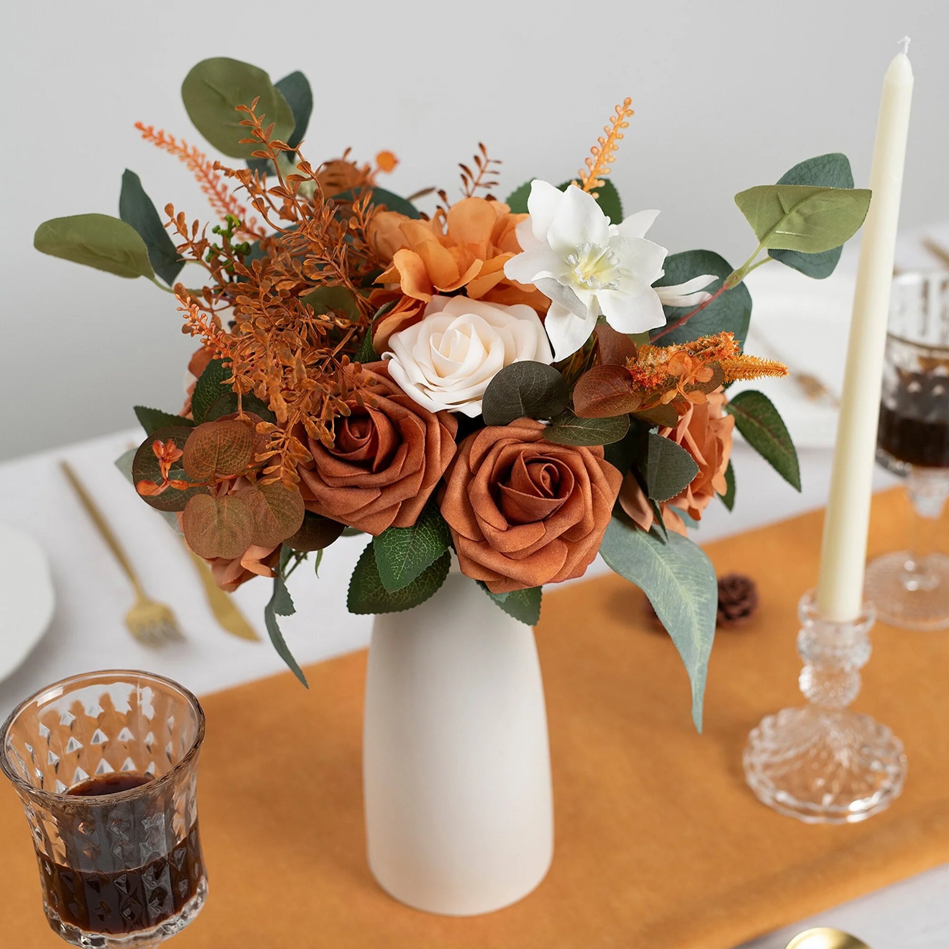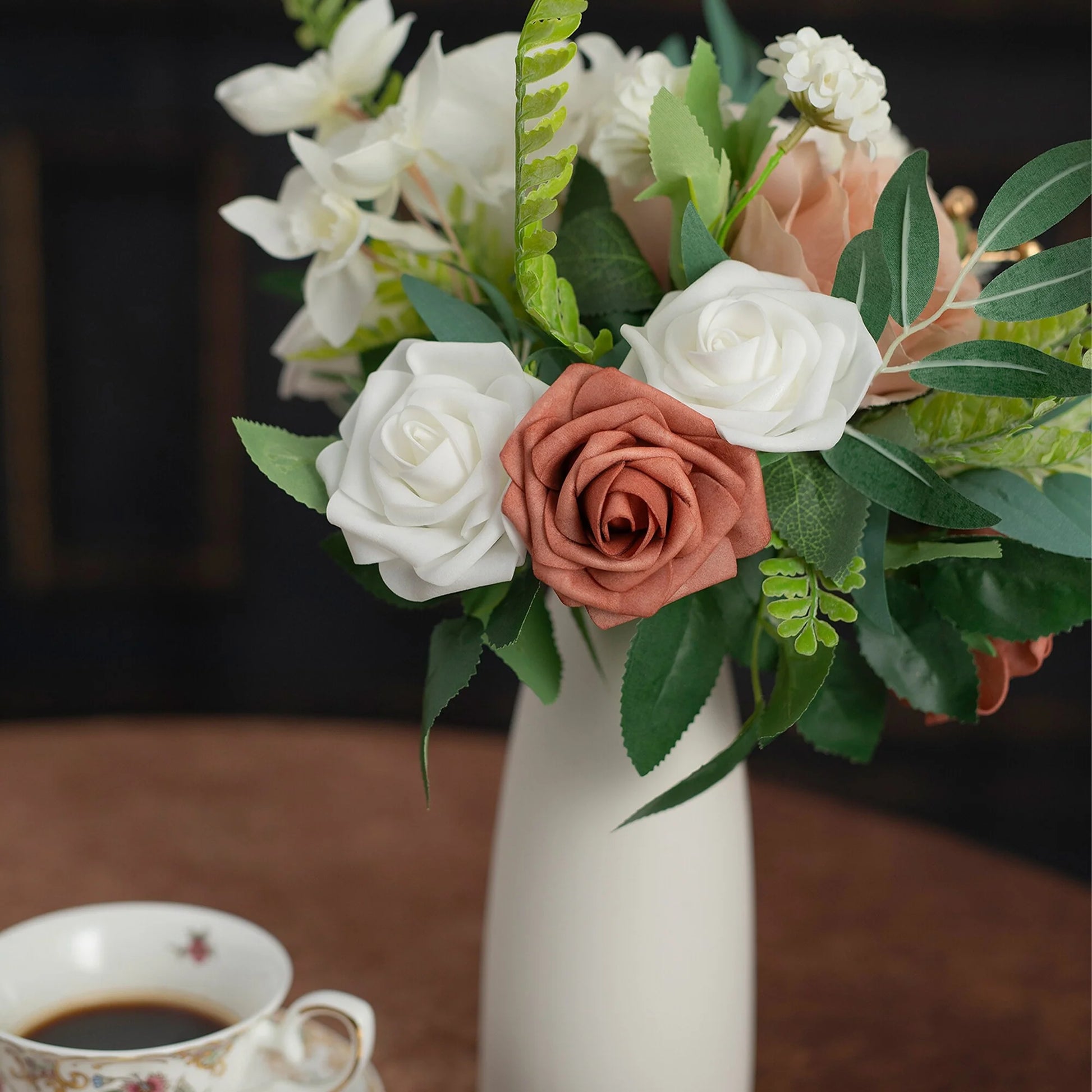 This bouquet is expertly designed using highly realistic foam/silk flowers and lush botanicals, meticulously capturing nature's intricate textures and vibrant hues. Each stem is hand-shaped to emulate the graceful curves and layered elegance of fresh blooms, seamlessly blended with diverse floral varieties and richly textured foliage. Together, they form a timeless botanical masterpiece, ideal for weddings, celebrations, or elevating everyday spaces with enduring, maintenance-free sophistication.