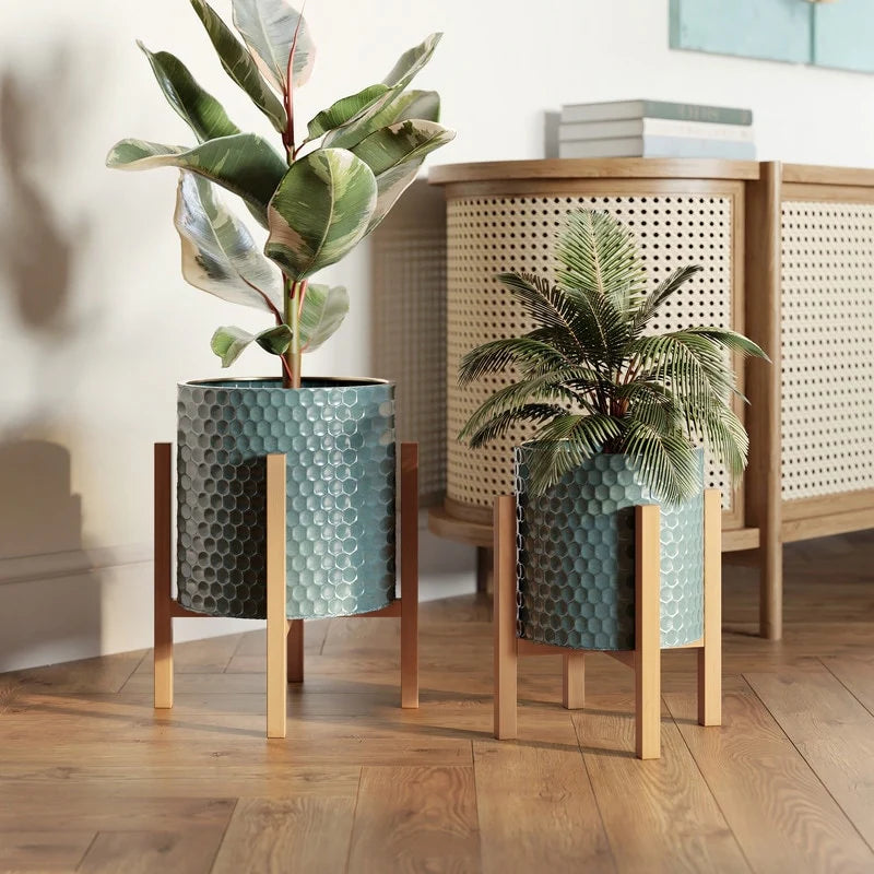 The Honeycomb Metal Planter Pot With 4-Leg Wood Base Set is a must-have for any stylish interior. This Mid Century Modern planter set features a sleek Blue-Green finish, perfect for enhancing the look of your space. With dimensions 14.75"H x 12"W and 12"H x 10"W, the Honeycomb Metal Planter Pot With 4-Leg Wood Base Set provides ample space for plants to thrive while adding a decorative touch. Designed to be both functional and fashionable, the Honeycomb Metal Planter Pot With 4-Leg Wood Base Set is crafted from high-quality materials, ensuring durability and stability. Perfect for homes, offices, or any indoor space, this planter set is sure to impress.