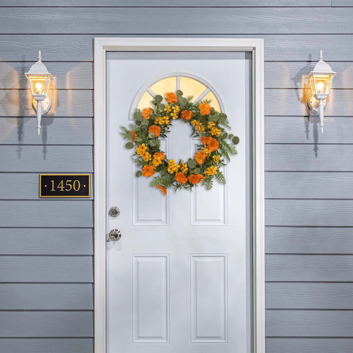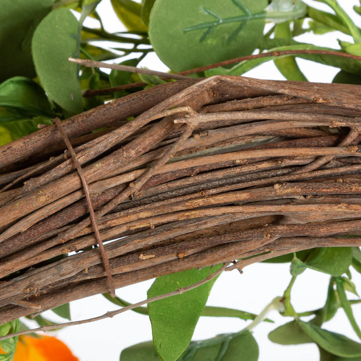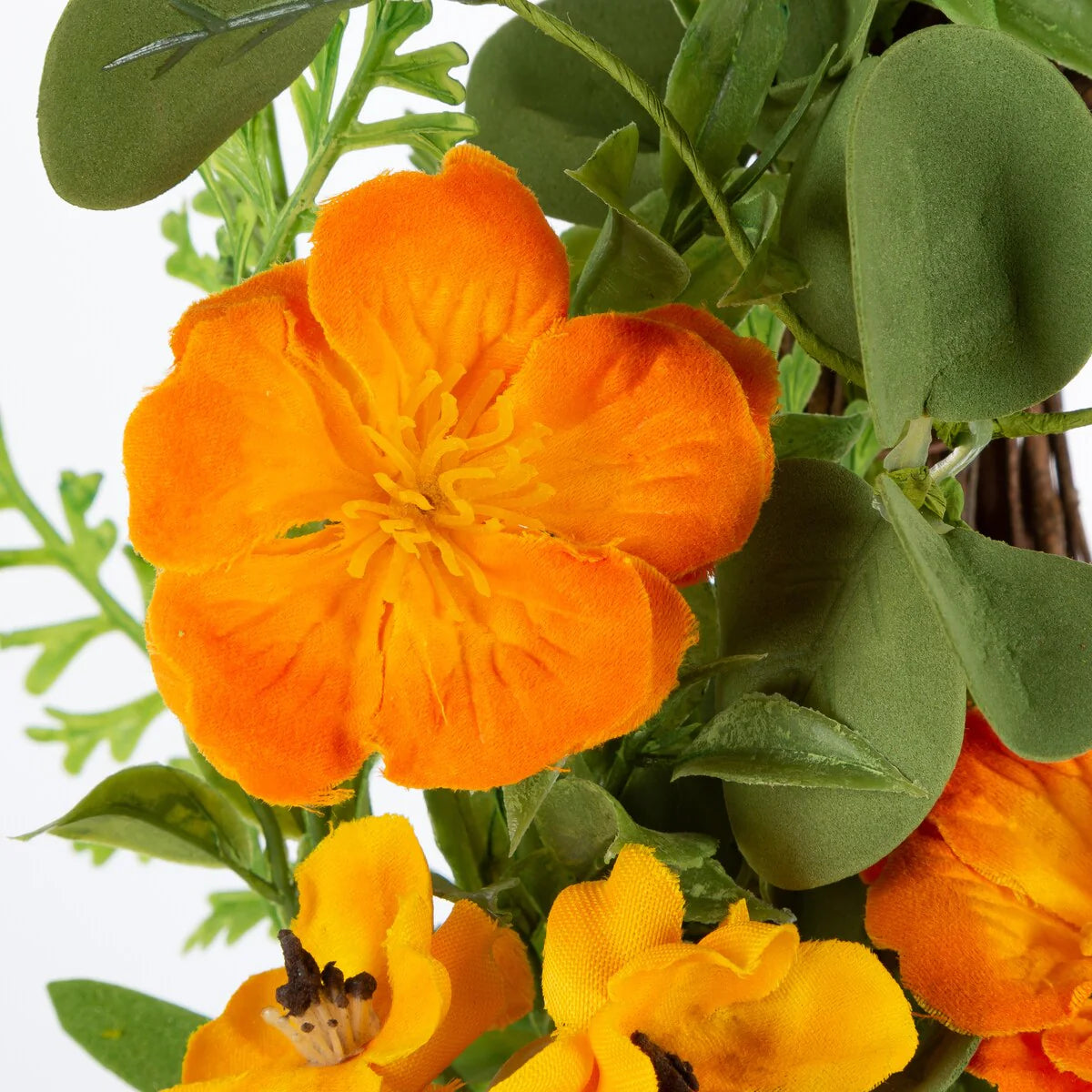 Bring the delight of a blooming garden into your own home with this stunning 24 inch diameter mixed yellow and orange perennial flowers with eucalyptus and ferns wreath. Artfully crafted with orange and rust wildflowers, this beautiful wreath is ideal for year round use. Ideal as a house warming gift for friends, family or that special someone, this stunning wreath is also perfect for accenting your own home.