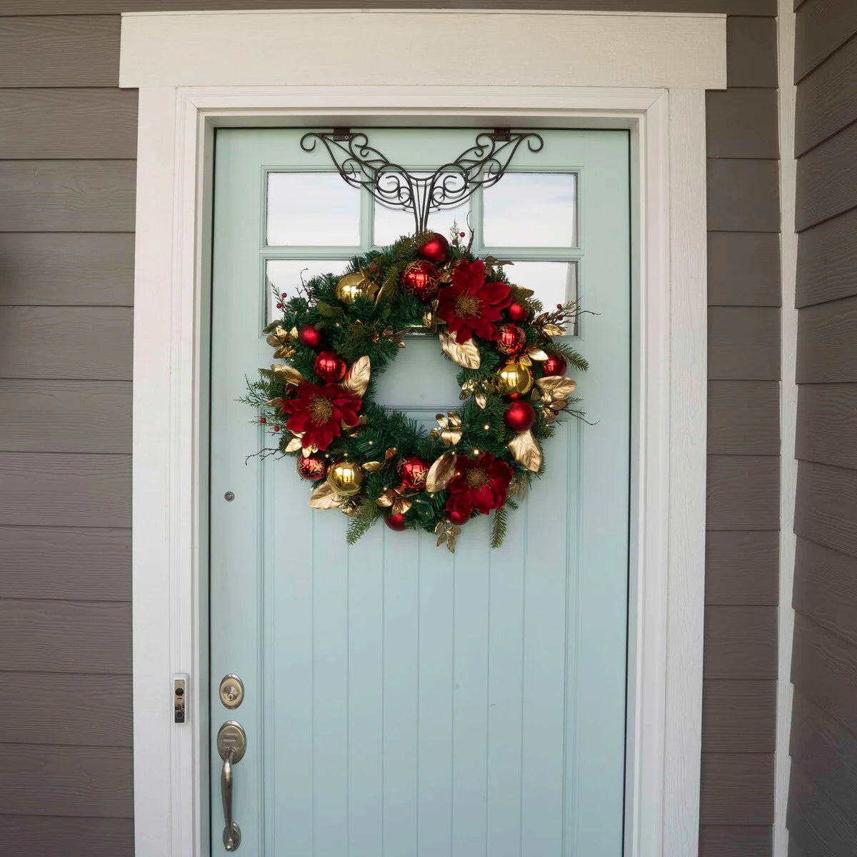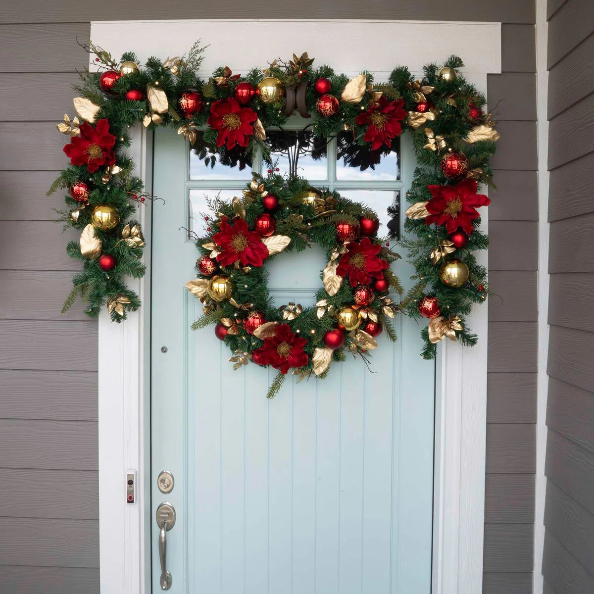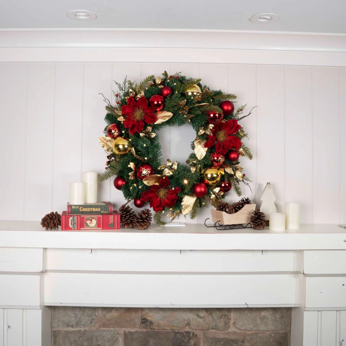 A lighted Christmas wreath is a must have if you want to impress your guests during the holidays, and this one of a kind holiday wreath is sure to meet those expectations. The Golden Leaf Red Magnolia wreath is a pre-lit, remote-controlled, battery-operated Christmas Wreath with 50 LED mini lights. 30 in. from tip to tip, the Golden Leaf Red Magnolia xmas wreath features a handcrafted design complete with gold magnolia leaves, red magnolia flowers, red berries, and stunning red and gold ornaments to give a modern touch on traditional Christmas wreaths. Our life-like artificial Christmas wreaths for front door are perfect either indoors or outdoors, whether you want to hang it above your fireplace mantle, or display it on your front door. Either way, be sure to complete the look with a matching 9 ft. garland to complement your decorated Christmas wreaths with lights!