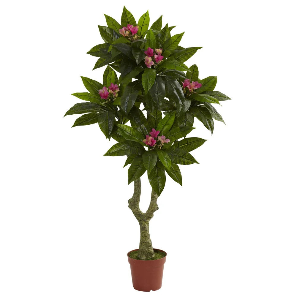 Put simply, this beautiful Plumeria tree will become one of your favorite pieces of decor. Standing 60-inches high, this tree has an authentic looking trunk that rises and splits, resulting in several layers of leaf and flower blooms. Perfect for your home or the office, this tree is sure to spruce up any room.