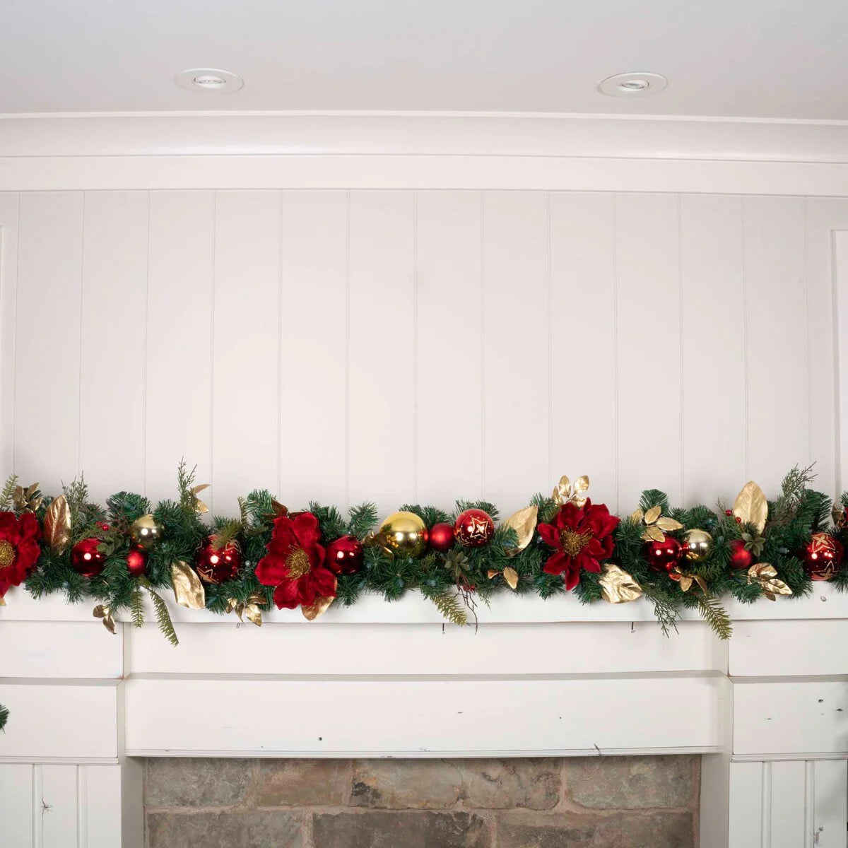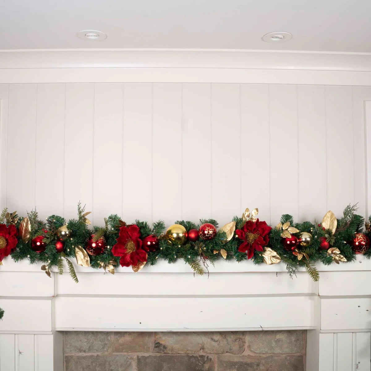 An artificial Christmas garland with lights is a must have if you want to impress your guests during the holidays, and this one of a kind prelit Christmas garland is sure to meet those expectations. The Golden Leaf Red Magnolia garland is a pre-lit, remote-controlled, battery-operated Christmas garland with 100 LED mini lights. 9 ft. from tip to tip, the Golden Leaf Red Magnolia lighted garland features a handcrafted design complete with gold magnolia leaves, red magnolia flowers, red berries, and stunning red and gold ornaments to give a modern touch on traditional Christmas garland. The life-like artificial garland is perfect either indoors or outdoors, whether you want to hang it on your fireplace mantle, or display it above your front door. Either way, be sure to complete the look with a matching wreath!
