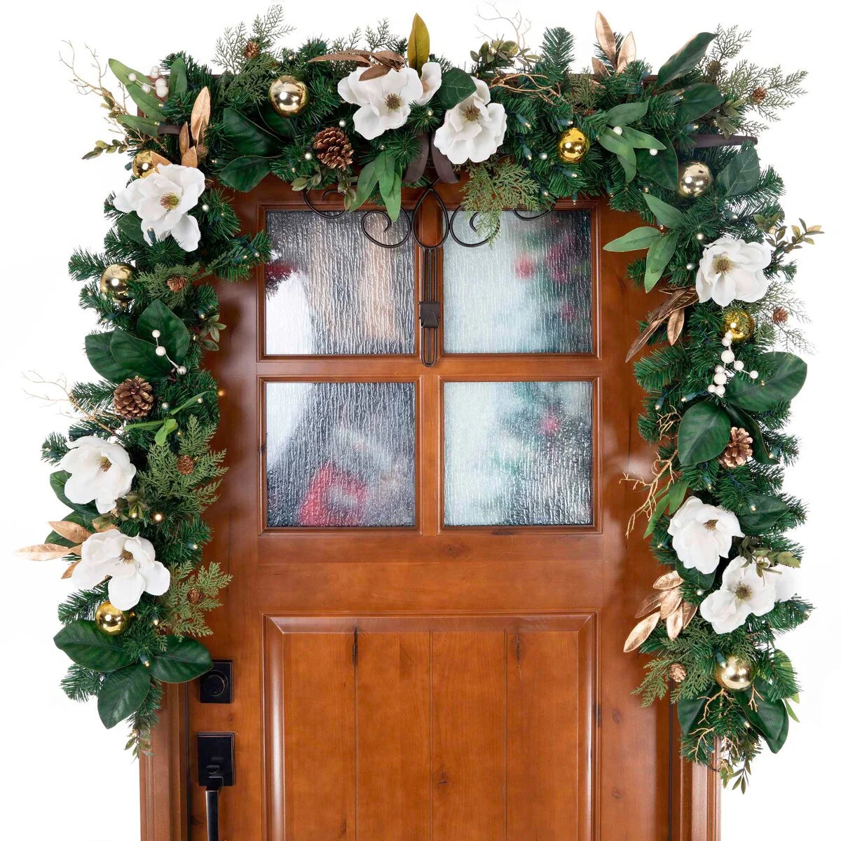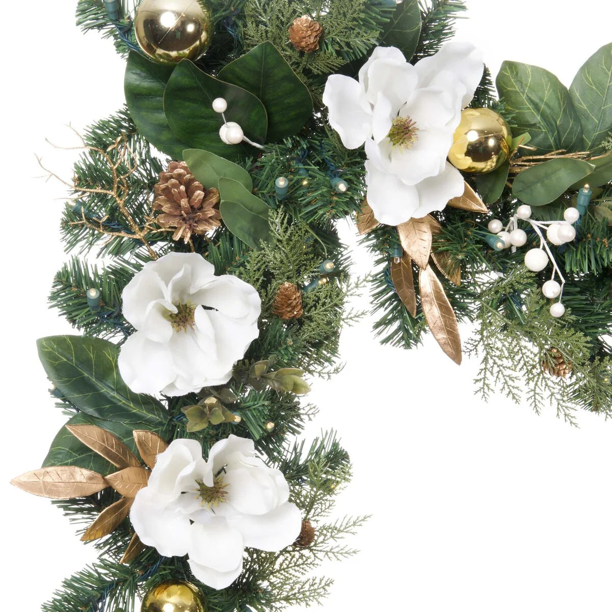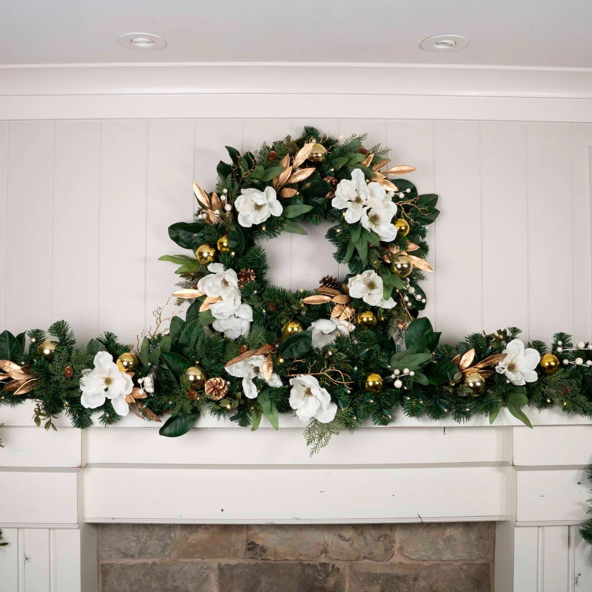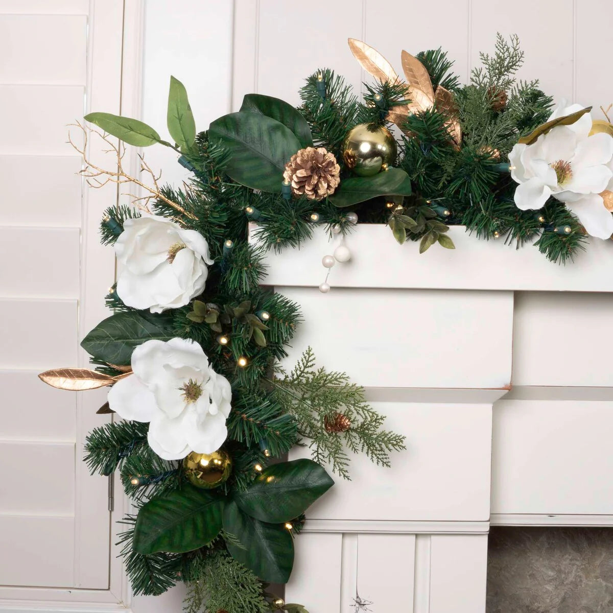 9 ft. Artificial Christmas Garland with Lights - White Gold Magnolia - 9 Foot