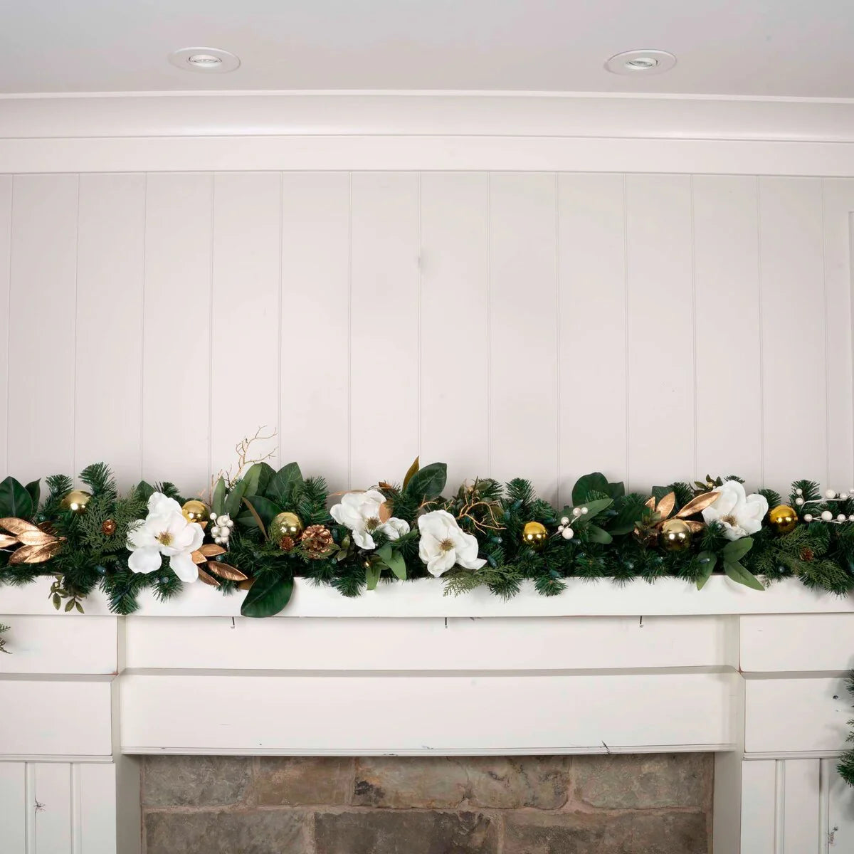 An artificial Christmas garland with lights is a must have if you want to impress your guests during the holidays, and this one of a kind prelit Christmas garland is sure to meet those expectations. The White Gold Magnolia garland is a pre-lit, remote-controlled, battery-operated Christmas garland with 100 LED mini lights. 9 ft. from tip to tip, the White Gold Magnolia lighted garland features a handcrafted design complete with gold magnolia leaves, white magnolia flowers, pinecones, and stunning white and gold ornaments to give an elegant touch on traditional Christmas garland. The life-like artificial garland is perfect either indoors or outdoors, whether you want to hang it on your fireplace mantle, or display it above your front door. Either way, be sure to complete the look with a matching wreath!
