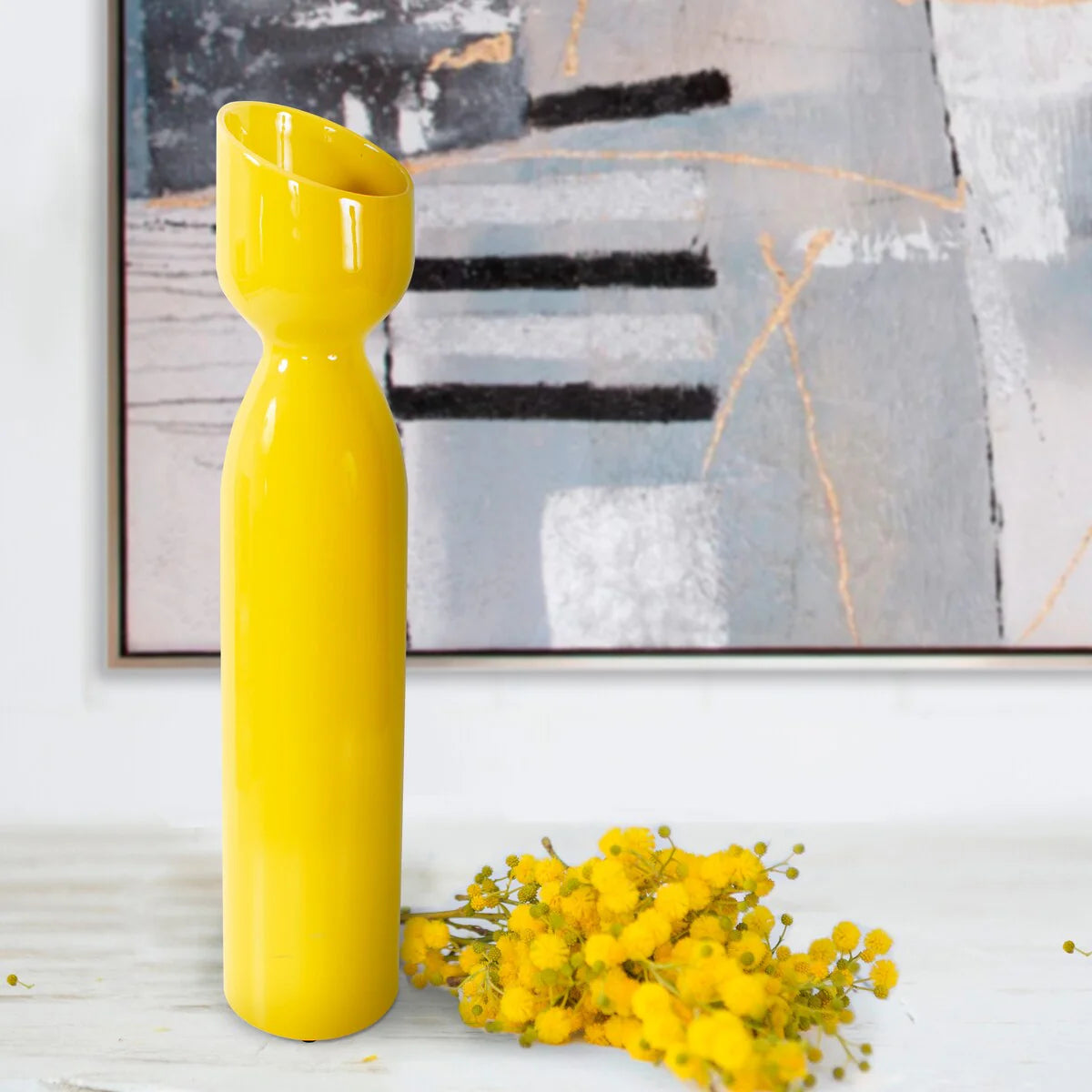 Introducing a striking and contemporary addition to your décor that radiates positivity and energy. This unique vase provides versatility for various spaces and design needs. Its bold hue of bright yellow instantly captures attention, injecting a cheerful spirit into any room. Its distinctive slanted top, adds a modern twist to its classic form. Whether showcasing a single bold bloom or serving as a standalone statement piece, this vase elevates your interior with its dynamic color and innovative design.