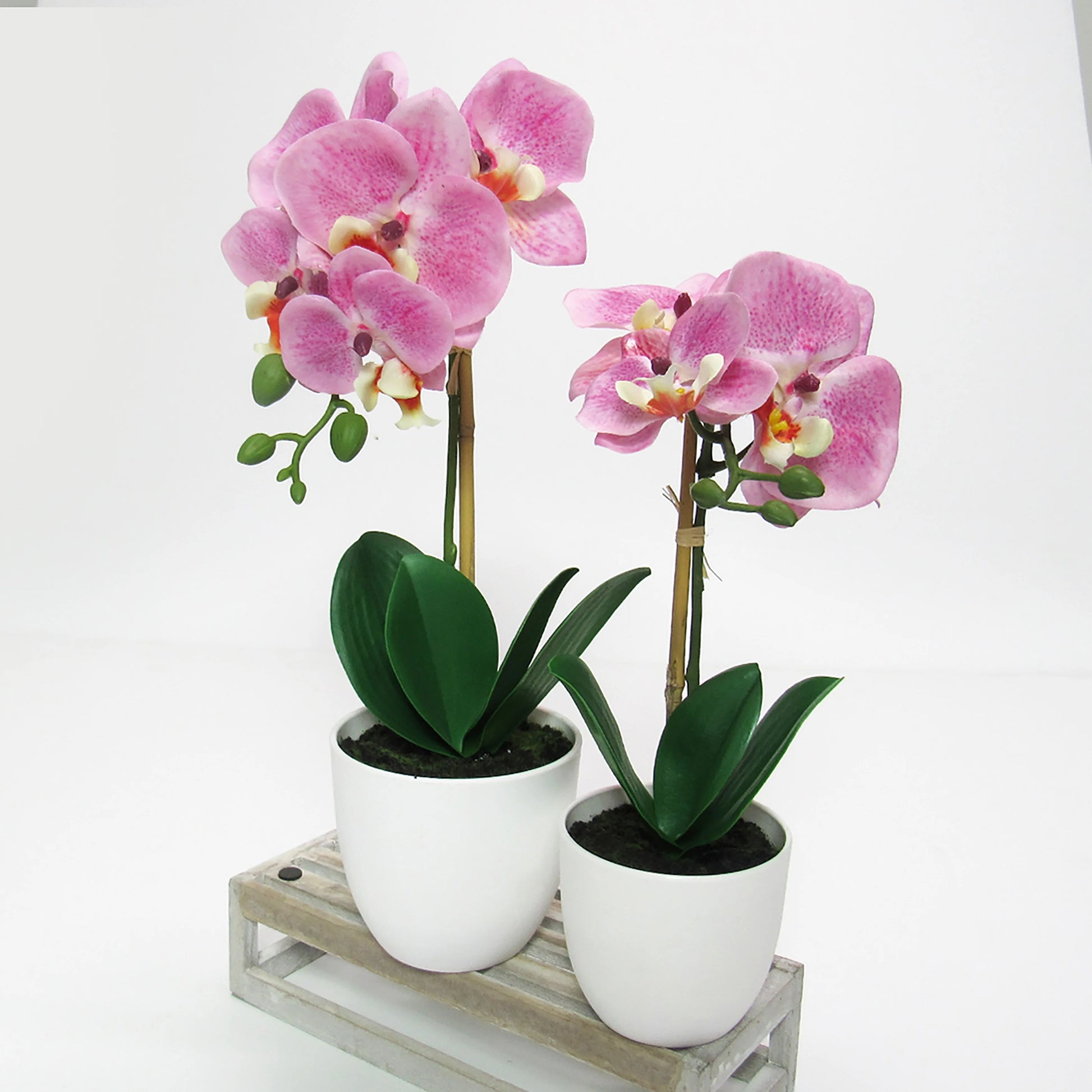 - Includes natural and vibrant orchid flower stems, orchid leaves, and plastic pot
