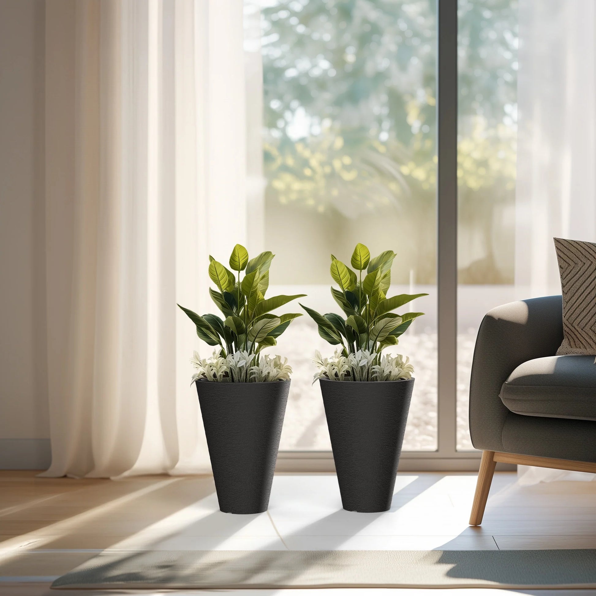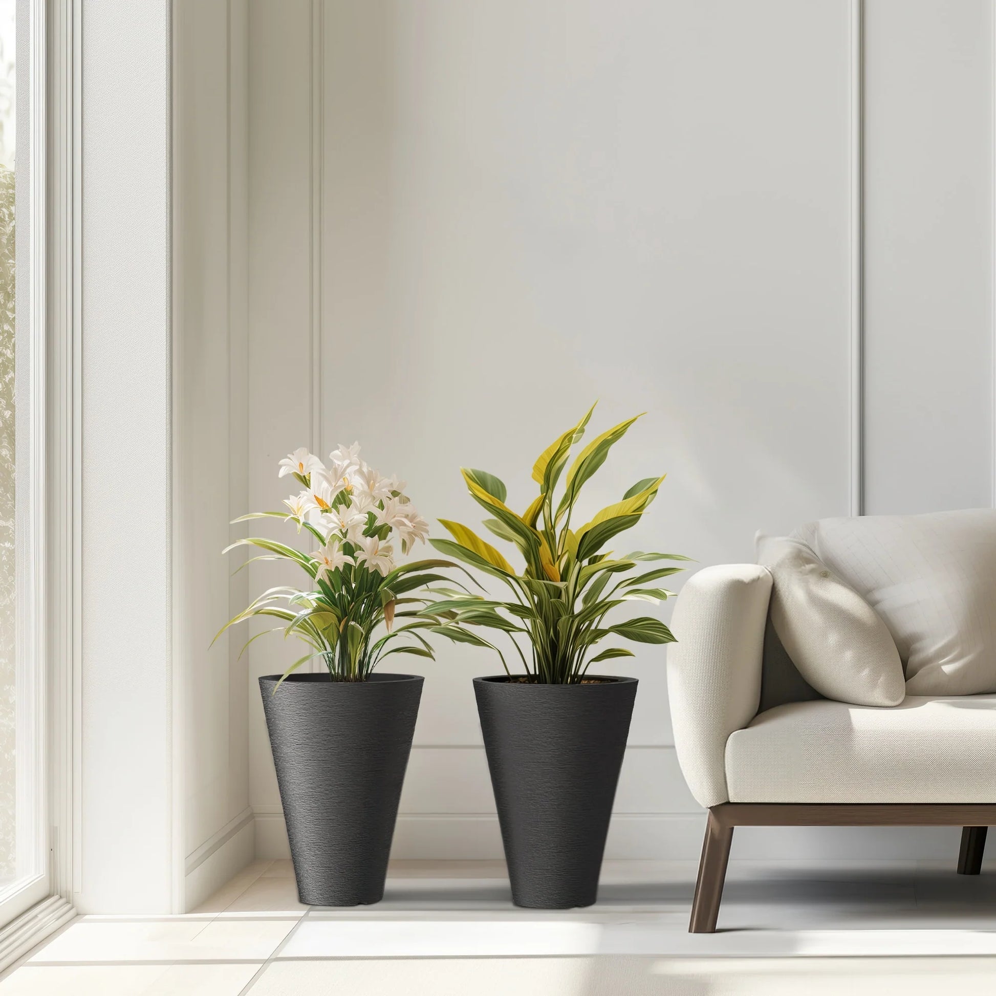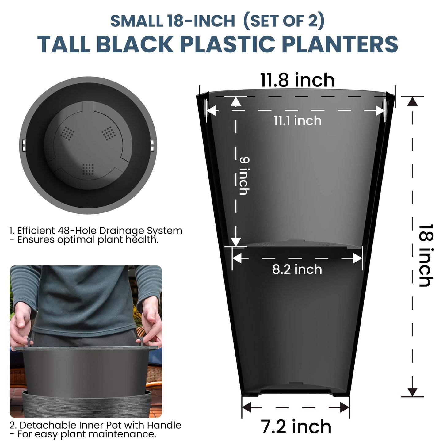 Black Tall Plastic Round Plant Pots / Large Indoor and Outdoor Flower Planters, 2 Piece Set