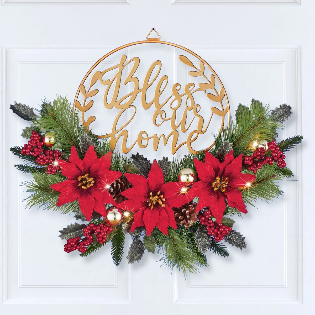 This beautiful wreath features a gold-toned metal base that reads, "Bless Our Home" across the center. A stunning arrangement of poinsettias, holly leaves, pine, ornaments and berries decorates the bottom half of the metal frame and comes to life with the addition of 6 sparkling white LED lights. Req 3 "AAA" batteries (sold separately). Hook at the top makes hanging easy. Polyester, metal, rattan and plastic. 21"L x 18"H.