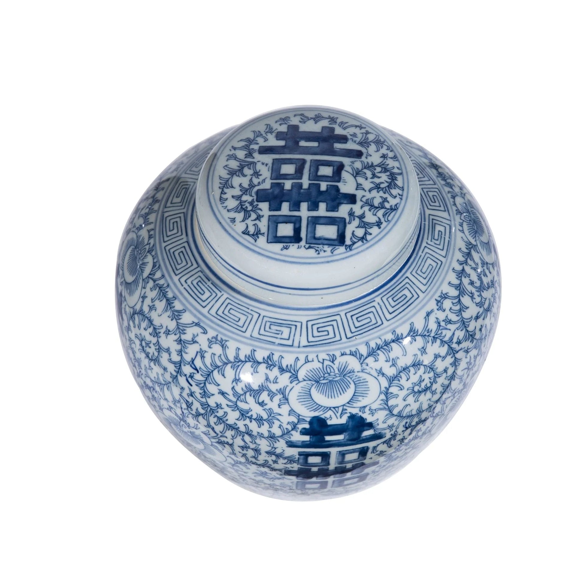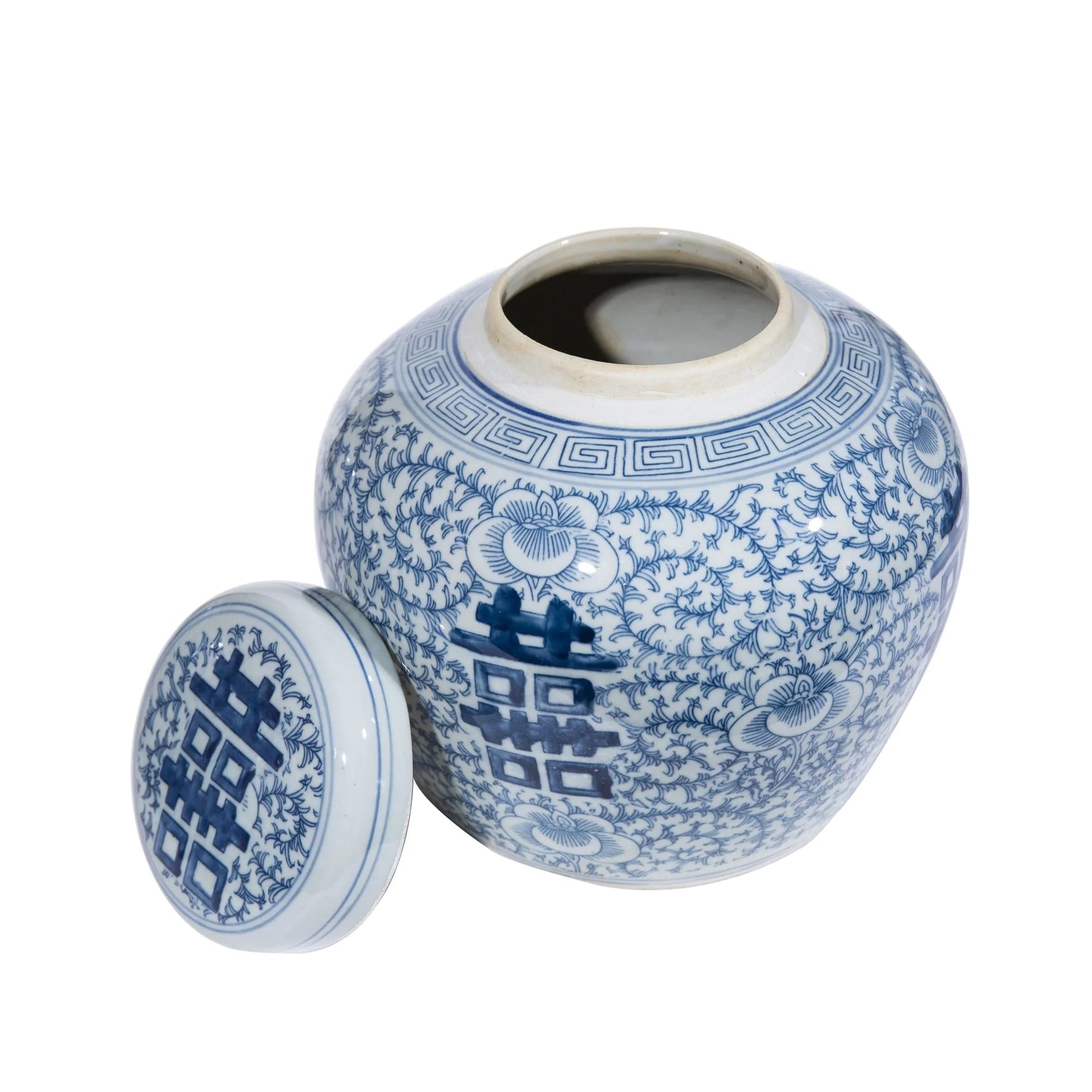 Add a touch of elegance to your home with this Blue and White Double Happiness Floral Lidded Jar. Handcrafted with high fire porcelain, this vintage style temple jar features a distressed square shape that creates unique and charming imperfections. The 100% hand-shaped and hand-painted design adds an artistic and museum-worthy touch to any room. Made in Jingdezhen, the capital of ceramics, this jar blends traditional craftsmanship with modern design for a truly special addition to your decor.