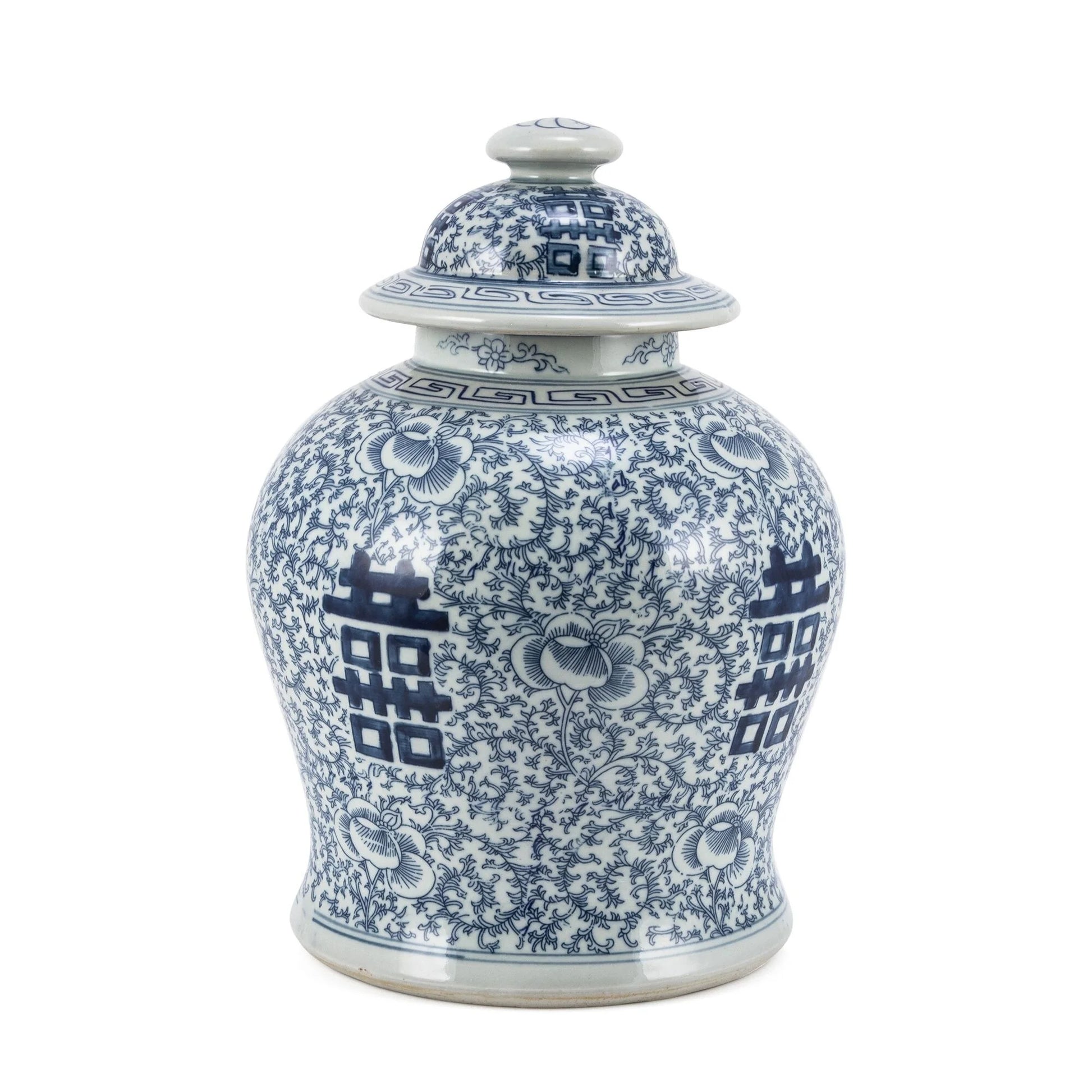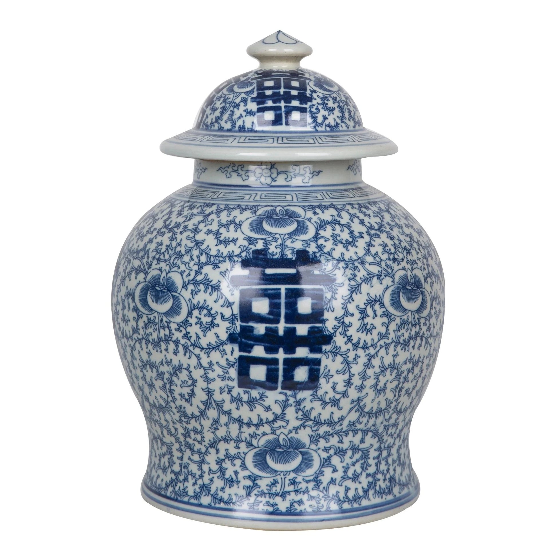 Blue and White Double Happiness Floral Temple Jar - SmallThe special antique process makes it looks like a piece of art from a museum. High fire porcelain, 100% hand shaped, hand painted. Square shape is never perfect. Distress, chips and other imperfections create great characters of this special vintage style porcelain temple jar. From a small town Jingdezhen in the southern part of China, where ceramic and porcelain were originated 5000 years ago. It is known as the capital of ceramics.