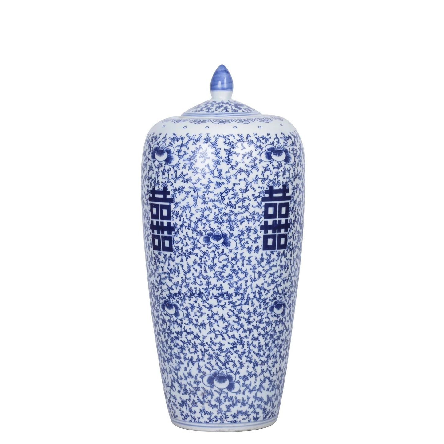 Blue and White Floral Double Happiness Tall Ginger Jar