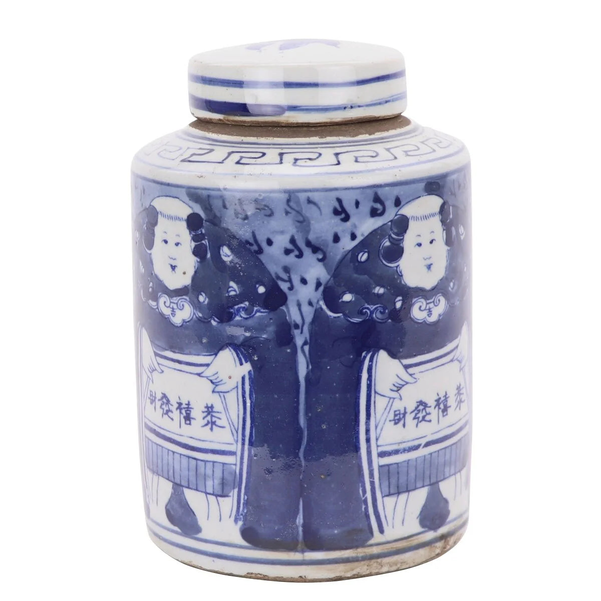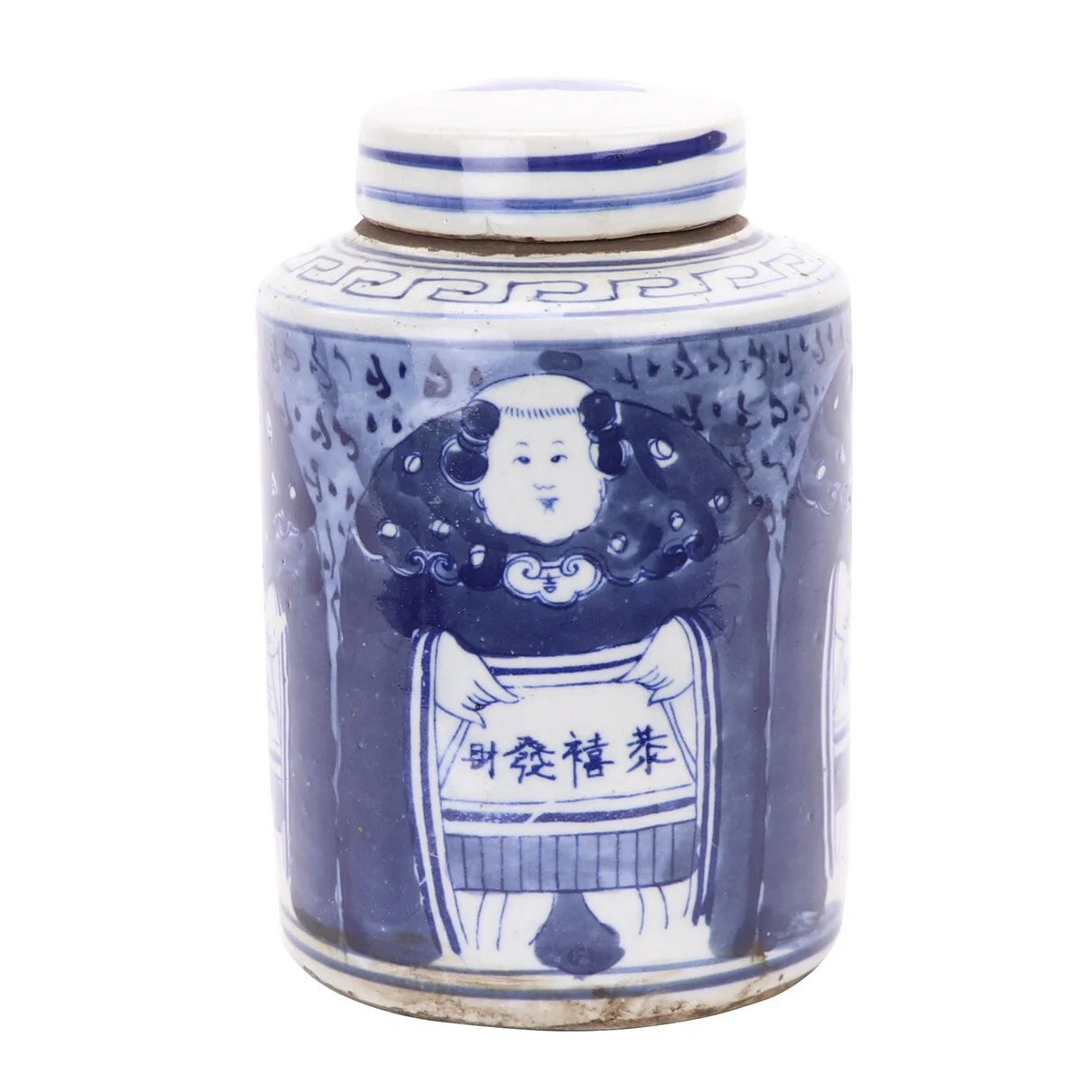 Blue And White Mini Tea Jar Lucky Boy. High fire porcelain, hand shaped, hand painted. Made from the region where ceramic and porcelain was invented, a small town in southern China, known as the Capital of Ceramic. Hand crafted item, minor shape, size, finish variation is expected, it is part of the character. Can be used in-door or out-door, water proof, weather proof.