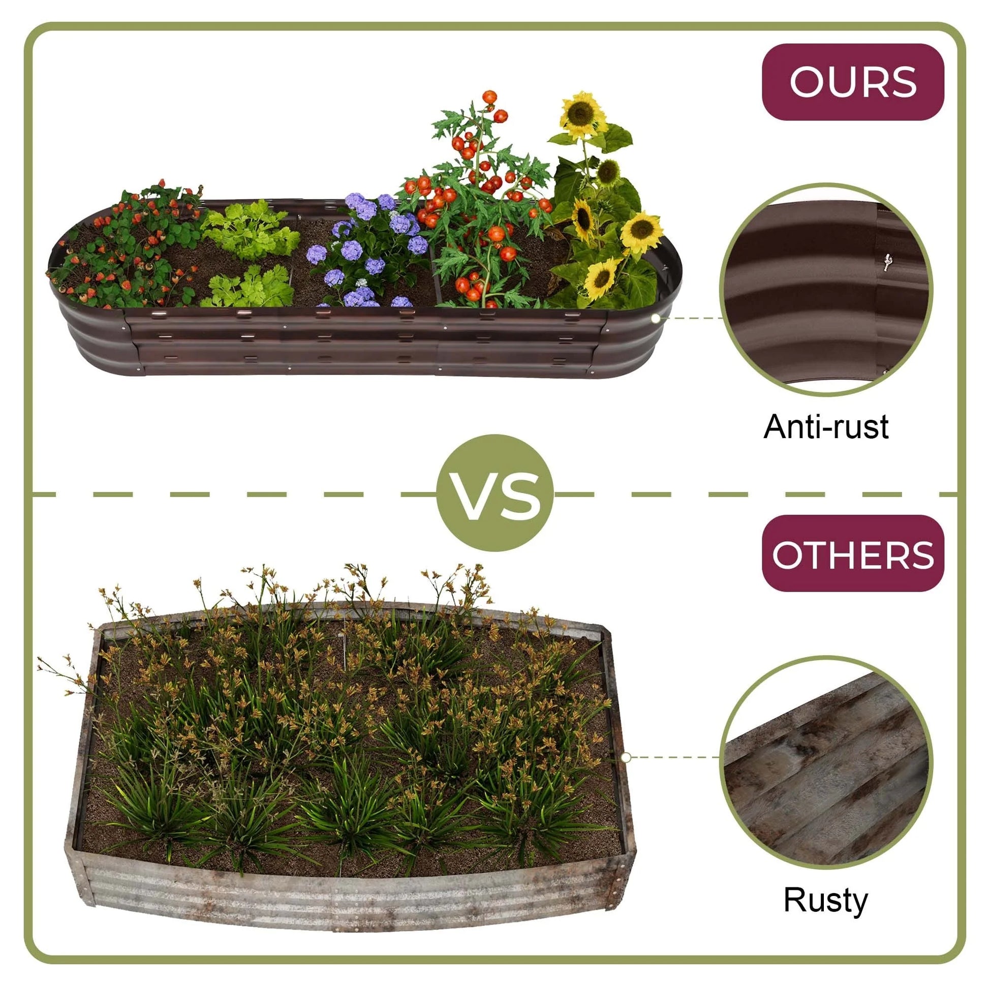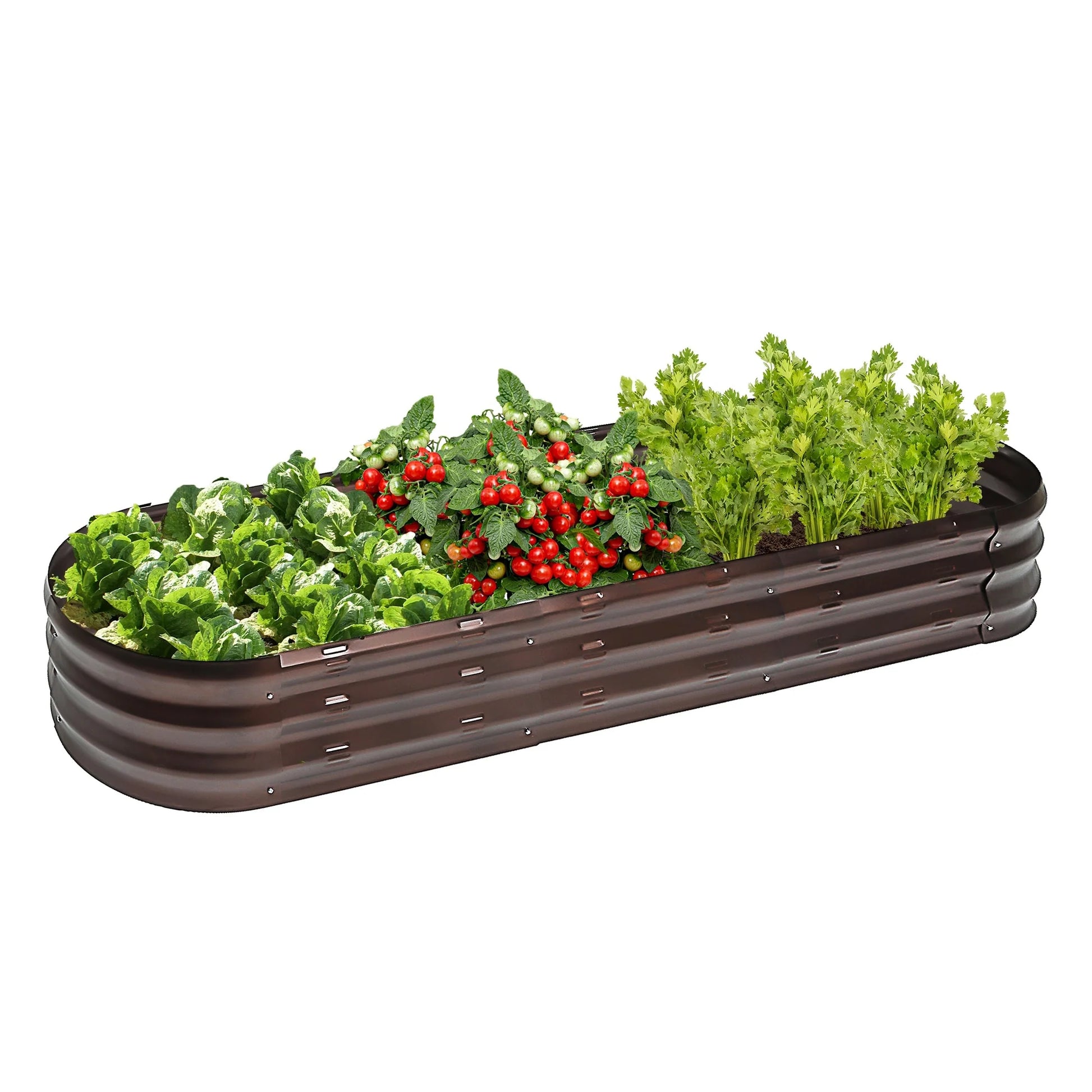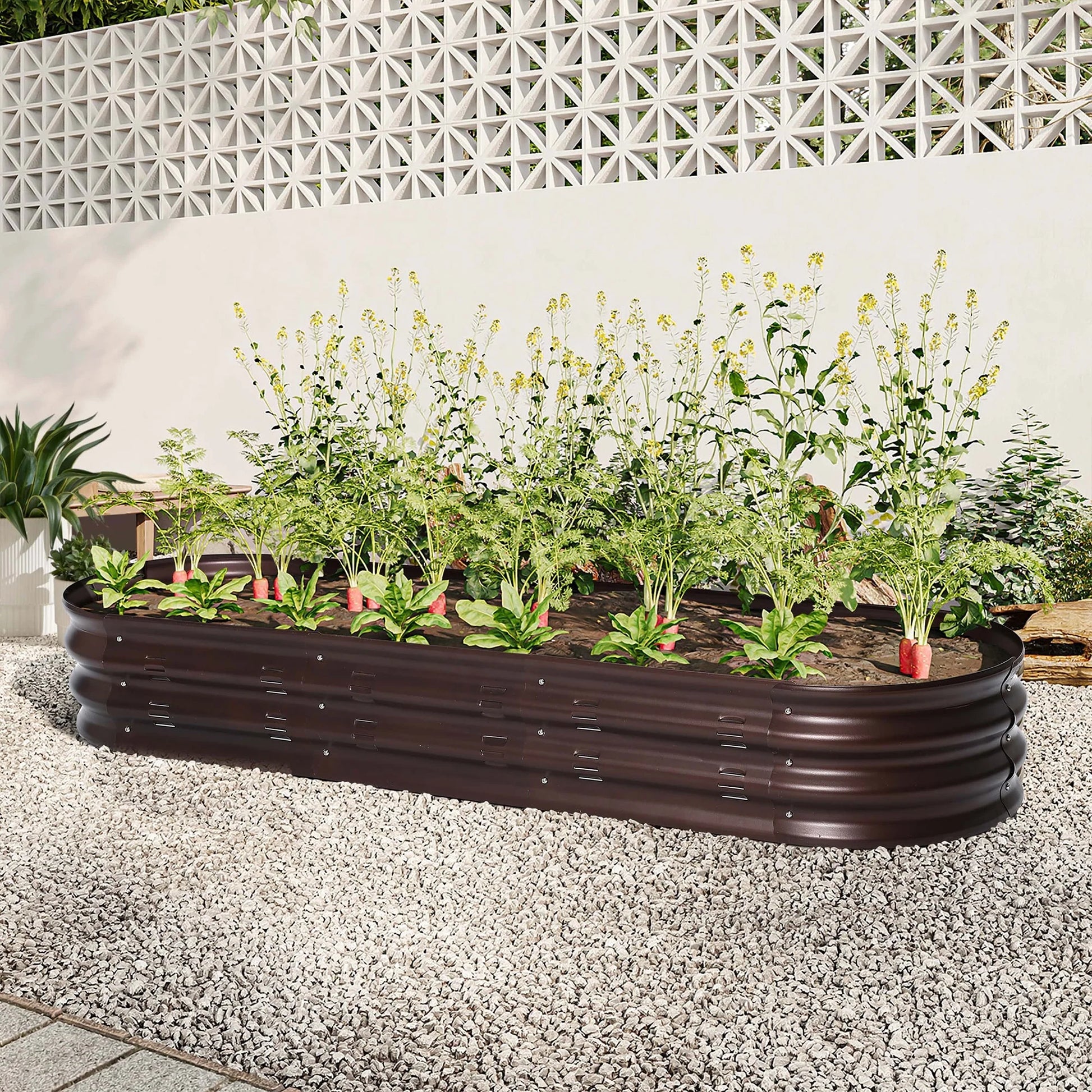 Looking to up your gardening skills? Look no further than this sturdy yet lightweight oval raised garden bed planter box. The charming rustic brown finish adds a touch of farmhouse appeal to any outdoor space, while the open base encourages healthy plant growth and minimizes weed growth. With ample planting space, this planter box is perfect for cultivating a variety of veggies, herbs, and flowers. And with its high-quality steel construction and easy assembly, it's ideal for container gardening in small or large outdoor areas.