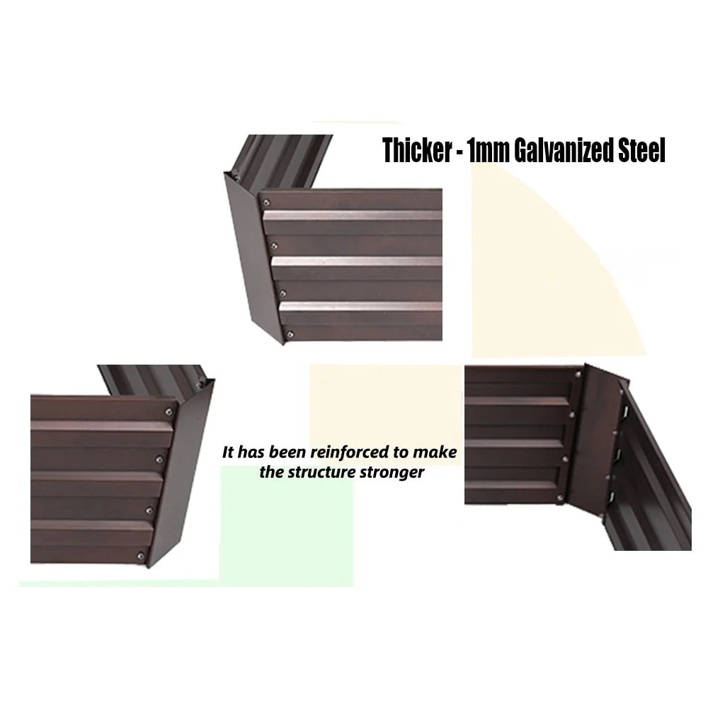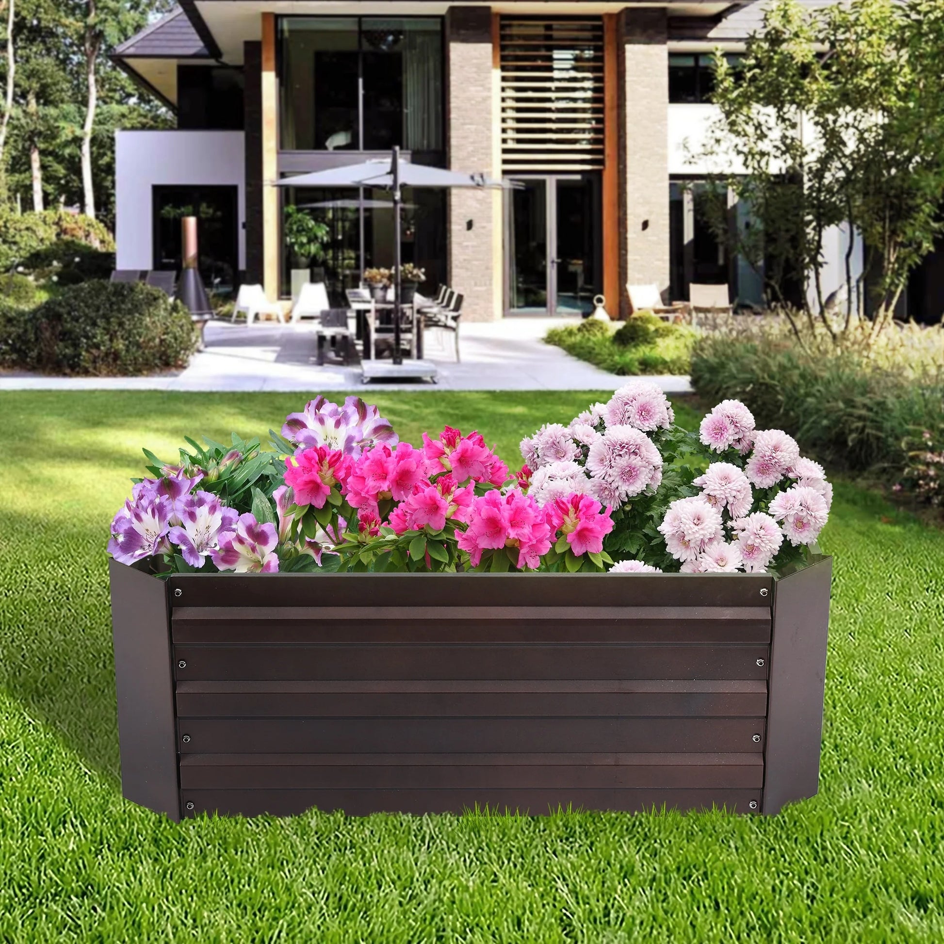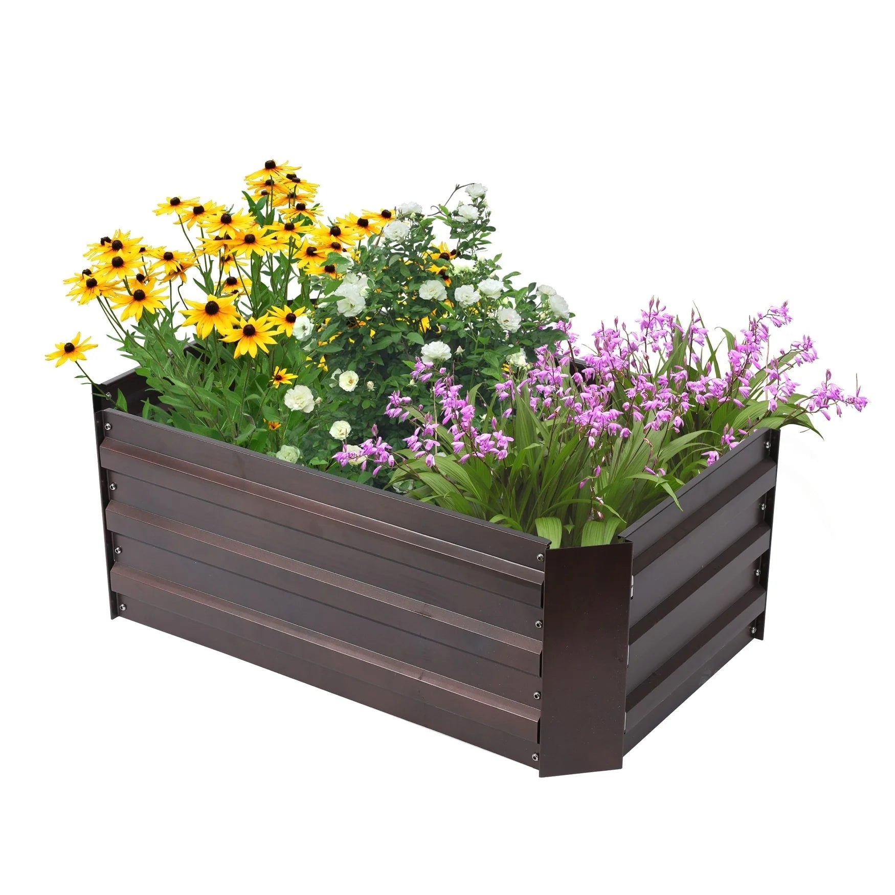 This rustic garden planter provides a stylish place for your plants to grow. It's made with powder-coated galvanized zinc-plated steel in a brown finish. This raised planter features an industrial silhouette with raised horizontal beams along the sides and metal nail head details. The flattened corners give the industrial style an upscale lift to the design. The rectangular shape of the bed can accommodate herbs, flowers, and other plants. We love that this raised garden box is weather and rust-resistant, making it just right for outdoor gardening use. The open bottom of the garden box allows for deeper root development while the containment minimizes the need for weeding and tilling the soil. Perfect for housing your herb garden or giving you the ideal spot for your perennial and annual flowers, it is a great option for creating your landscape and providing a wonderful home for all your plants. Hardware included for easy assembly.