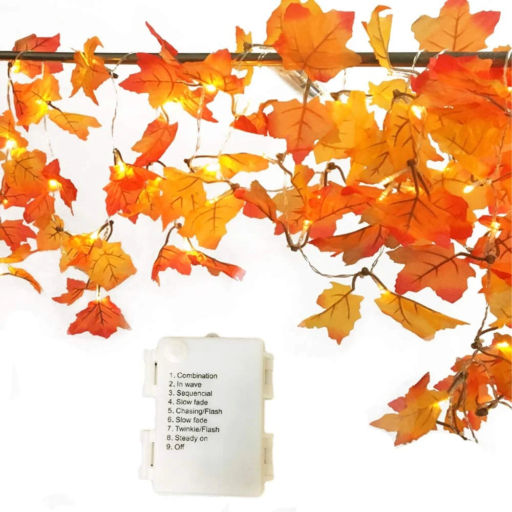 [LOOKS LIKE THE REAL STUFF]---The orange and yellow leaves lit by the vibrant orange lights make for a great blend of colors to warm up any room. Perfect festival decorations (Thanksgiving Halloween Christmas decor) with no outlet needed. The Battery Case has already been set up WITH 6 HOURS ON/ 18 HOURS OFF TIMER:When set to timer mode, it will turn off automatically after 6 hours, and then light up again at the exact same time the next day, greatly increasing the battery life to up to 3 weeks. [GREAT FOR ANY SPACE]---This lighted Fall Garland is the perfect way to accent any room or add warmth to any occasion. 8 LIGHTING MODES: Combination, In Waves, Sequential, Slo-Gol, Chasing/Flash, Slow Fade, Twinkle/Flash, Steady On, OFF. [FOR BOTH DAYS AND NIGHTS DECORATIONS]--- In the day time, it will do its job being a string of maples. At night, the lighted LED on its string will accent any room and generate a warm atmosphere for any occasion. [DURABLE]---This garland features a suitable length(8.2 feet/2.5m) for decorations. Bend and adjust to any shape that you like for your decorating needs. [SPECIFICATION]---Set of 20 LED lights and 8.2 feet. Requires 3 AA batteries, not included