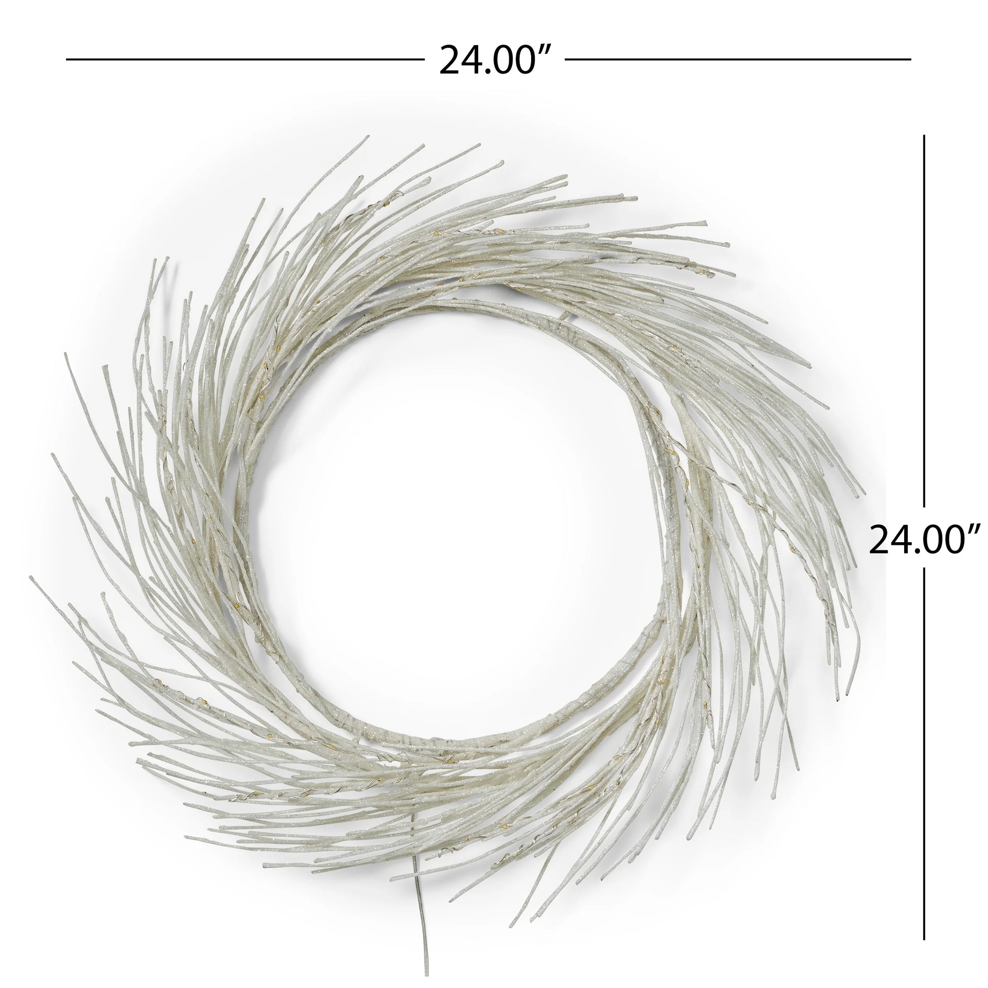 Add whimsical elegance to your Christmas decor with this stunning wreath. Crafted from iron and craft paper, the wreath features faux twig branches, arranged in a spiral and embellished with sparkling accents and 60 LEDs. The wreath includes a timer that keeps the lights on for six hours, and automatically shuts them off for eighteen so you don't have to worry about turning them on and off.