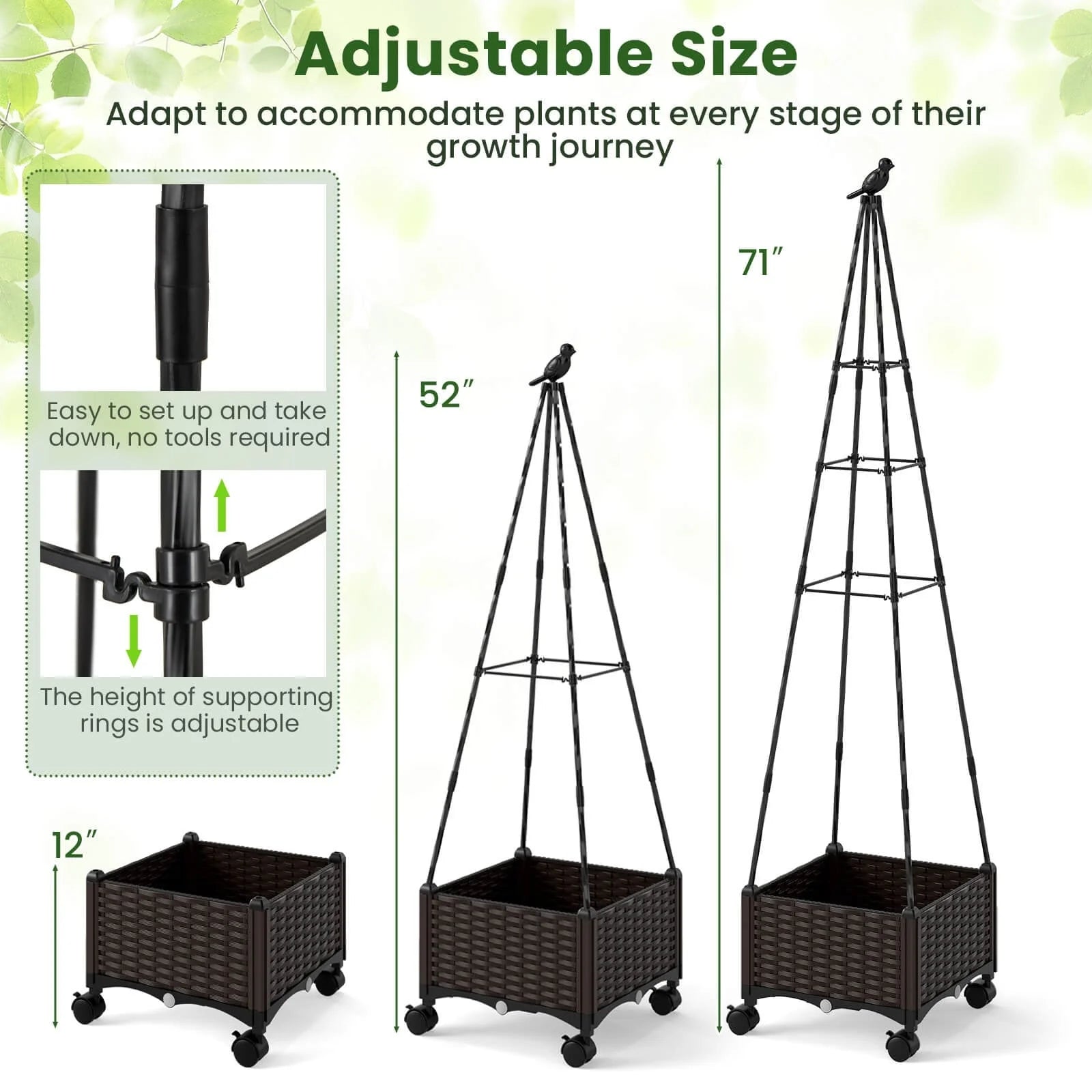 Our 2-in-1 raised garden bed measures 16" x 16" x 71" (L x W x H), including a planter box and an obelisk trellis that can be used together or separately, providing ample planting space and enough vertical support for various climbing plants, from vegetables and fruits to flowers and herbs. The height of trellis and supporting rings are adjustable, while the planter box features an extendable design, accommodating different garden layouts and different growing needs of climbing plants. More than that, the planter box is equipped with a self-watering system and drainage holes, helping plants absorb water and nutrition completely while preventing water logging. Crafted from solid metal tubes with PE coating and robust PP panels, our planter box with trellis provides durability against varying weather conditions. Whether you’re gardening indoors or outdoors, this planter with 4 lockable universal wheels is effortless to move around.