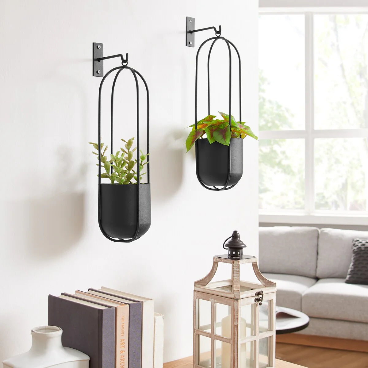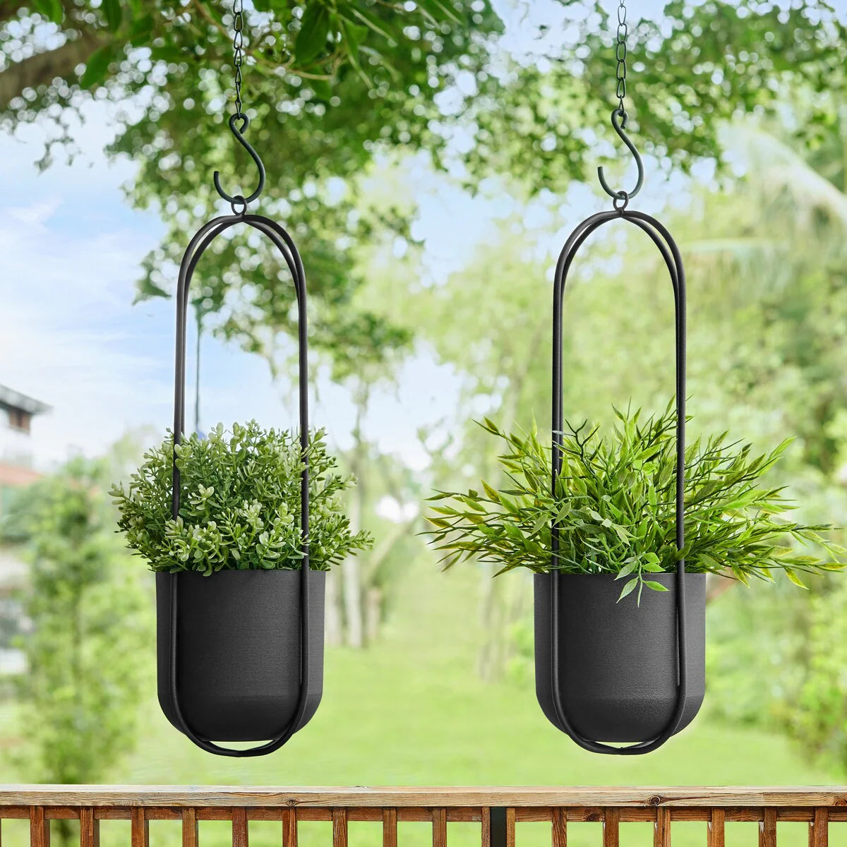 The Walter 2-Piece Modern Black Metal Oval Hanging Planter Set presents a chic way to show off your favorite greenery. Suitable for indoor or outdoor use, these metal hanging planters feature minimalist black pots held in an elegant oval hanging frame. With versatile wall mounting hardware included, the planters can be hung two distinct ways. The sophisticated oval frames can be hung directly onto a mounted wall hook, or the planters can be attached to a tasteful metal chain for a suspended appearance instead. With easy-to-install mounting hardware, you'll be able to set up your plants in your preferred configuration in no time. Simply fill with your favorite shallow root plants like aloe vera, pinstripe plant, lavender, or various succulents and hang them in your living room, bedroom, kitchen, or garden. The planters can be displayed together or separately throughout your home. The flexible hanging configurations provide the opportunity to set up two distinct yet cohesive planters to adapt to your living space dynamic. This set of two urban black planters offers a stylish and practical way to bring a little nature into your home. With the perfect mix of modern design and practicality, you can fill the two contemporary pots with your favorite shallow-rooted plants and hang them anywhere indoors or outdoors. Not only will you be able to show off your beautiful houseplants, but you'll also get to enjoy the calming benefits of having nature at your fingertips. This set is a must-have for anyone looking to create a calming oasis in their home.