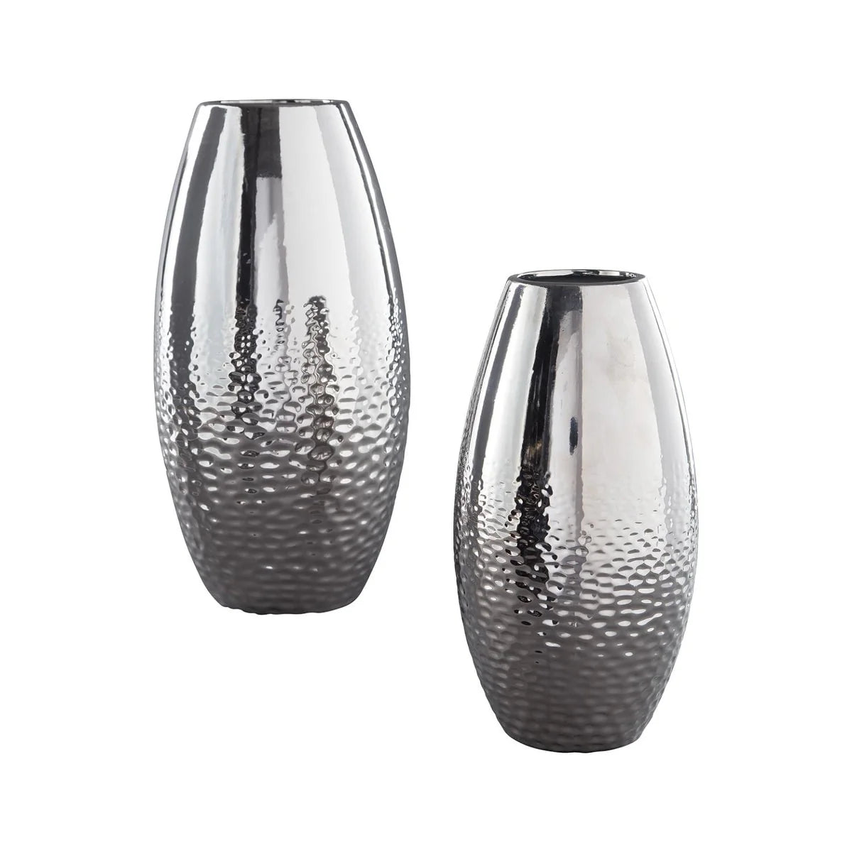 Add subtle glam with the Dinesh ceramic vase set, reflecting your eclectic eye for design. Textural pattern gracing the sides of the vases evokes ripples of water. Spectacular silvertone glazed finish adds a splash of sheen and shine.