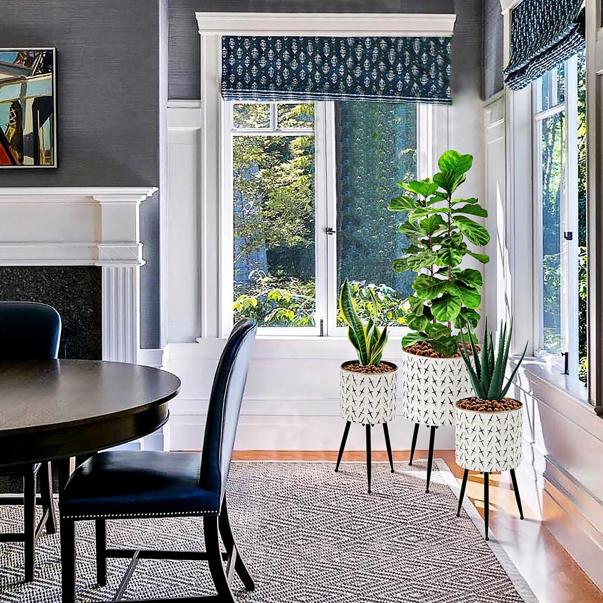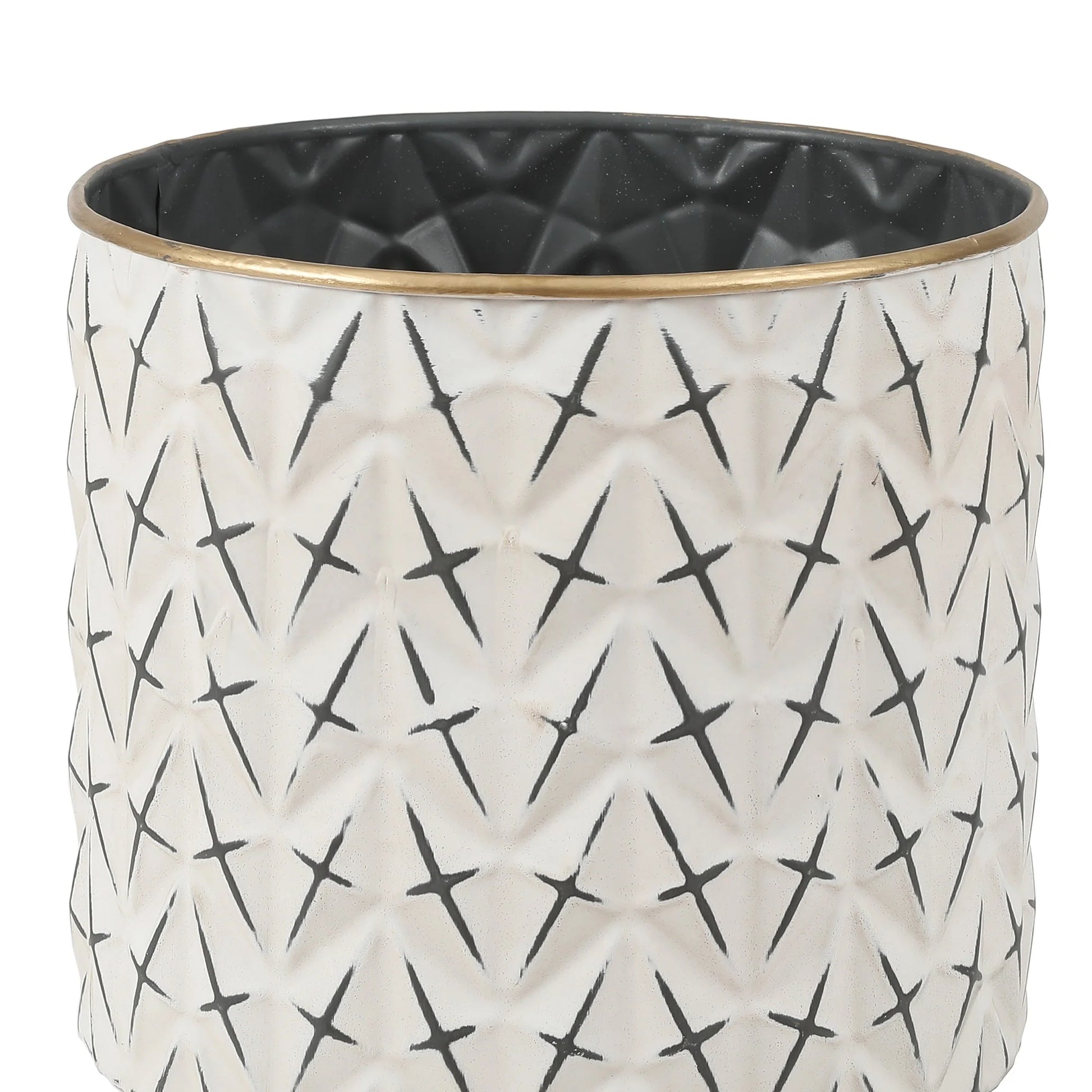 Give your plants the perfect perch with this set of three metal cachepot planters with legs. These planters are sure to add a touch of elegance to any indoor or outdoor space with their distressed white finish, black accents, and diamond-star pattern. These cachepots are perfect for showcasing your real or faux plants and flowers and are not meant for direct planting. The metal legs are simple to attach to the base of each planter with the included hardware. This set is an ideal gift for housewarming or holidays.
