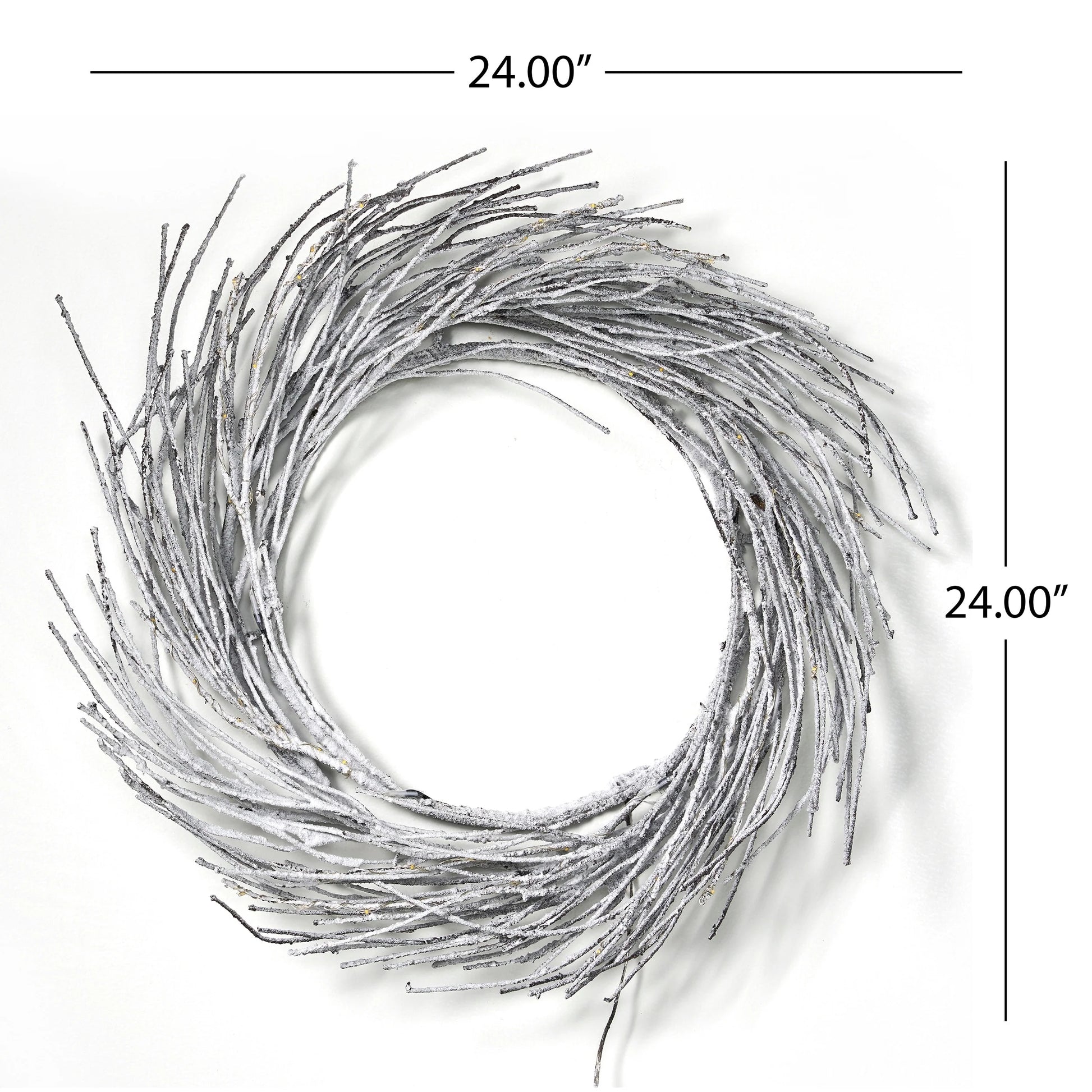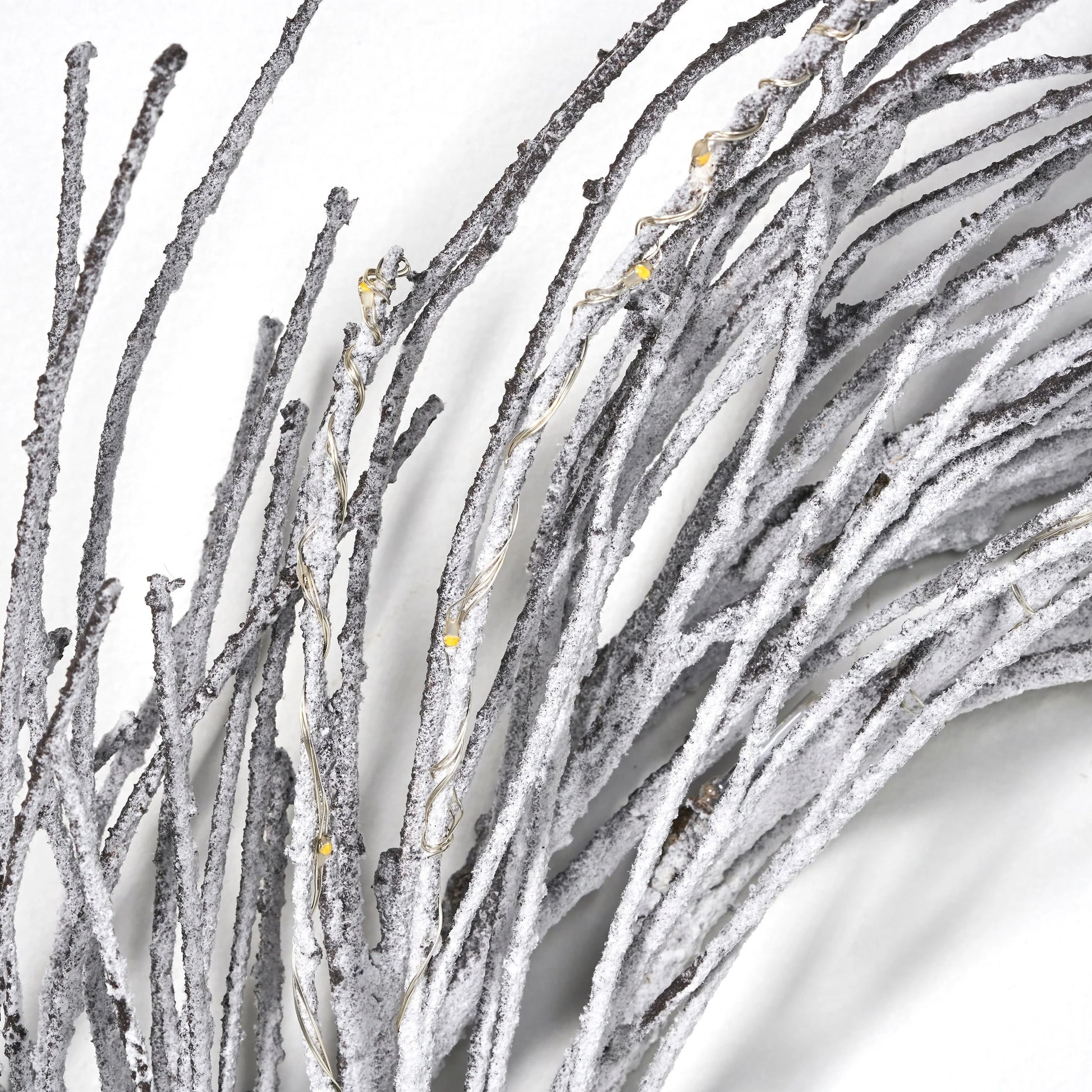Bring timeless elegance to your Christmas decor with this beautiful wreath. The wreath features an iron ring, surrounded by a swirl of faux twigs crafted from craft paper and enhanced with snowy glitter, creating a whimsical look. The wreath is embellished with 60 LEDs and an includes a timer that remains lit for six hours before turning off for eighteen hours for convenient use.