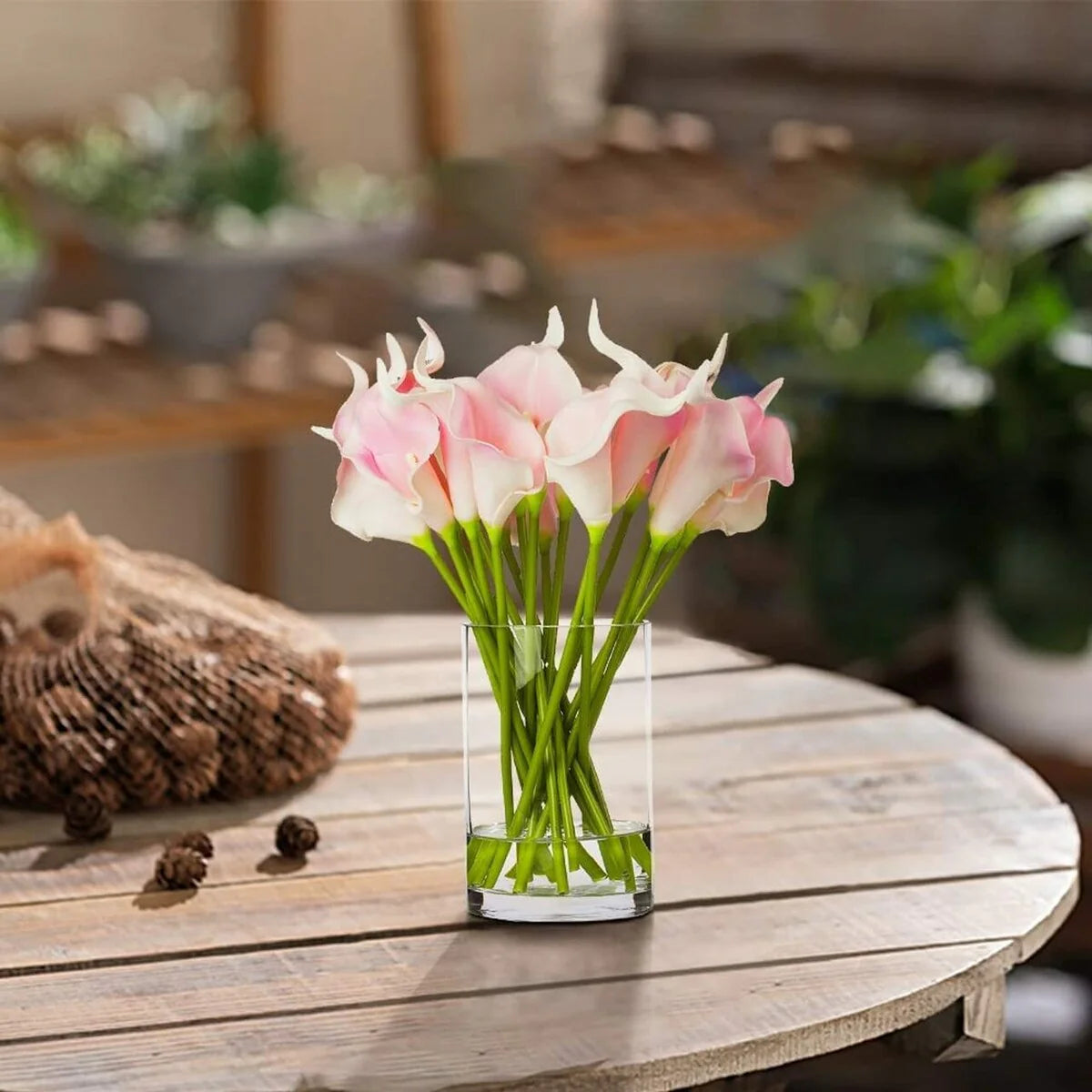 - 【Flowers Feature】20 Pieces pink color artificial flowers fake calla lily in glass vase, Overall dimension of this small artificial Lilies flowers in vase is approx 12H x 7W inches, Clear cylinder glass vase is 6H x 4W inches