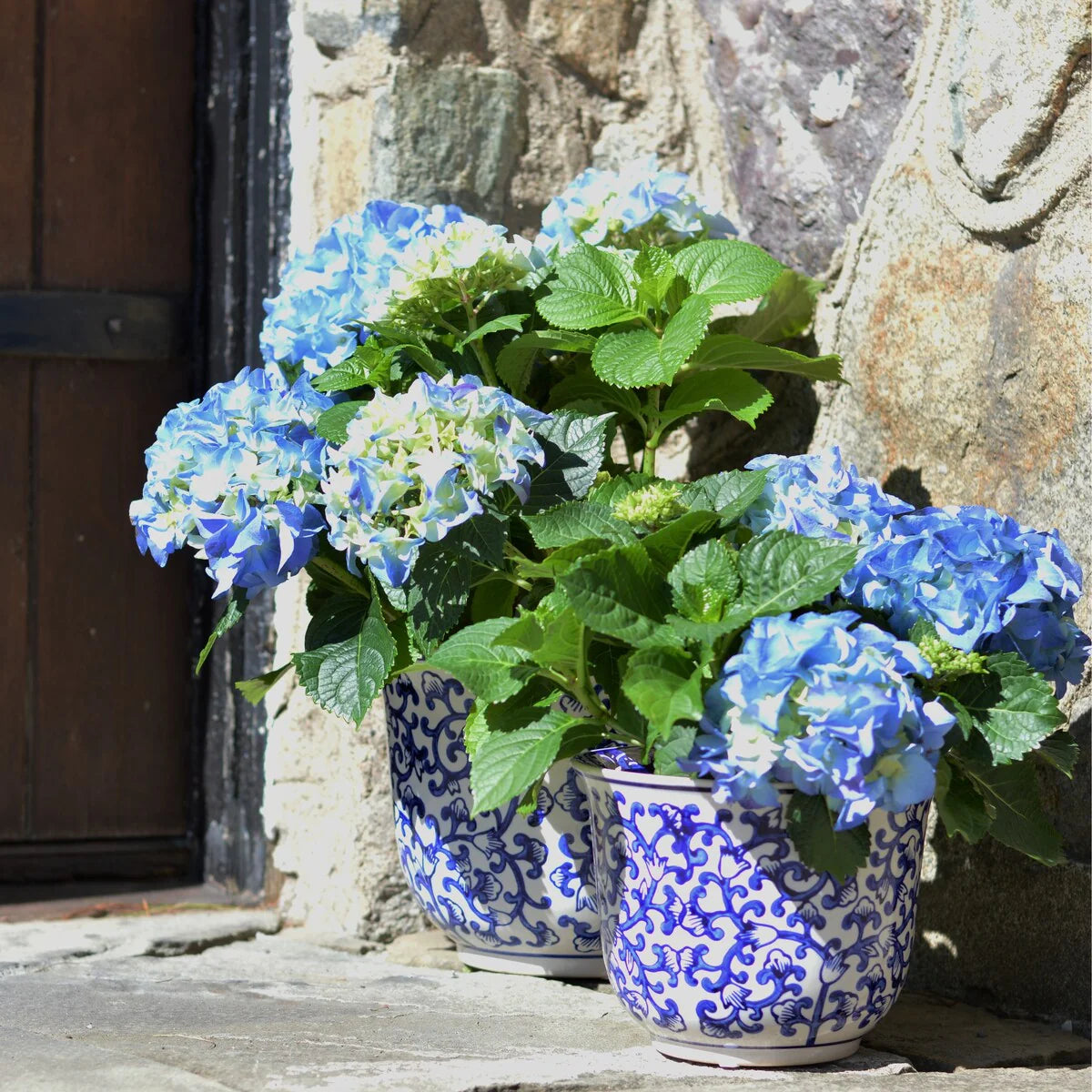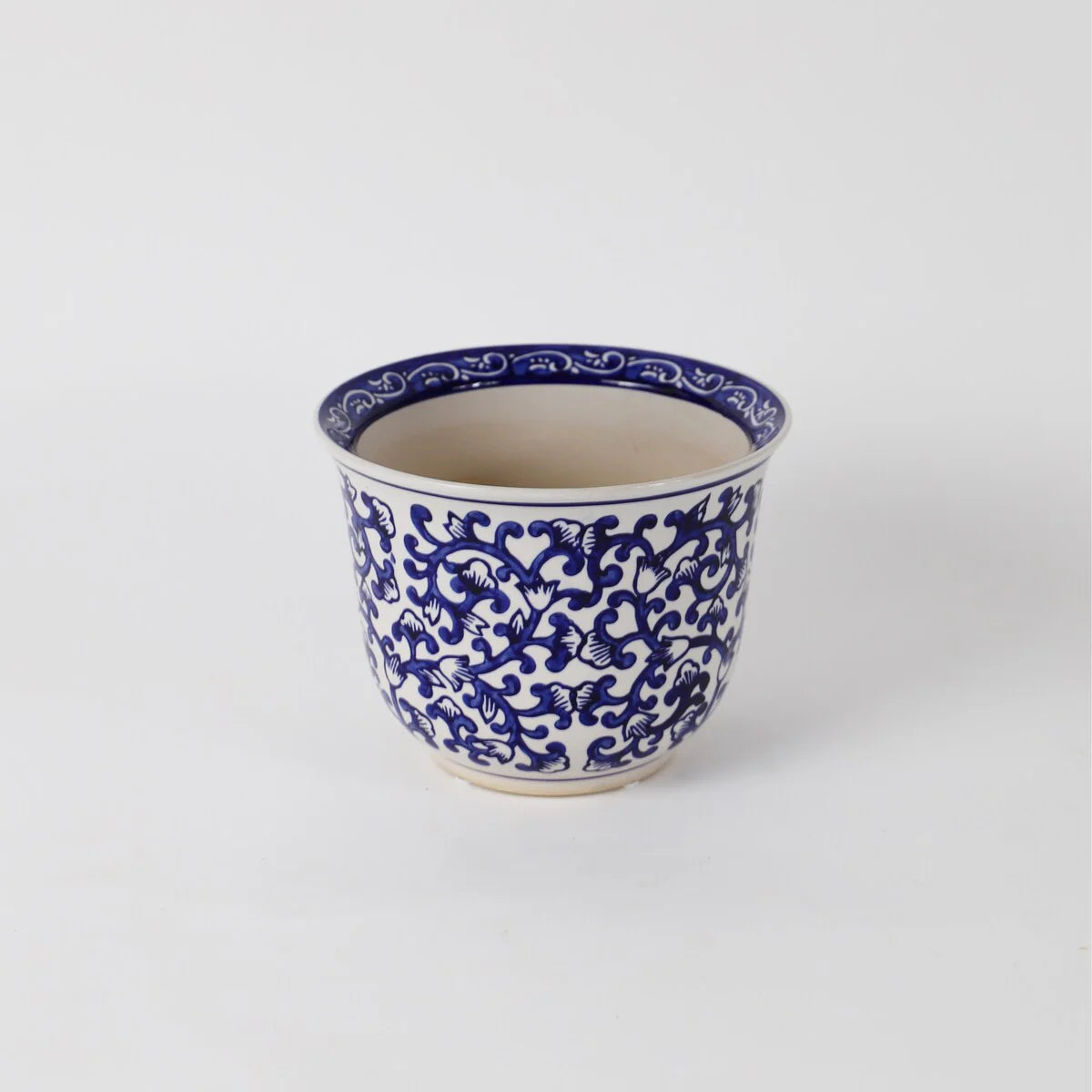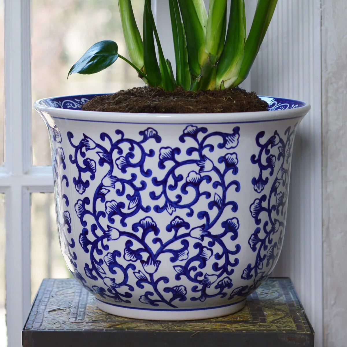 The meandering vine pattern of these inverted bell-shaped planters is reminiscent of the tapestries of the Florentine Renaissance. The blue-on-white design is a perennial favorite of decorating and looks chic in a wide variety of settings. The useful shapes and sizes are the ideal home to your indoor plants.