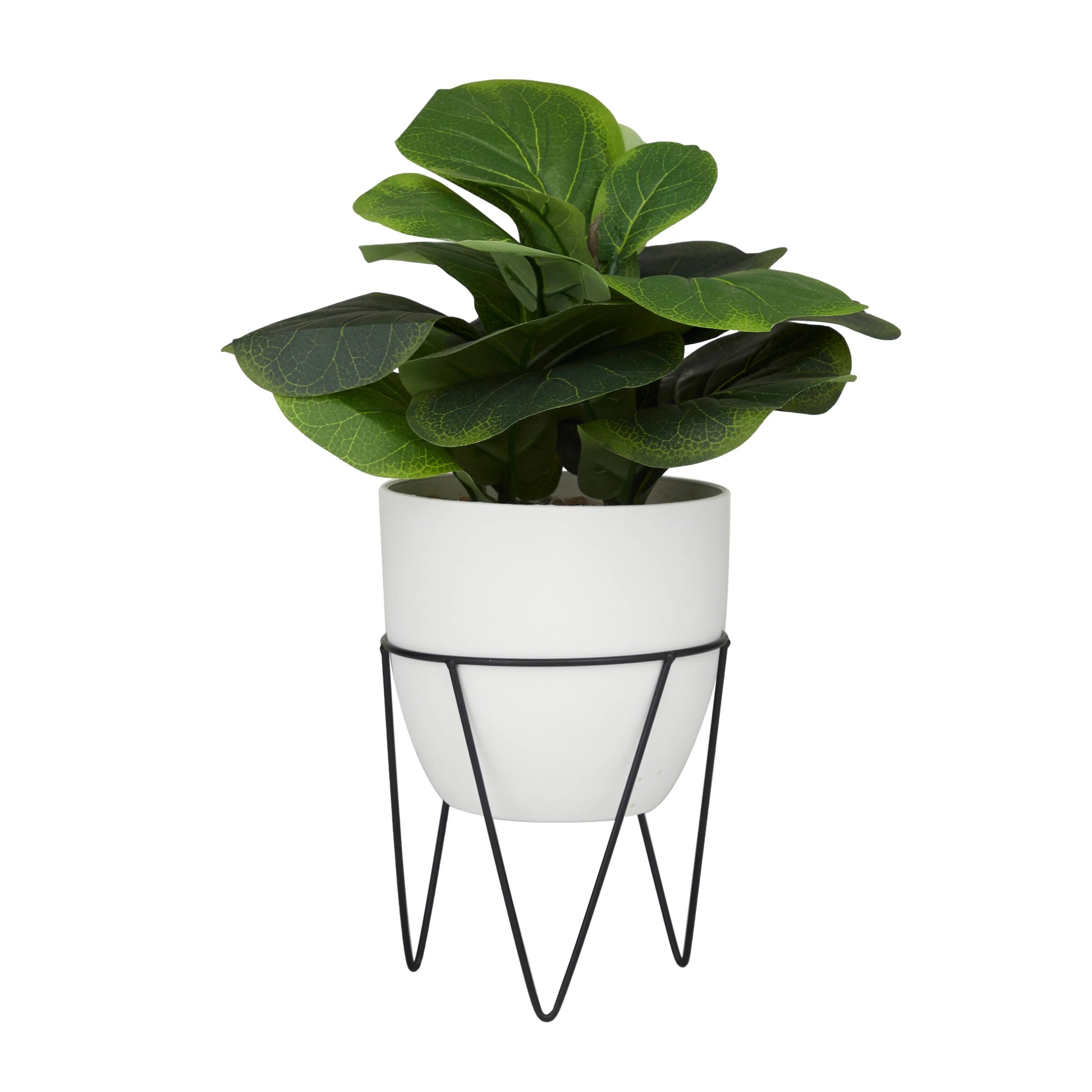 - A white metal planter with black plant highlights the lush green shade of this artificial indoor plant for a natural look