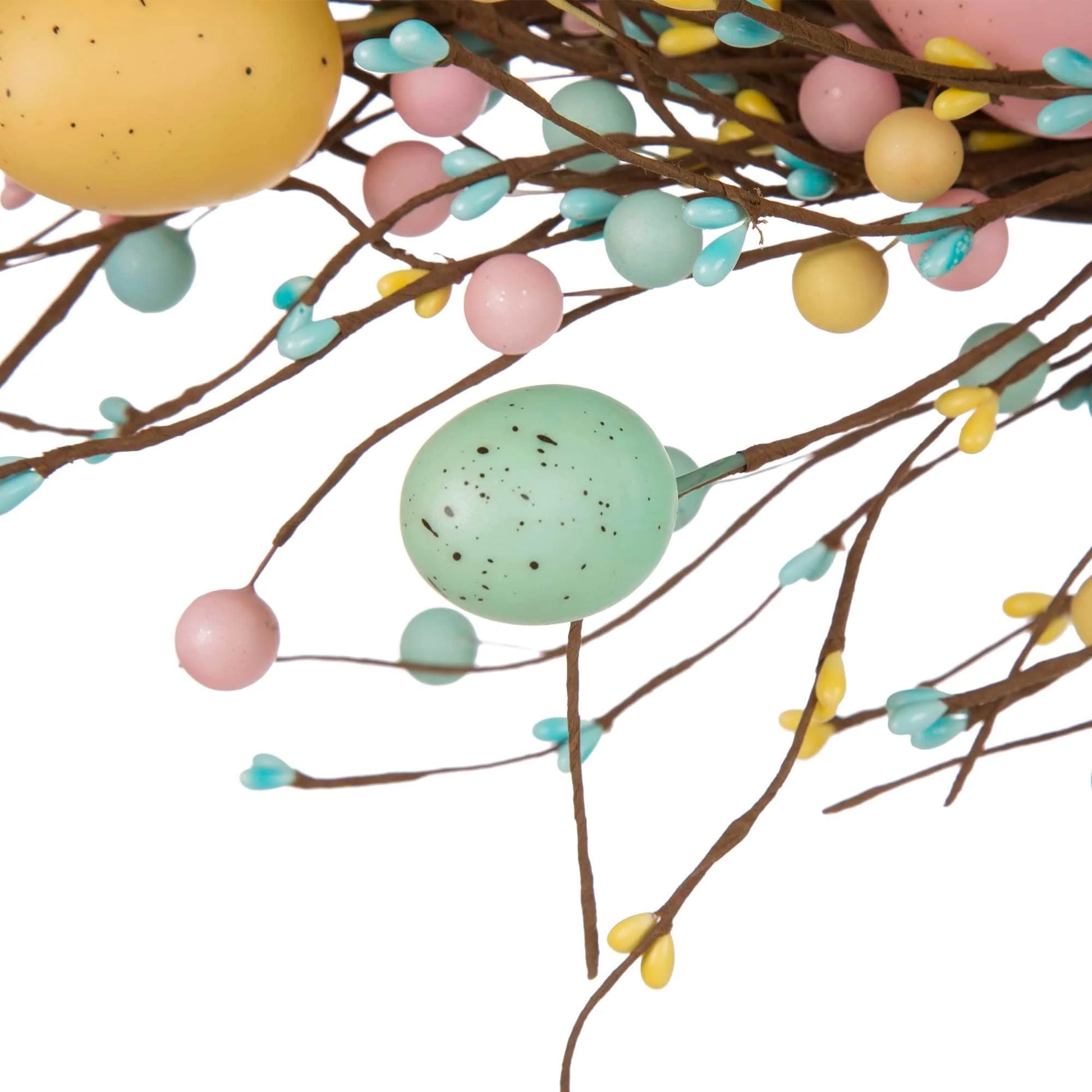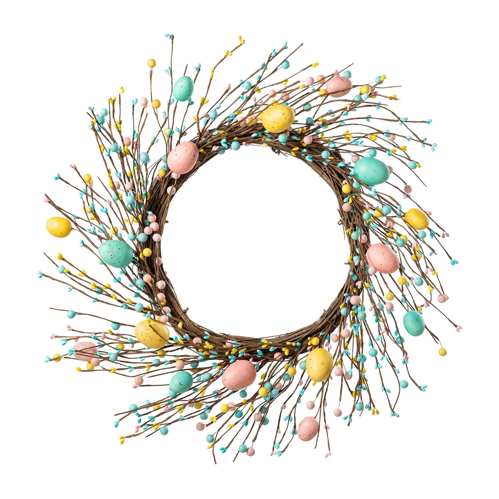 - The wreath includes multi-color berries and easter eggs in different size, mixed types of buds all on a natural twig base.