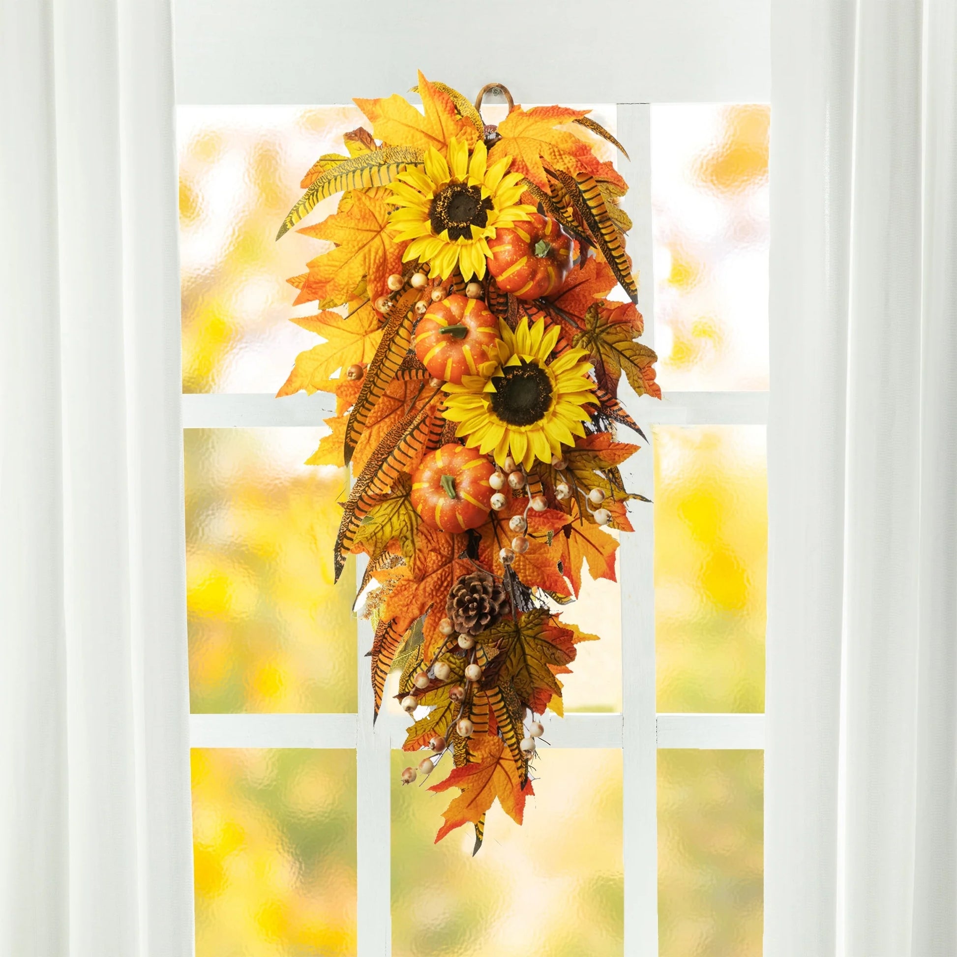 Decorate for the Fall with this gorgeous harvest teardrop swag. A beautiful mix of artificial fall colored maple leaves, sunflowers, pumpkins and feathers, all blended together on a real grapevine base to make a beautiful display above your mantle, on a wall or door.