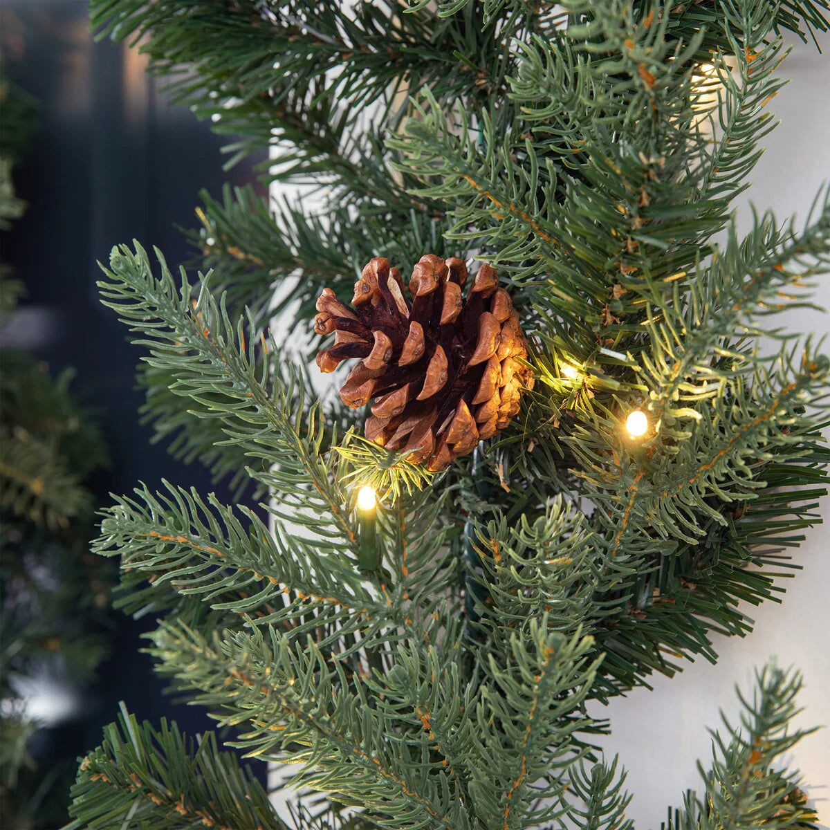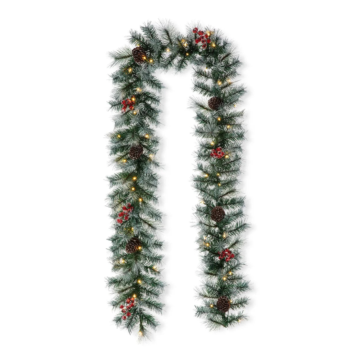 Add some holiday cheer to your home with Glitzhome's 9-foot Pre-Lit Christmas Garland. With 180 branch tips, including large pine cones and berry decorations, this versatile decoration can be easily adorned on doors, mantles, or banisters. The garland comes pre-lit with 50 Warm White LED lights and is battery-operated for indoor or covered outdoor use. The branches can be adjusted for an elegant look. Available in Glitter, Greenery, and Snow Flocked options.