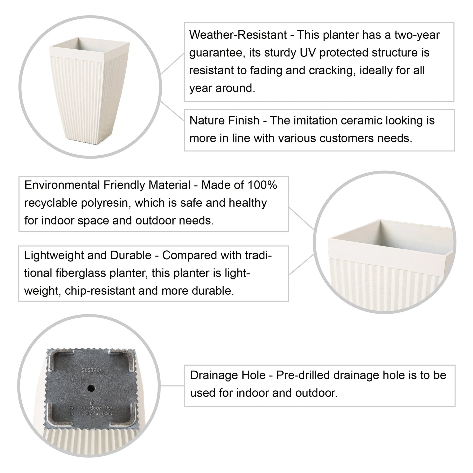 - Pre-drilled drainage hole is to be used for indoor or outdoor