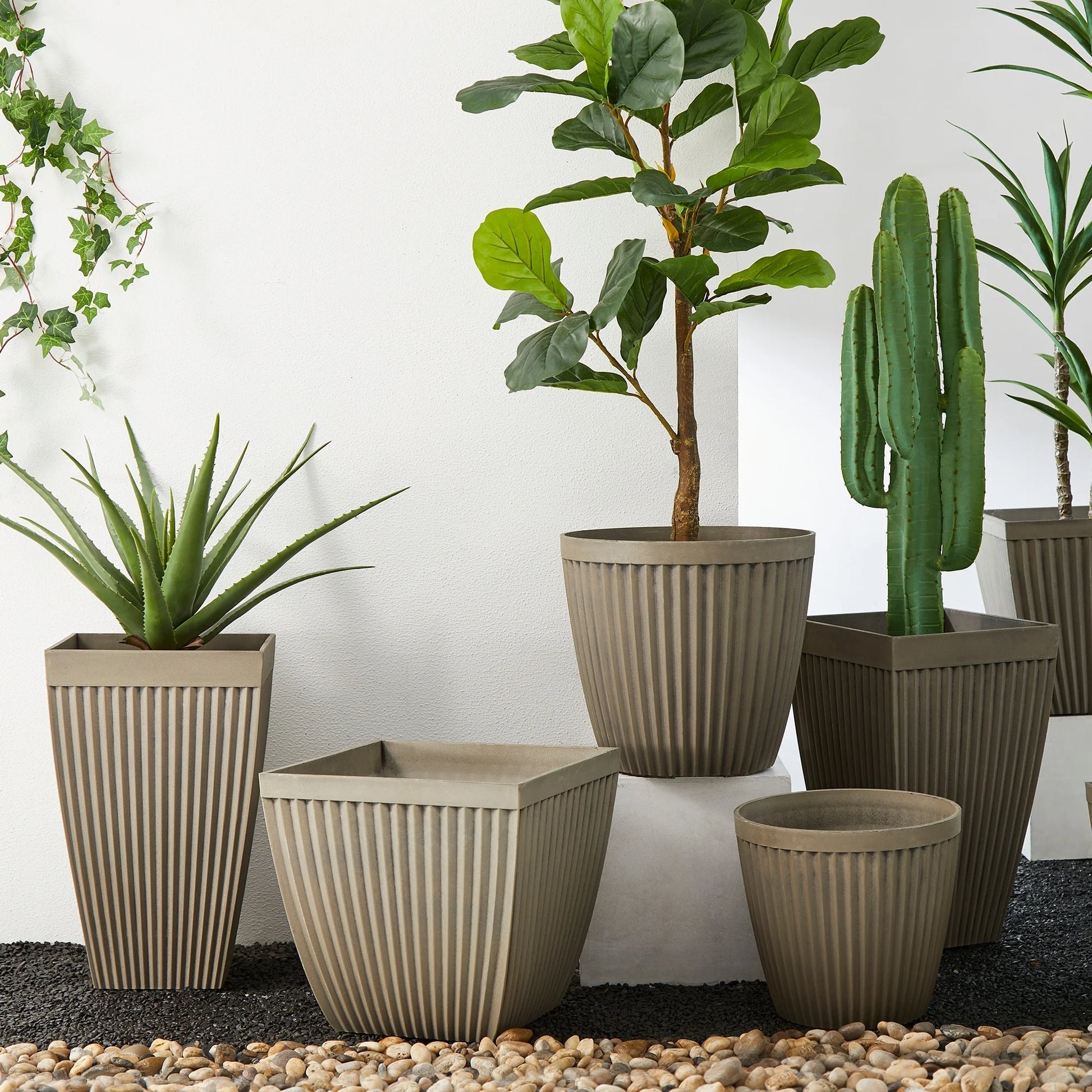 Enhancing your indoor or outdoor space with this stylish set of two plastic planters. Compared with traditional planters, it is lightweight, chip-resistant, more durable and with sturdy UV-protected structure, ideally for all year around. It featured an imitation look, the natural finish is more in line with various decoration styles. A pre-drilled drainage hole is included. Just planting your favorite greenery or blooms to creates an intriguing and vivid landscape that is sure to convert your garden, patio or home space to be a beautiful, delightful and relaxing environment.