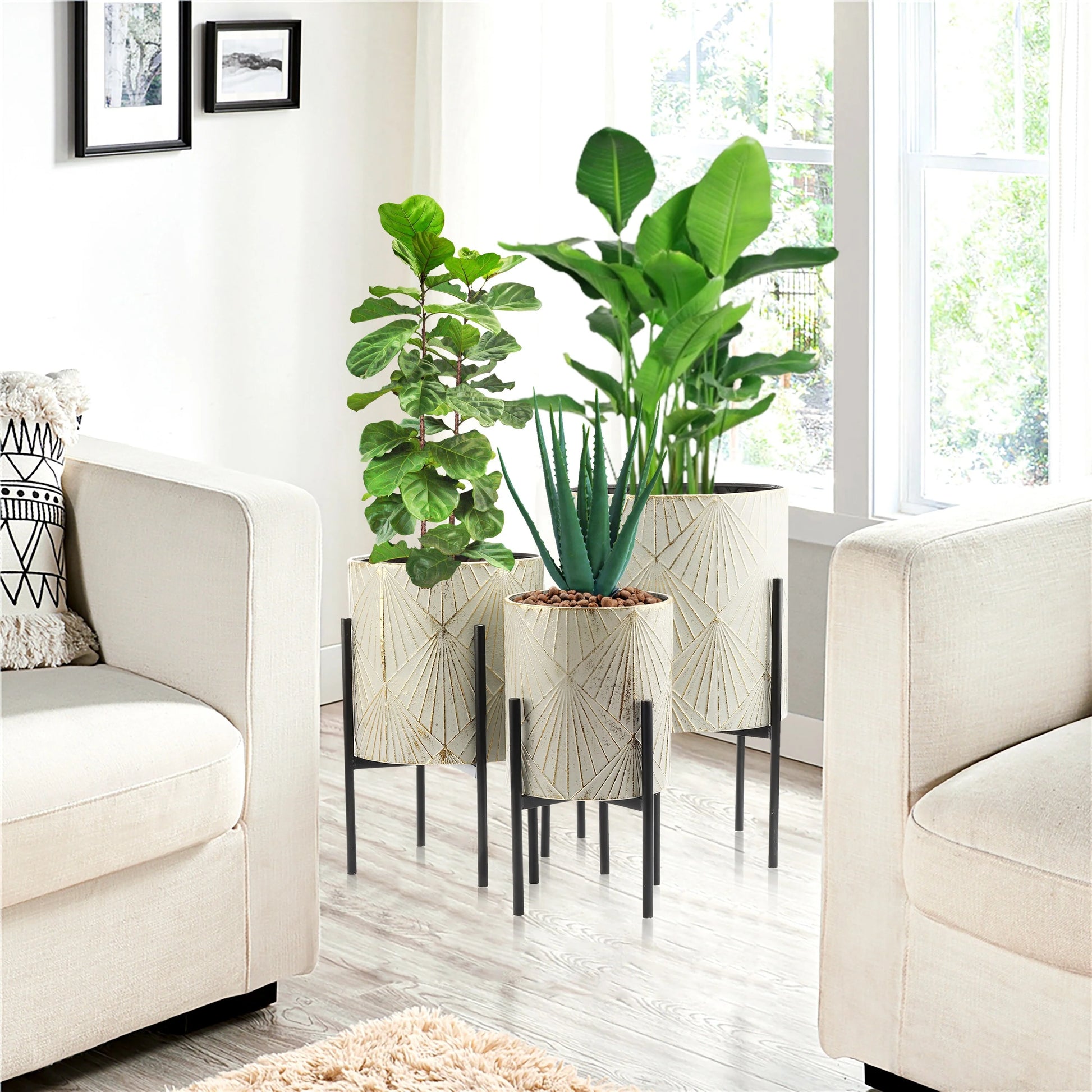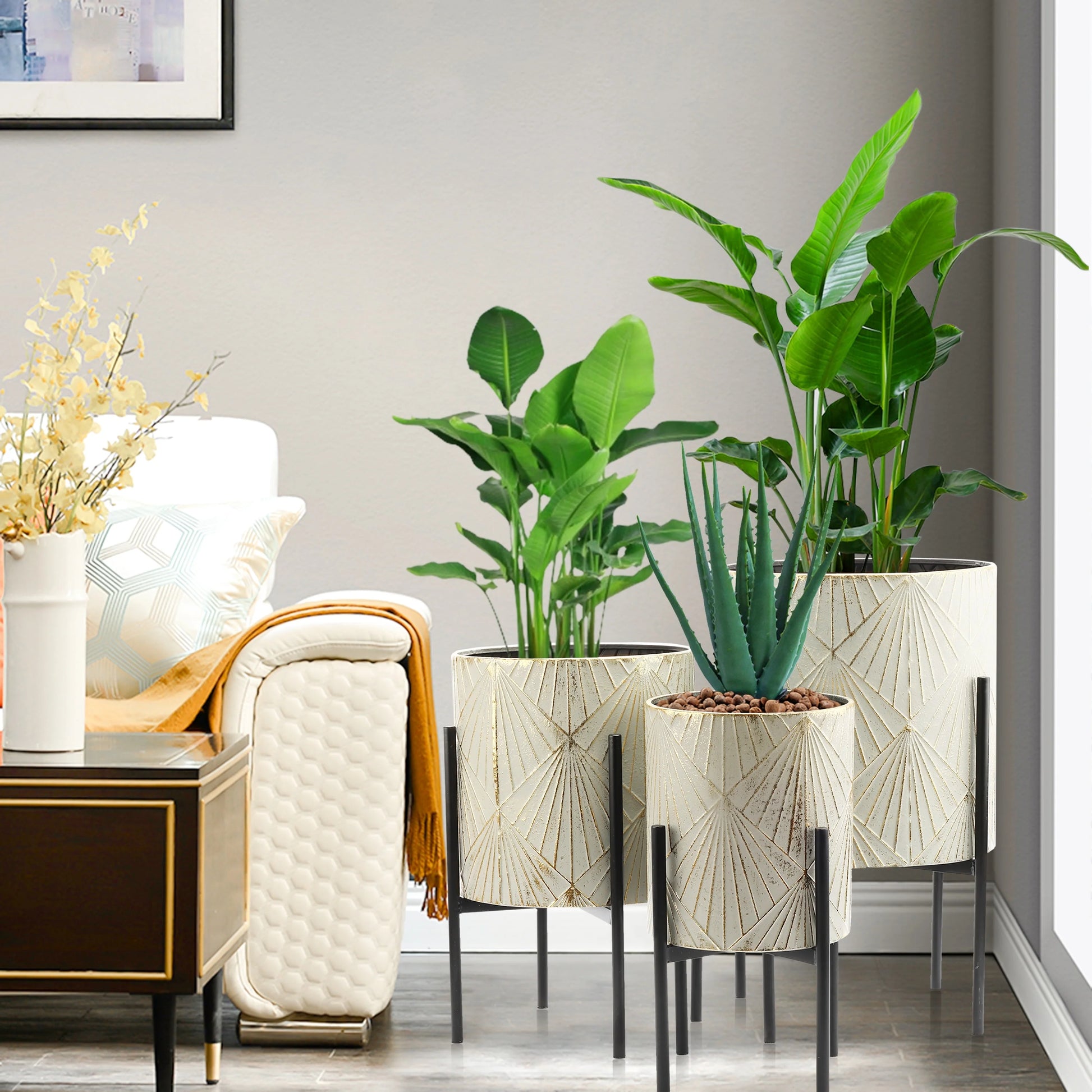 Grey and Gold Metal Cachepot Planters with Black Stand (Set of 3)