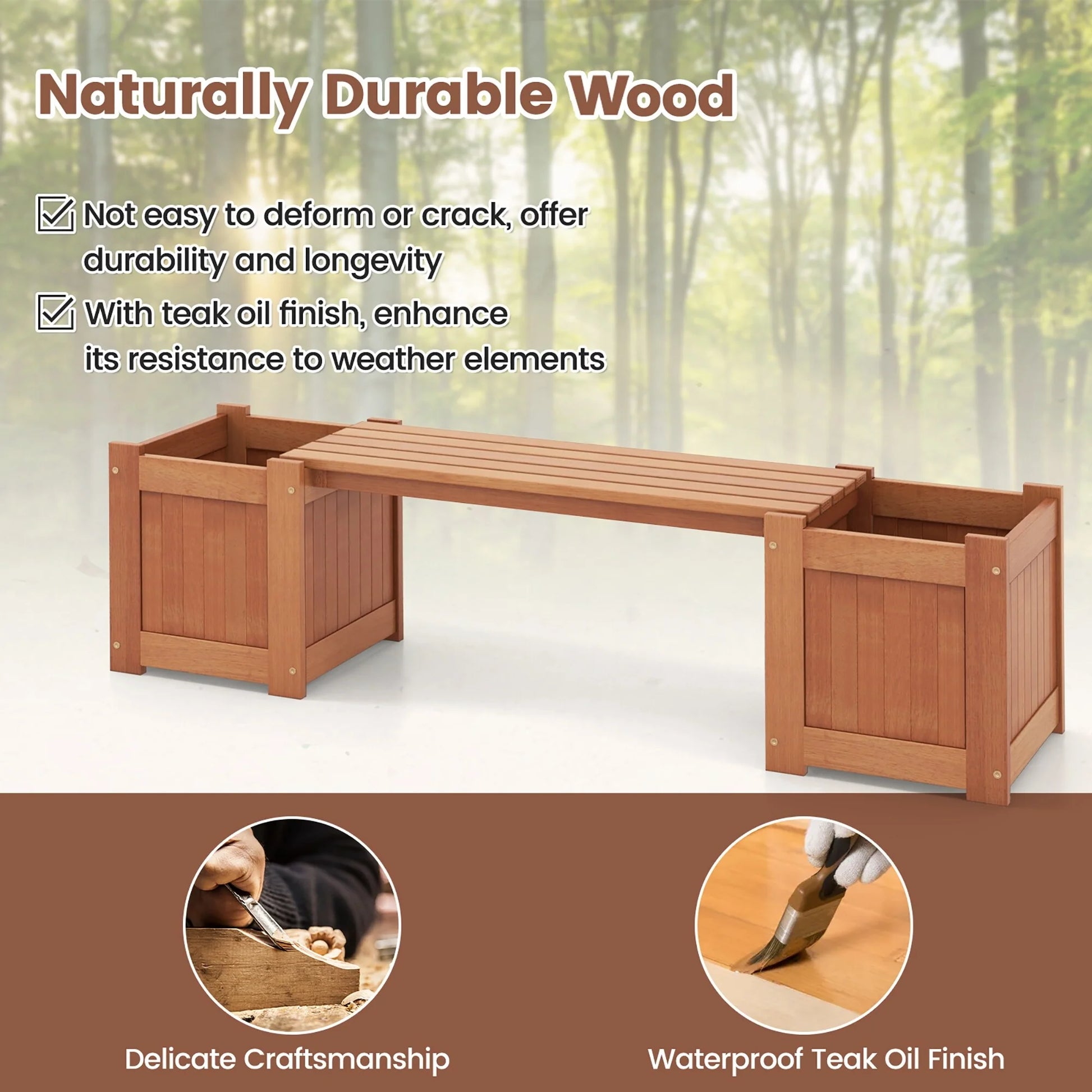 Add a Stylish & Functional Element to Your Garden!Our outdoor planter raised bed measures 68'' x 16'' x 18''(L x W x H) and comes with 2 mini planter boxes and a wooden bench, offering ample space for cultivating your favorite flowers, herbs, samplings, and potted plants or storing gardening tools, as well as a comfortable seating area. It is crafted of natural hardwood, ensuring longevity and resistance to wear and tear. And with teak oil finish, the planter boxes enhance its resistance to weather elements. Besides, it adopts an open-ended base, which is great for water drainage, soil conservation, and root development. The wooden planter boxes with bench can be easily detached into 3 parts.