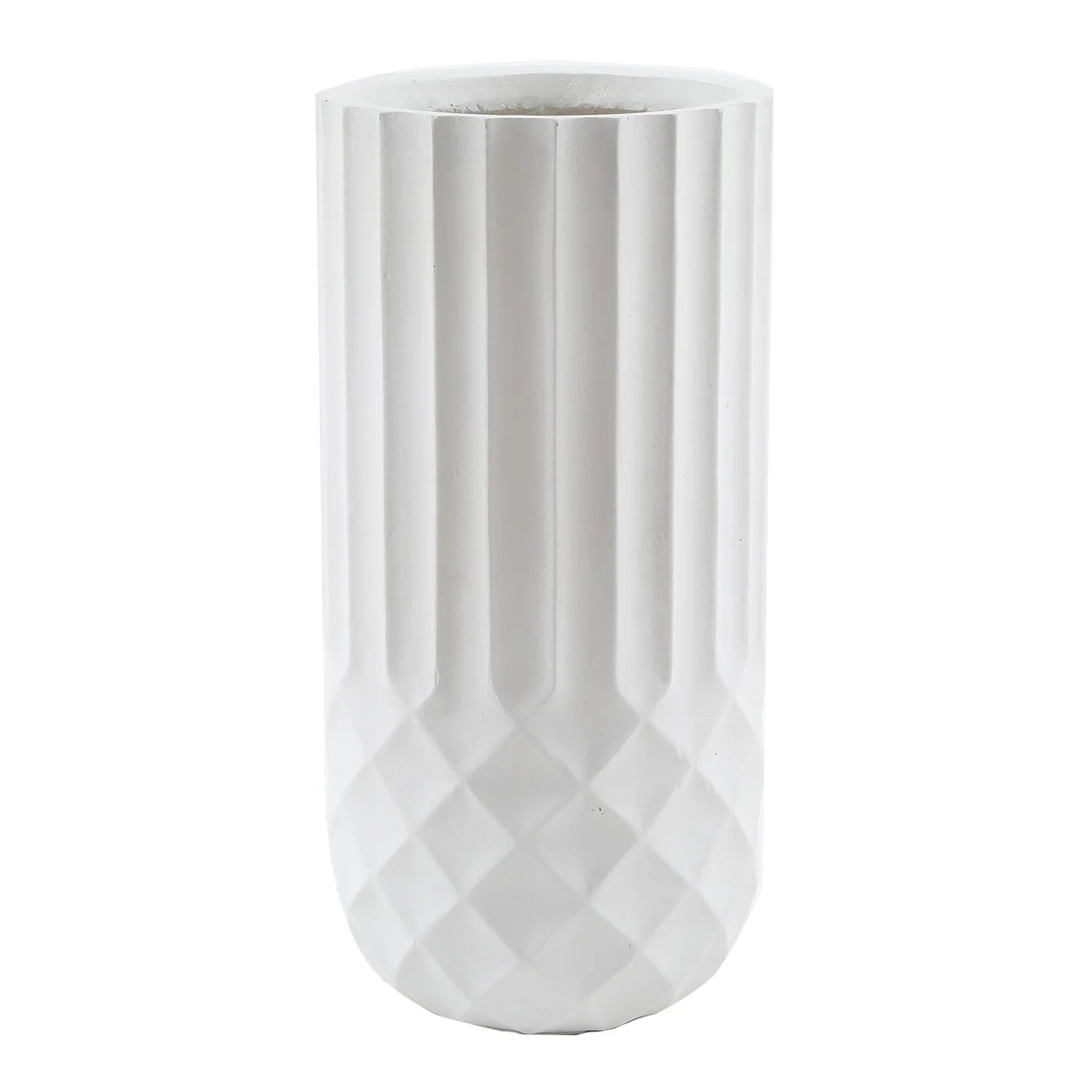 Add a stylish touch to your home or garden with this White MgO Tall Round Planter. The contemporary design features a two-pattern dimension that adds depth and uniqueness to the planter. The raised vertical lines at the top make the planter look taller, while the diamond pattern at the base is visually appealing. Made from magnesium oxide, this planter is durable and suitable for outdoor use. It includes a drainage hole and plug to prevent over-watering of plants. Enjoy the beauty of your plants indoors or outdoors with this weather and UV resistant planter.