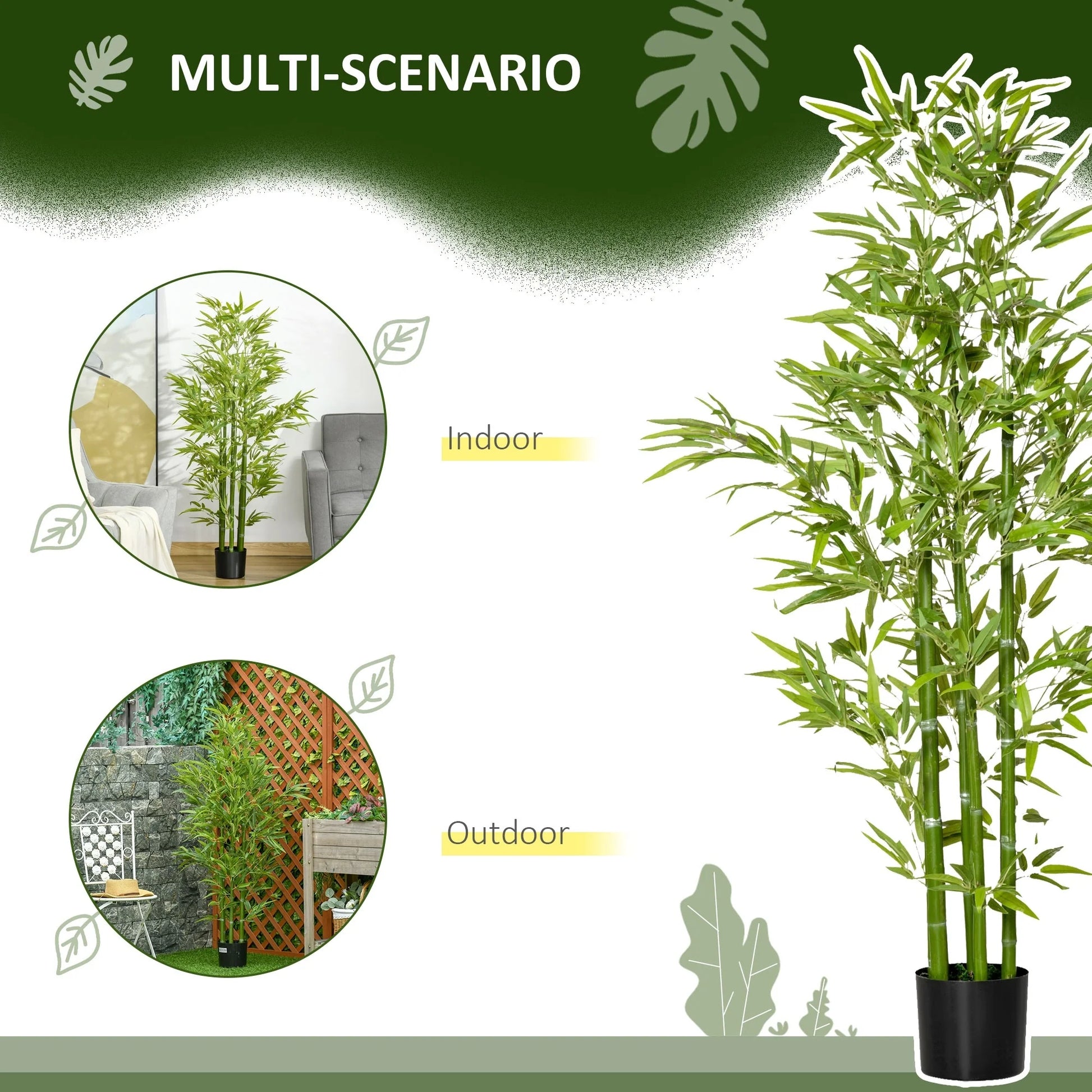 Want to grow green plants but can't keep them always green? Our artificial bamboo plant is exactly what you need, it will stay green for many years without trimming and shaping. No watering, no fertilization, no worries when traveling. Realistic looking leaves create a natural atmosphere for your room and low maintenance is needed. Comes pre-potted, it is delivered ready to use and goes well with any kind of décor, great for indoor and outdoor spaces.
