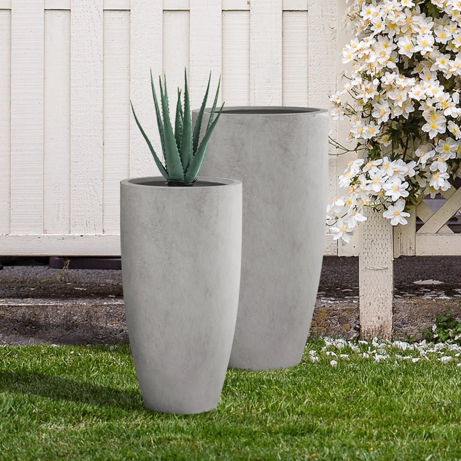 These elegant tall planters have authentic concrete finish with visible pores making them beautiful contemporary pieces. The look and feel is true concrete but it weighs substantially less than it looks and makes it easier to move around. It is smooth instead of rough concrete potters you might be used to and will help you maintain a modern design throughout your space. The size is very generous and can hold a good amount of plants without looking crowded. Would look great on apartment balcony or large backyard patio. You can't go wrong with the grey finish as it blends well with any décor. They can be used individually, as a set or in a row to promote unity. Made of lightweight concrete and weather-resistant fiberglass through an ecofriendly manufacturing process. It has all the advantages of concrete such as strength, durability, weather & damage resistance, strong UV resistant ability and stay well in wind, rain, hot and cold season.