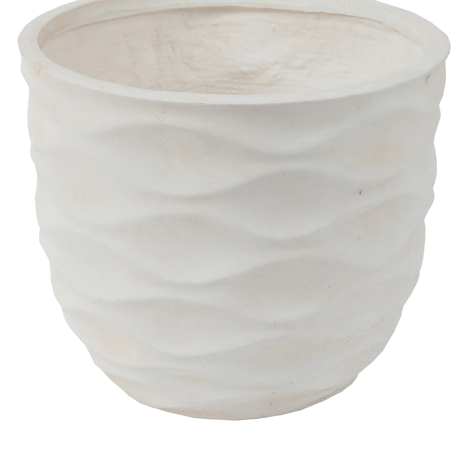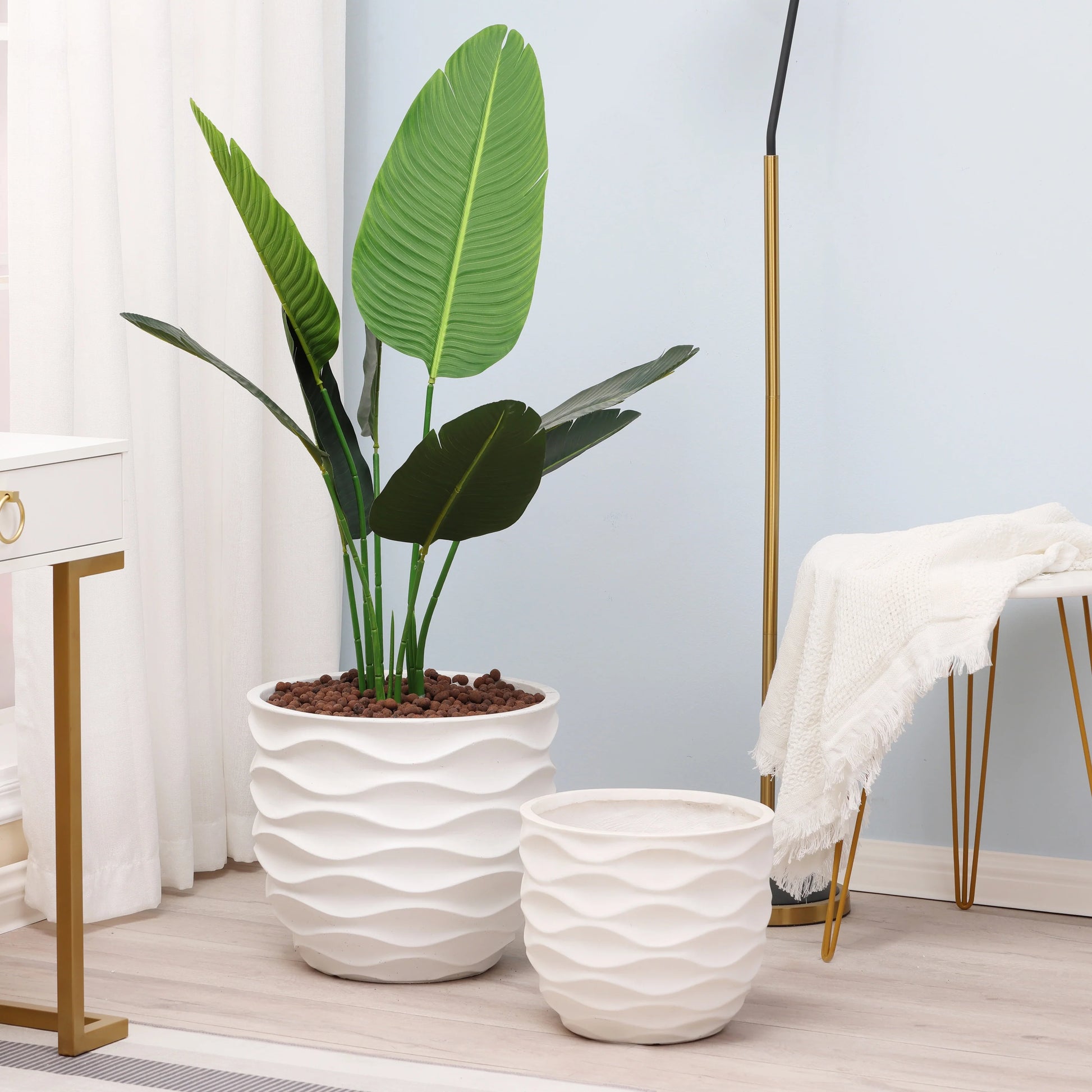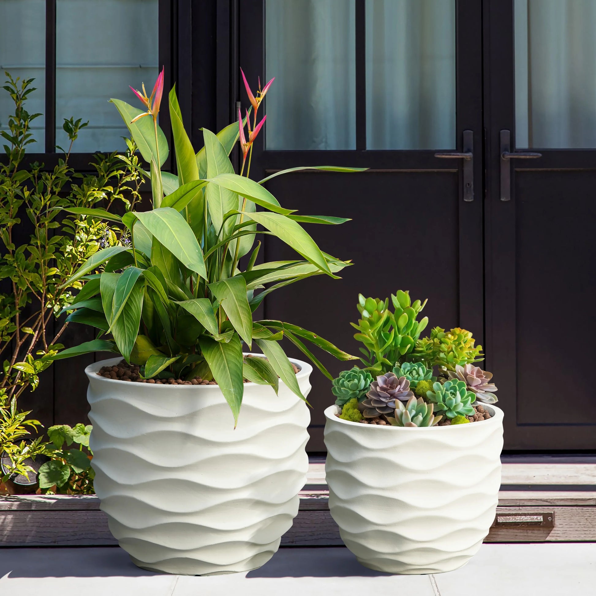 Get ready to grow with this set of two beautiful white planters. The set features a horizontal waves design that provides texture and dimension to contemporary-style planters. The planters are made of magnesium oxide that works well outdoors and indoors. Your plants will shine against the lovely white finish of the planter set. The set includes a small and large planter. Both planters have a drainage hole and drainage plug. These planters will look stunning in your entryway, porch, and deck.