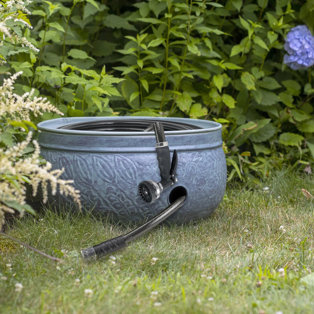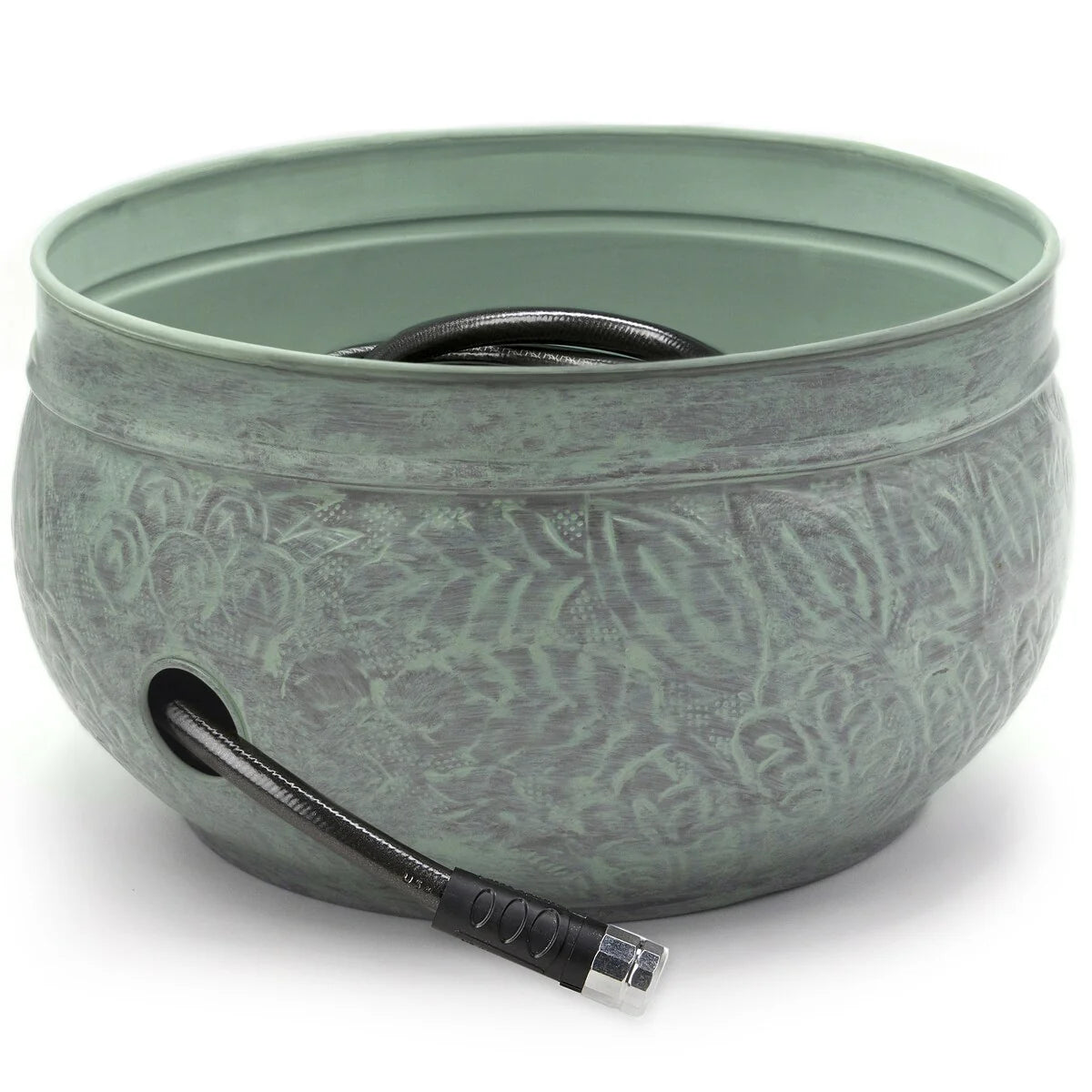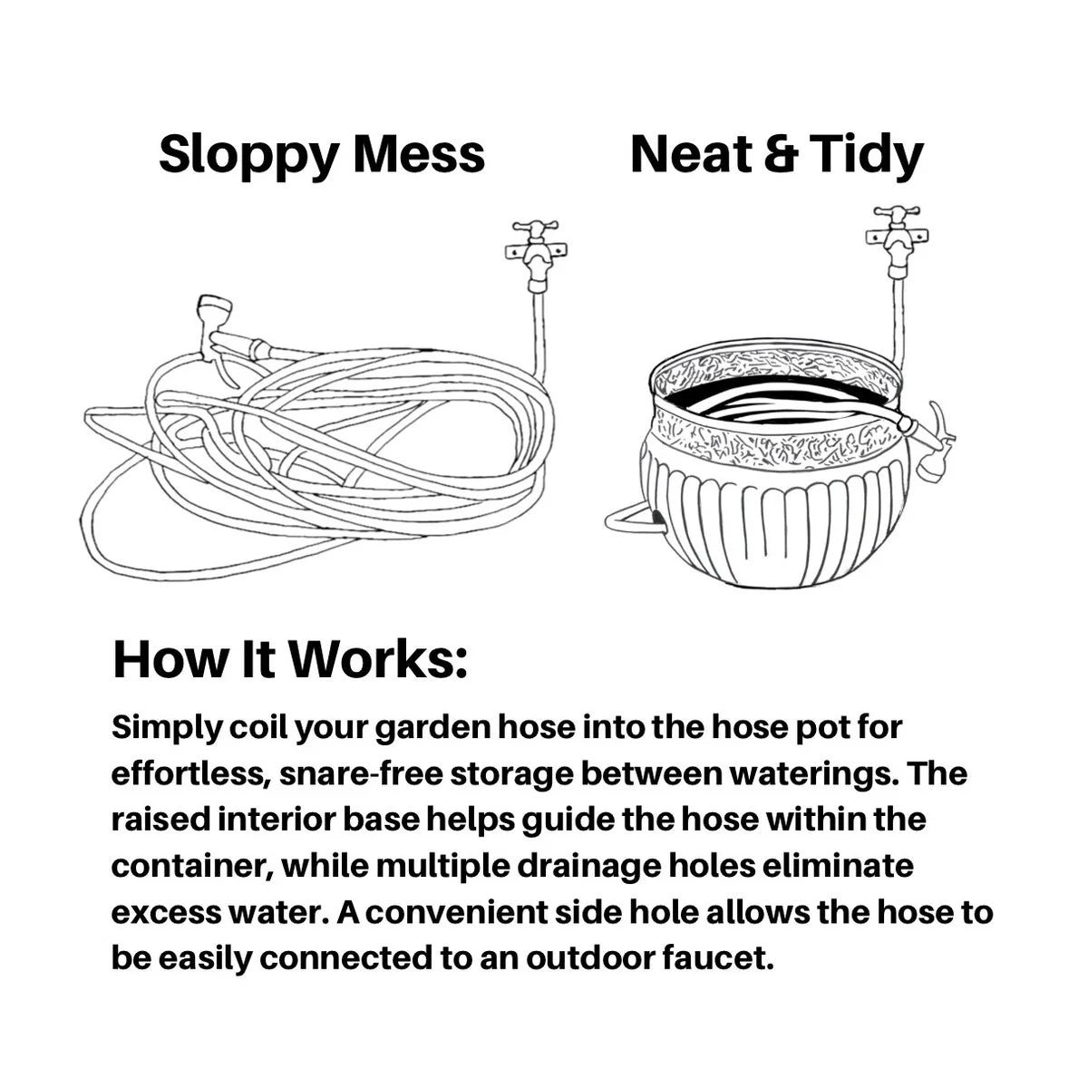 Posh, yet practical, these attractive hose pots enrich the yard and garden with their style and charm. A handsome hiding spot for up to 100 feet of unruly garden hose, each pot is handmade using Old World techniques with modern innovation to create an attractive and practical outdoor accent. A raised interior base helps guide the hose within the container, while multiple drainage holes eliminate excess water. An ample side hole allows the hose to be easily connected to an outdoor faucet. These versatile containers can also be used as graceful planters, firewood containers, or impressive drink buckets sure to strike up conversation.