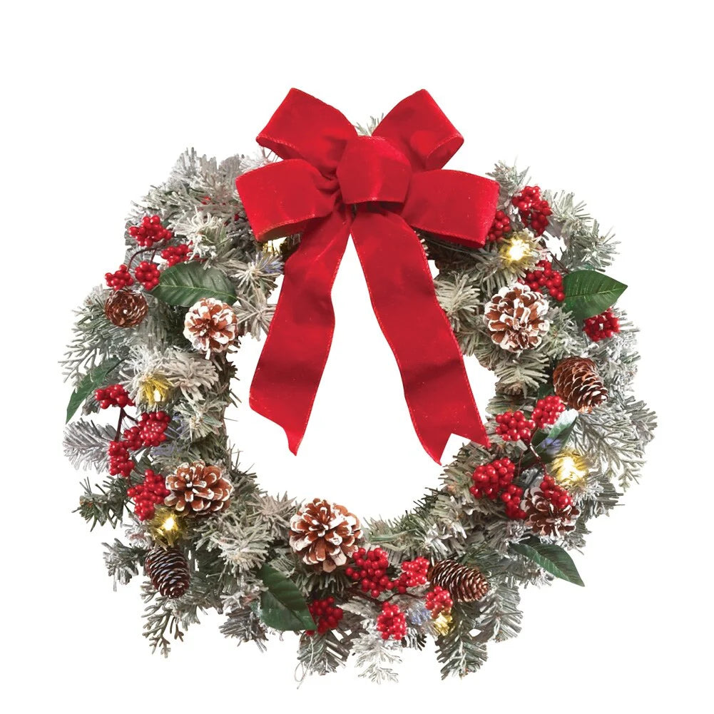 Bring nature's winter beauty indoors for an impressive holiday display. Lush pine boughs are dipped in "snow" and decorated with red berries and pinecones. The wreath features a large red bow on top and req. 3 AAA batteries (sold separately). It sparkles with LED lights. Polyester, plastic, pinecones. Wreath (18" Dia.).