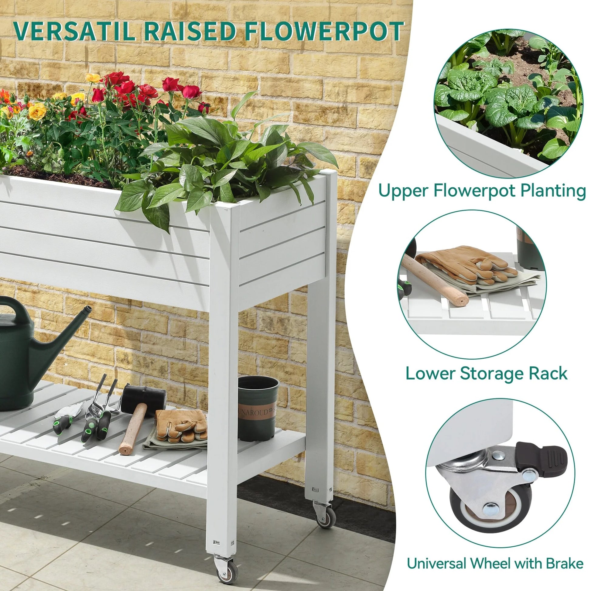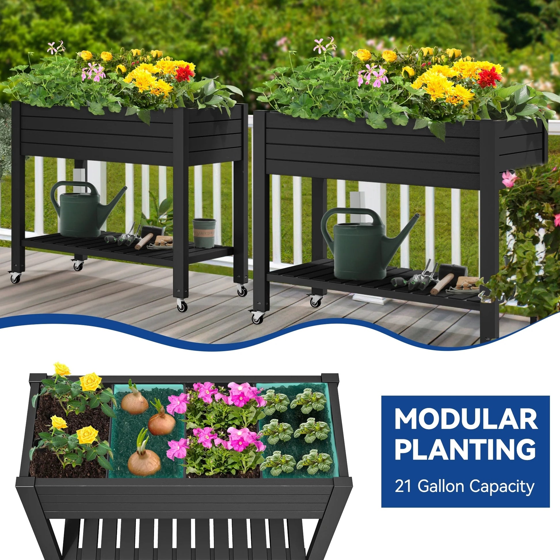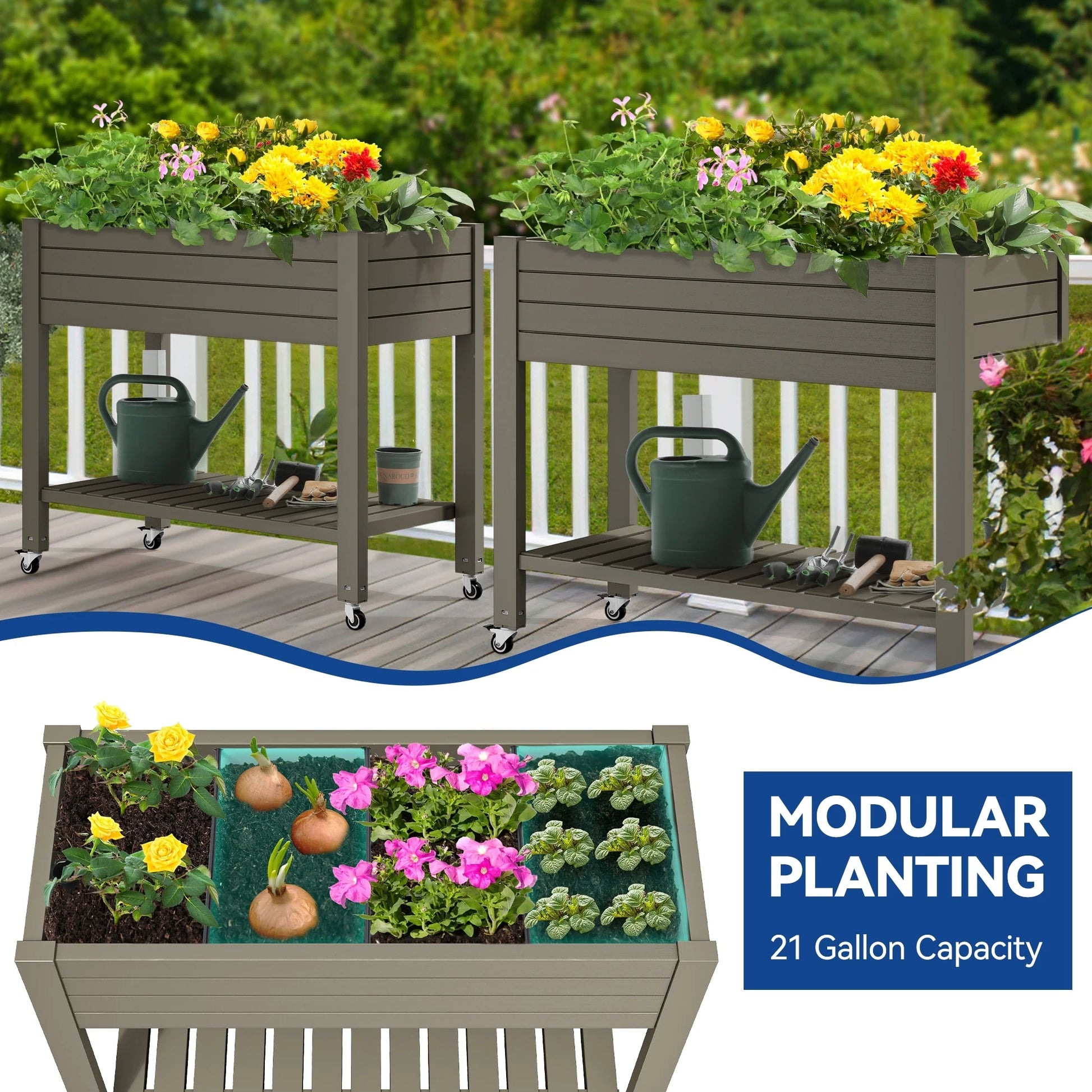 This elevated raised garden bed has 4 universal wheels, 2 of which are equipped with brakes to increase stability and mobility. The bottom shelf provides sufficient storage space for tools and flowerpots, 3 rubber strips can make 4 grids to plant different vegetables or herbs.