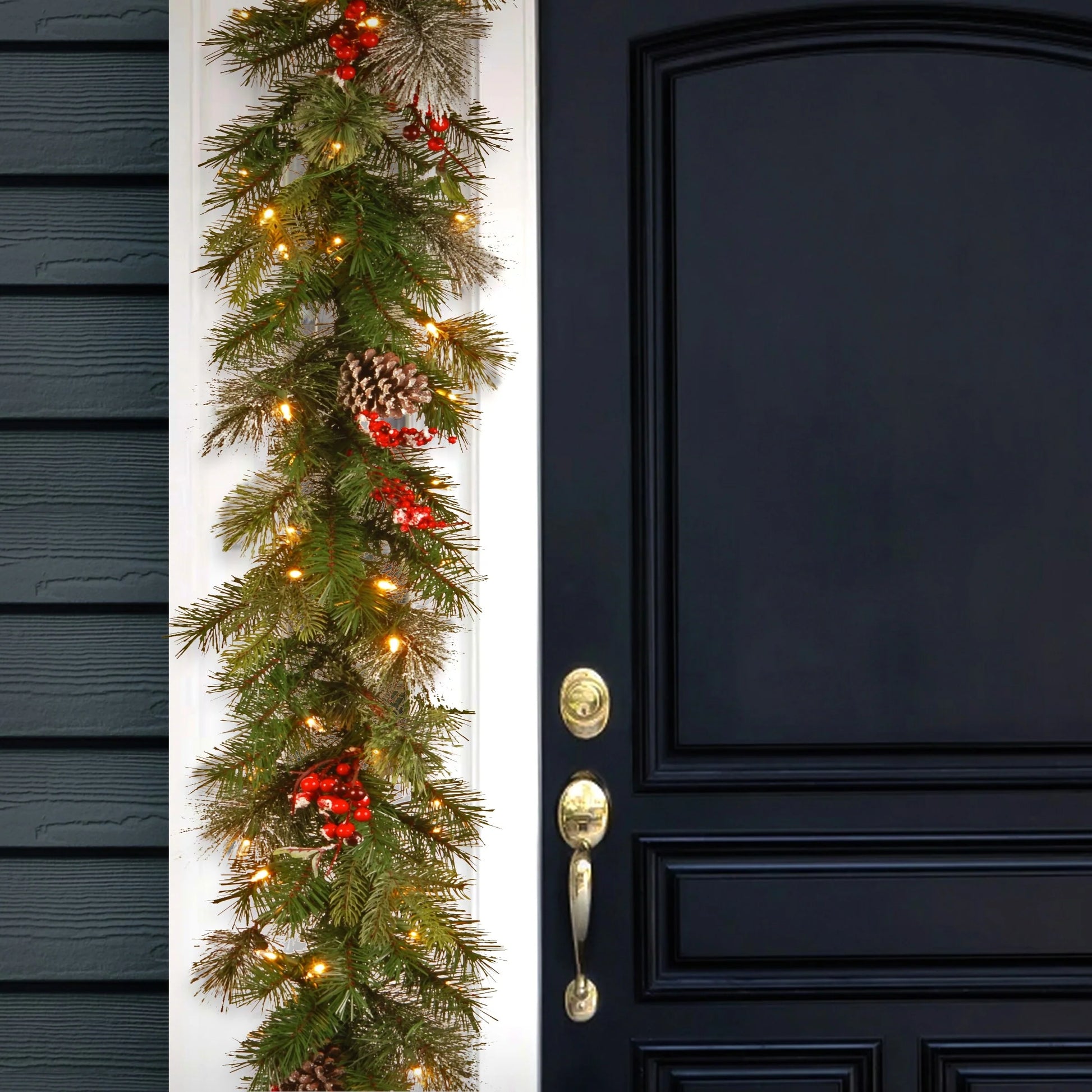 This Wintry Berry garland features Feel Real® branch tip technology, creating a decoration with remarkable realism. The branches area a snow-sprinkled mix of evergreen and bristle branches trimmed with clusters of red berries and assorted pinecones. It is pre-strung with 70 clear lights that remain lit even if a bulb burns out. This indoor/outdoor garland can be displayed over doors, windows, fireplace mantels, fence, or stairway railings.