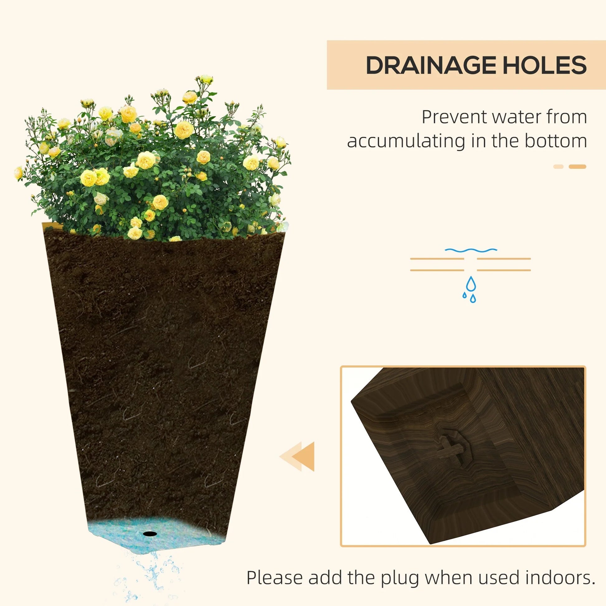 Descriptions:Landscaping is easy with the right supplies by your side. Outsunny's outdoor planter set gives the depth you need to grow long roots without taking up extra room when it's time to store for the season. Grow flowers, herbs, shrubs, ferns, or a ficus. Our tall planter set is self-draining, so water logging won't be a worry. They're stackable to keep compact when not in use. Featuring a modern shape with a wood grain look, their material doesn't saturate to endure the outdoors season after season.