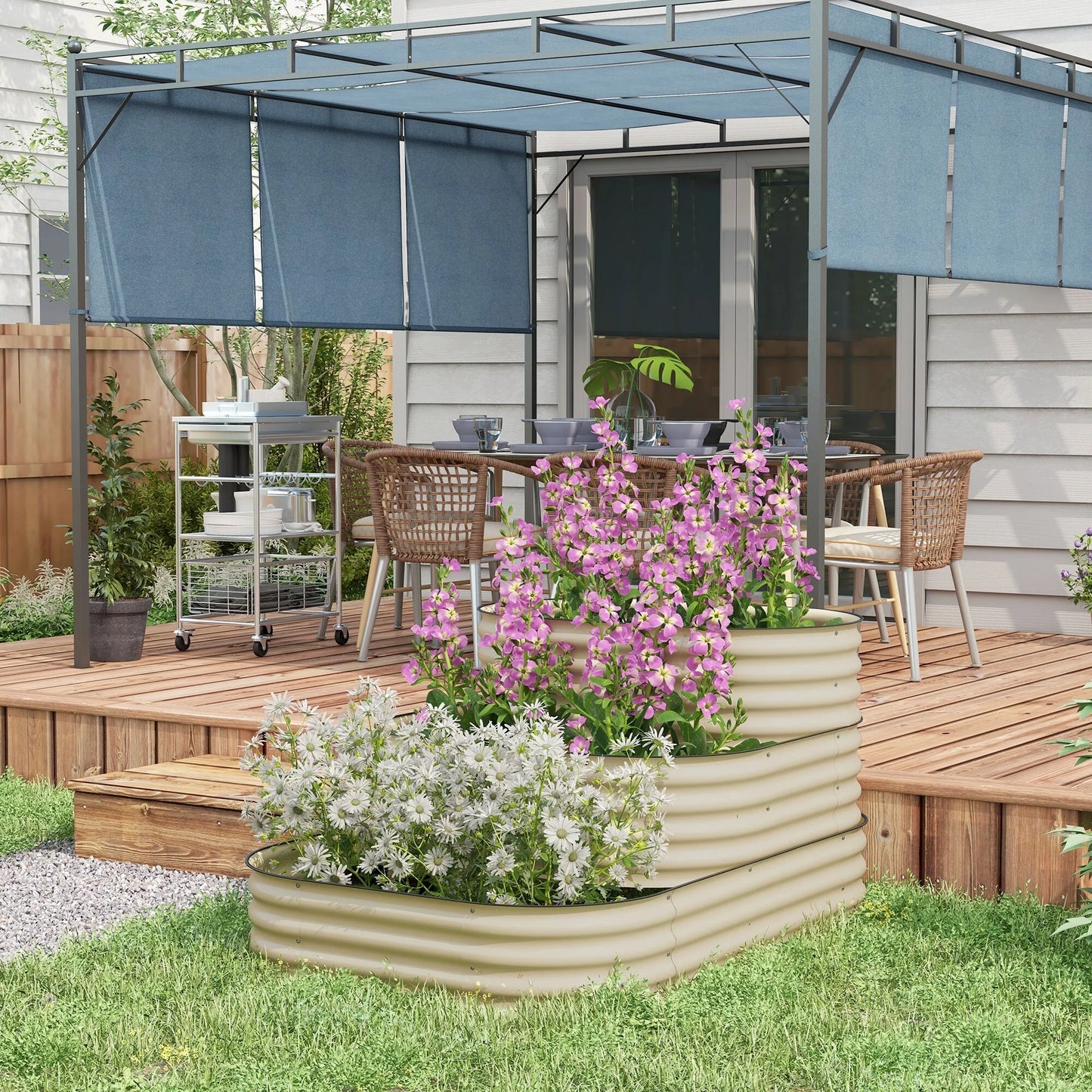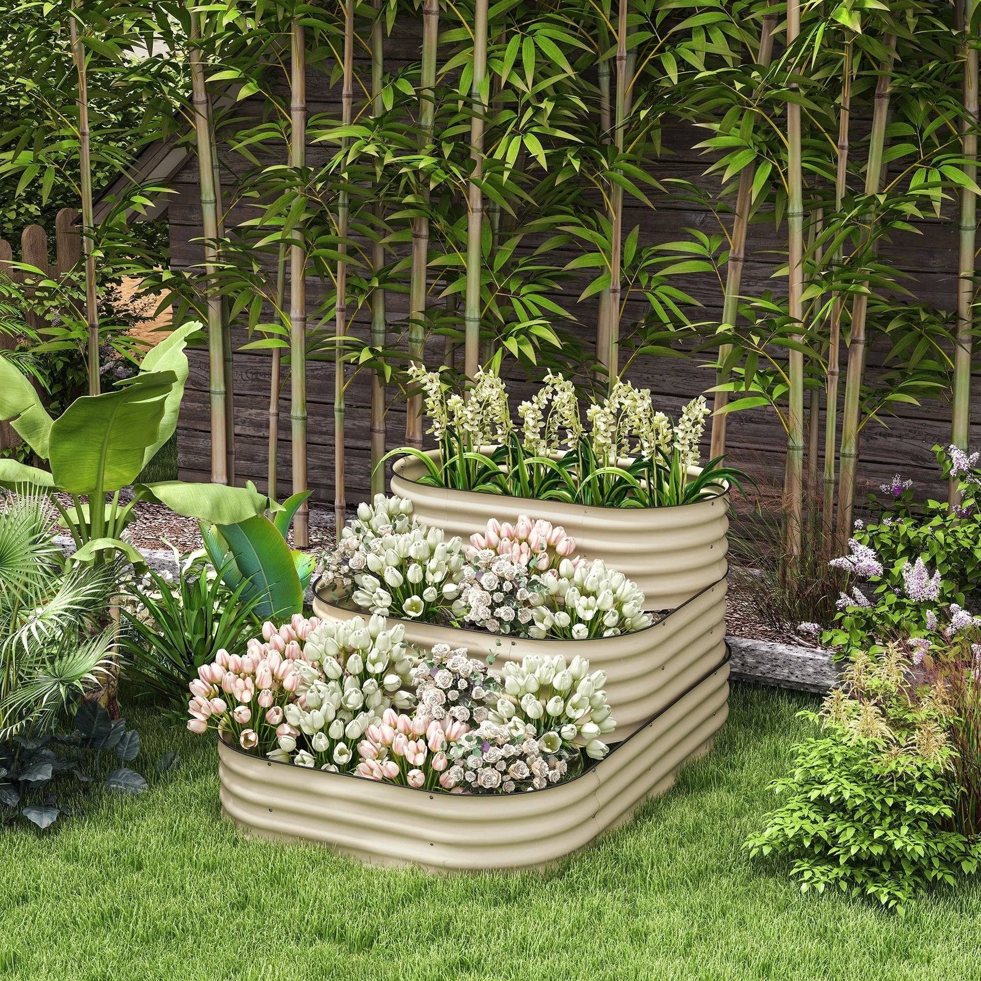 Descriptions:Outsunny is here to help raise your green thumb. Bring style and separation to your garden using this 3-tier metal raised garden bed. Keep herbs, flowers, and vegetables in compartments. Accommodate each plant by root length. The extra-deep build and open bottom of our raised garden bed set allow you to grow long root vegetables without worrying about water build-up. Keep your garden organized. Raise your green thumb with Outsunny stair-step garden beds.