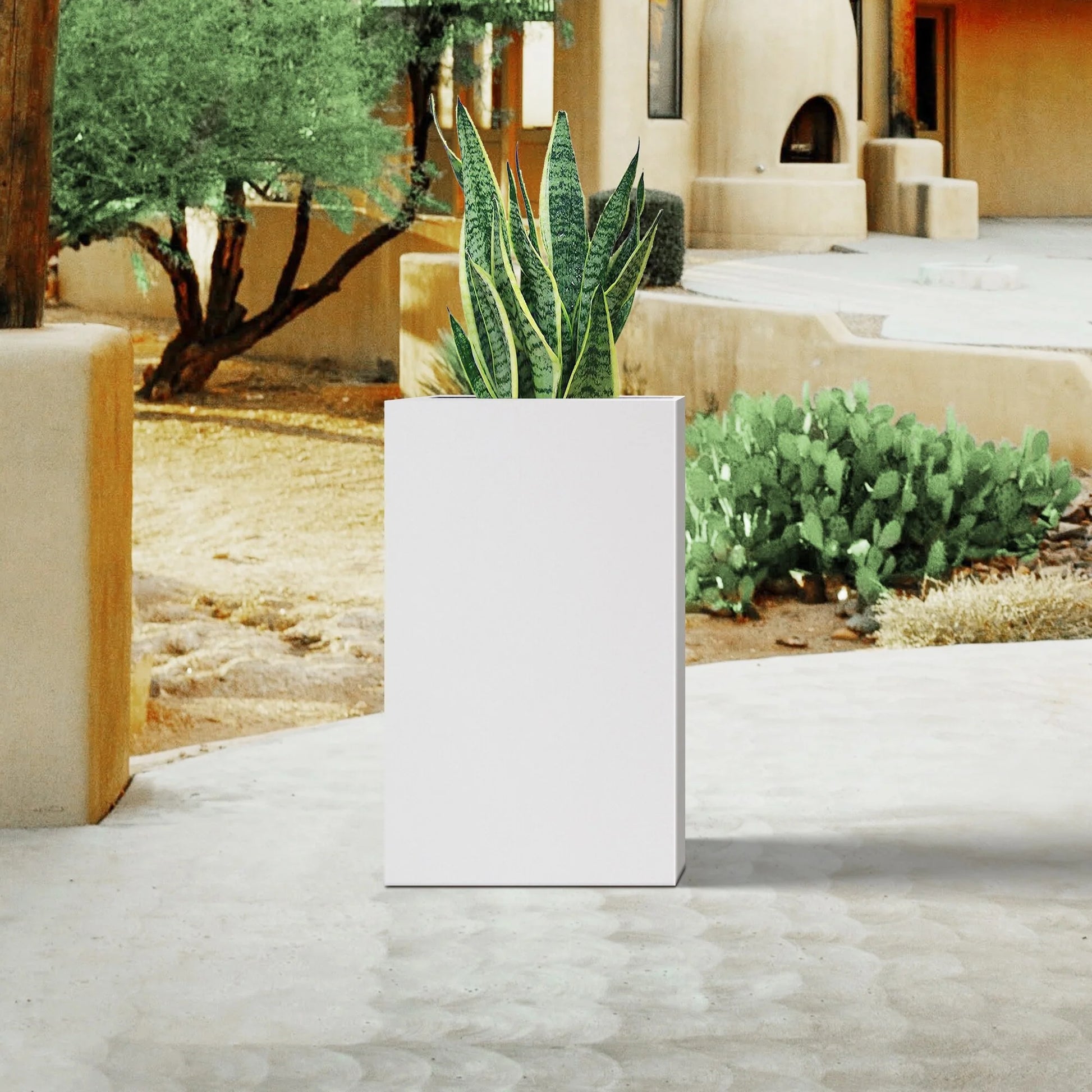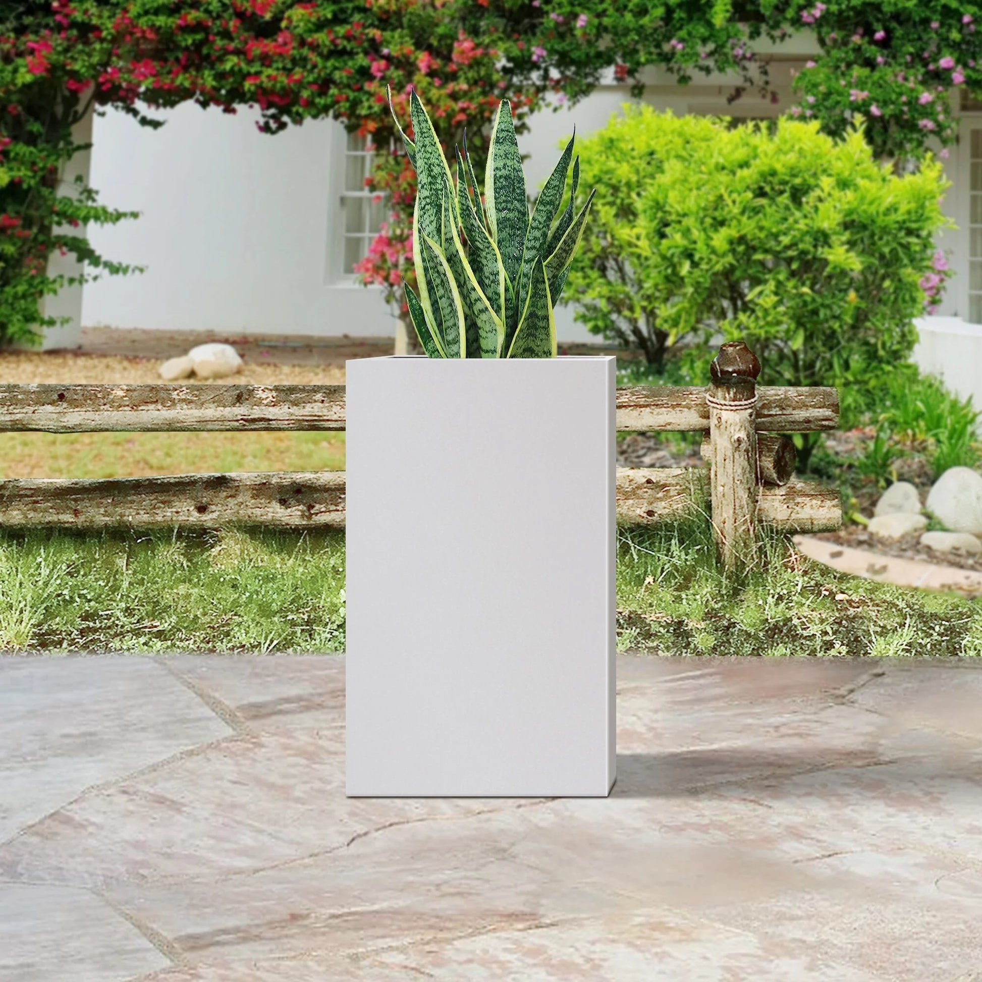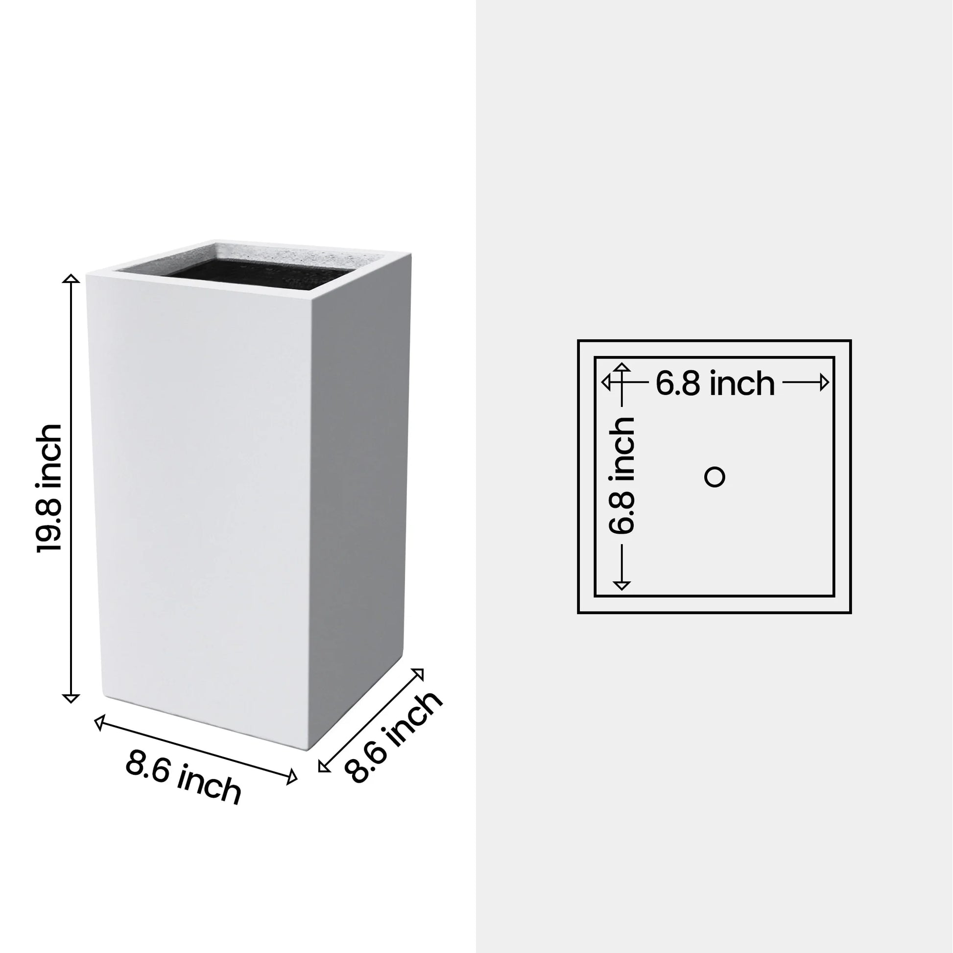 Our contemporary planter pots with an concrete finish with visible pores will add an elegant touch to your décor and it is ideal for endless succulent designs. The smooth lines and square shape of these planters will help you maintain a sleek look throughout your space, while holding a good amount of plants without looking crowded :This planter is handmade, crafted of lightweight concrete through an manufacturing process,and built in drainage hole create a healthy living environment for your plants. Spacious with deep pot space to suit: fiddle leaf fig tree, plant, spider plant, aloe vera, money tree, pothos, artificial tree etc.Engage a modern minimalist style to match home decors and to display your plants.Adorn your outdoor and indoor areas: home, garden, office, porch, patio etc. This material has strong UV resistant ability and stay well in wind, rain, hot and cold season. By adding fiber clay material, planter is much easier to move around due to its lighter weight.You can use it indoors and outdoors freely.MODERN CONCRETE PLANTER - This modern square planters were handmade with an pure white concrete finish with visible pores will add an elegant touch to your décor and to display your plants.Size: 8.7"L x 8.7"W x 19.7"H.LIGHTWEIGHT - Made of concrete and weather-resistant fiberglass that is light so you can lift it easily.STURDY & DURABLE - This planter advantages were strength, durability, weather and damage resistance,long-lasting color,and a strong UV resistant ability that stays well in wind, rain, hot and cold season.DRAIN HOLE - This large planter comes with drainage hole, to create a healthy living environment for your indoor and outdoor plants. The water reservoir at the base ensures that your plants and flowers always receive the correct amount of water without the worry of over watering. Your fiddle leaf fig tree, plant, spider plant, aloe vera, money tree, pothos, artificial tree etc will thrive in this large flower pot. A saucer is needed for indoor use (NOT INCLUDED). PERFECT BOTH FOR INDOORS & OUTDOORS - This planter is handmade and great for decorate your outdoor and indoor areas:office,home,garden, porch, patio, deck, balcony, living room, study room, kitchen etc.